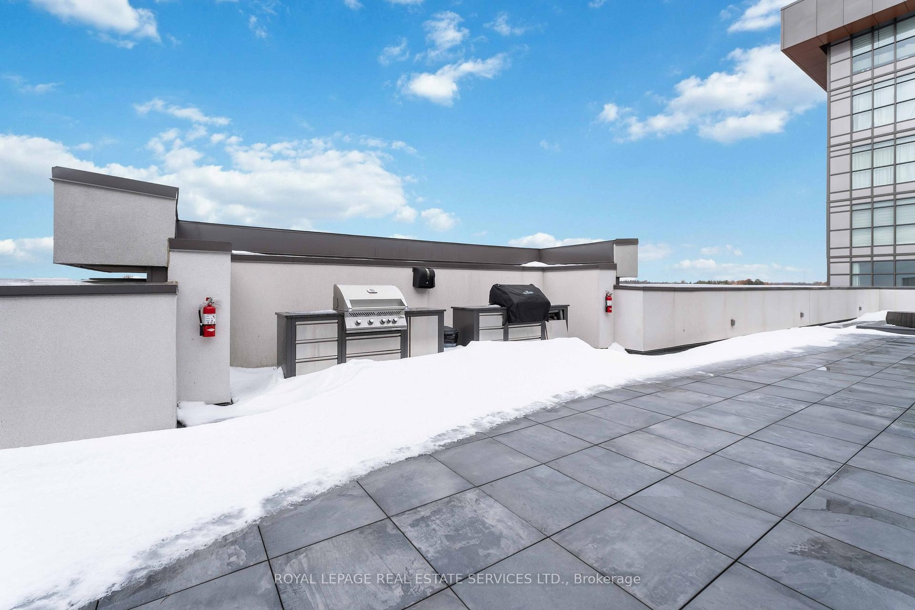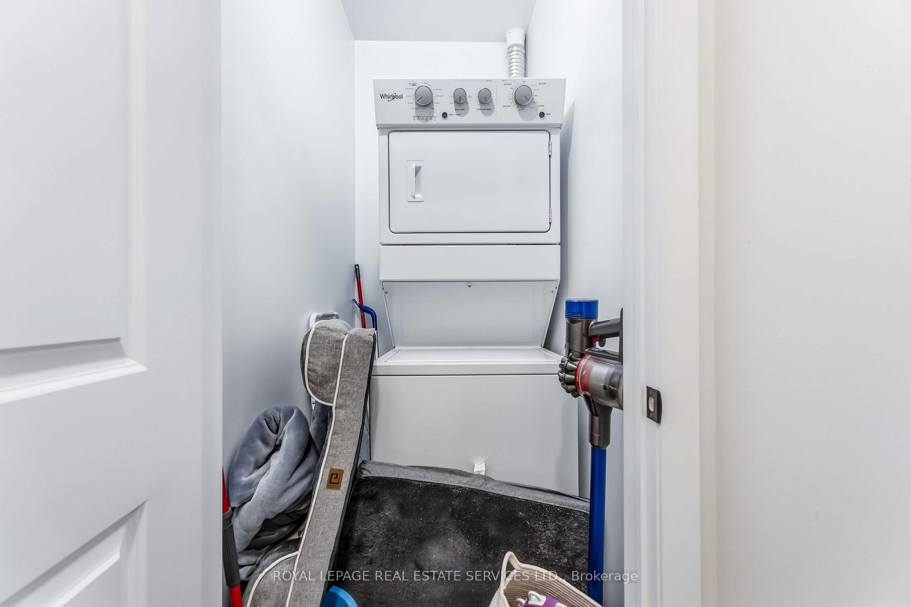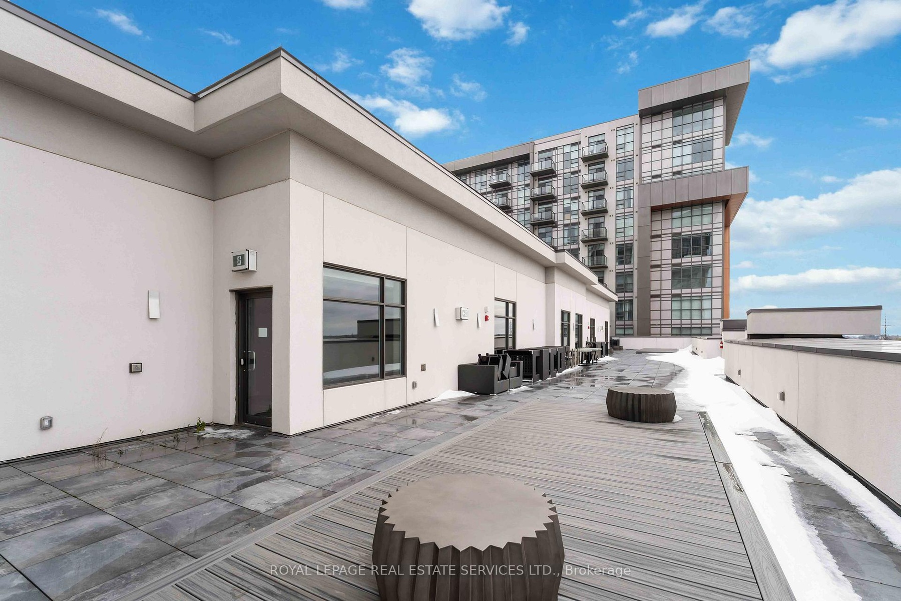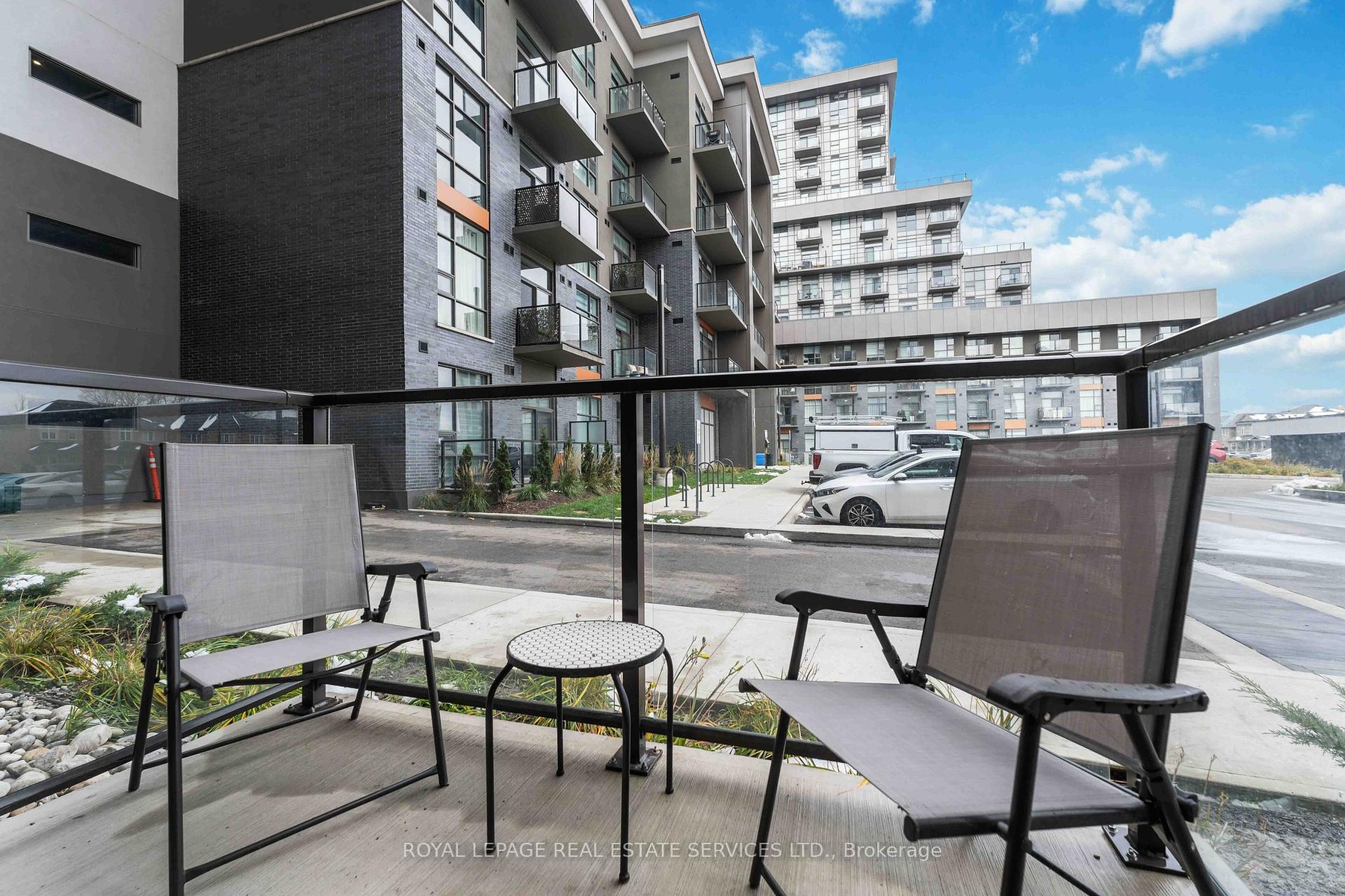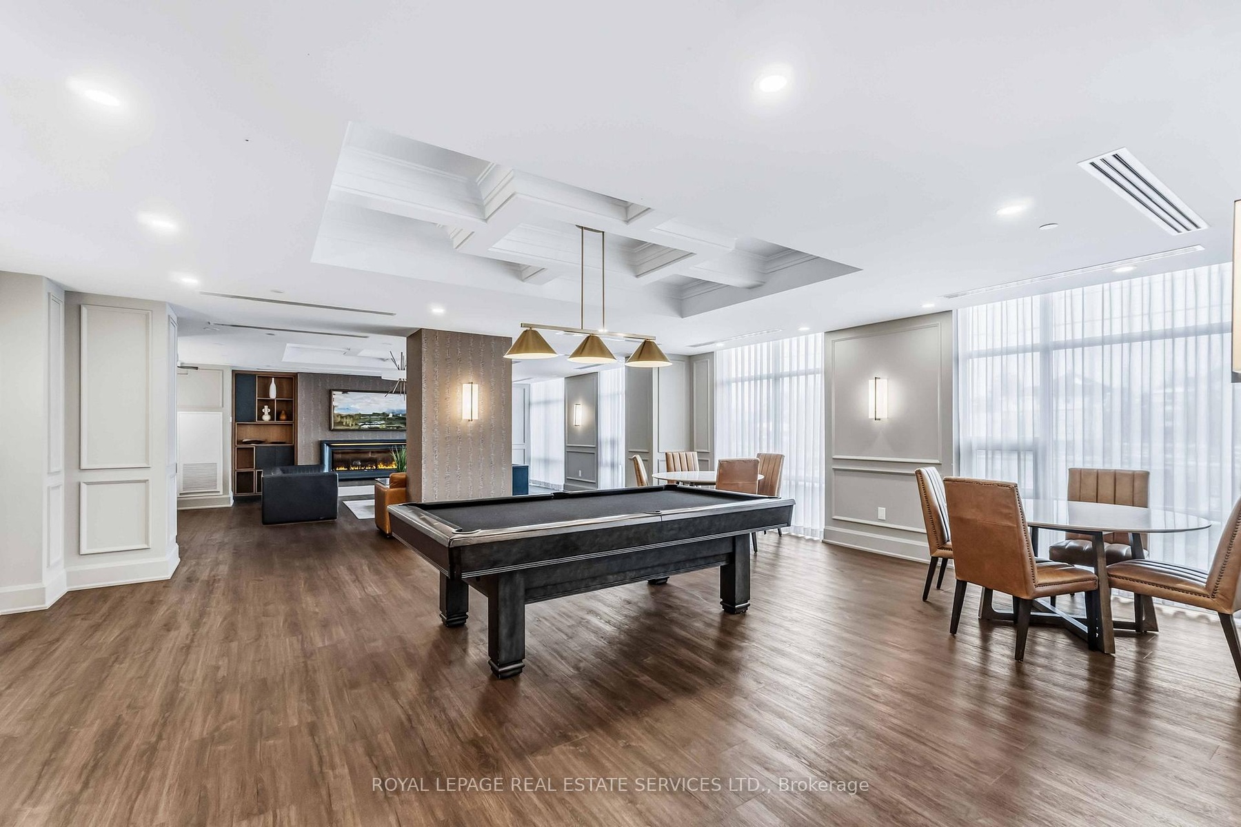 Experience modern living with this stunning 1-bedroom + den residence. The heart of the home is a modern, open-concept kitchen featuring a quartz peninsula island, subway backsplash, stainless steel appliances, and upgraded lighting. This flows seamlessly into a living and dining area defined by luxury vinyl plank flooring, a custom wall cabinet structure, and electric blinds, all leading to a sun-filled balcony walk-out. Beyond the main living space, you will find a versatile den perfect for a home office, a foyer with double mirrored closets, a 4-piece bathroom, and a bright primary bedroom with large windows. Perfectly situated for convenience, this unit is located just steps from the elevator, garbage chute, and your storage locker. Residents enjoy fabulous building amenities including a gym, party room, and meeting room, plus easy highway access for commuters. Don't miss out on this blend of luxury and convenience!