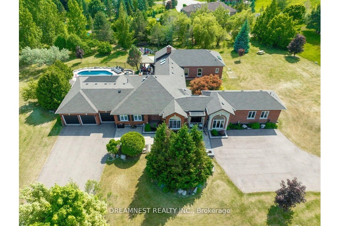 Nestled on a lush 1.67 acre lot in scenic Campbellville, this fully renovated 5 bedroom, 6.5 Bathroom bungalow perfectly blends contemporary farmhouse charm with luxurious resort-style living. Meticulously designed, this turnkey estate delivers an exceptional family estate and entertainer's paradise. Boasting over 6000 sq. ft. of finished living space, the gourmet chef's kitchen showcase top-of-the-line Thermador appliances, a Bosch built-in espresso machine, Miele double ovens, dual dishwashers, refined under-cabinet lighting - all seamlessly connected to a bright four-season sunroom, perfect for year-round enjoyment. The expansive primary suite provides a private sancturay featuring ensuite with dual rain shower heads with premium finishes. Main floor includes a dedicated spa wing with heated inground salt-water pool, hot-tub, sauna and fitness area with full bath, delivering an exclusive at-home wellness retreat. A private in-law suite offering a separate living room, bedroom with ensuite bath, and walk-in closet, perfect for multigenerational living or guest accommodation. The fully finished lower level includes a custom home theatre, bespoke live-edge bar, additional full bathroom, cedar-lined storage room, and secondary laundry - enhanced by designer millwork, barn doors, skylights, and upscale finishes throughout. Smart home technology is integrated via the Control4 system, offering complete automation and control of indoor and outdoor lighting as well as outdoor audio system, all accessible through a user-friendly app for seamless convenience. The professionally landscaped backyard is a true entertainer's dream, featuring a full outdoor kitchen, covered gazebo lounge, and cozy firepit area, surrounded by mature trees for ultimate privacy. Additional highlights include a detached barn, expansive manicured green spaces and a spacious three-car garage.
