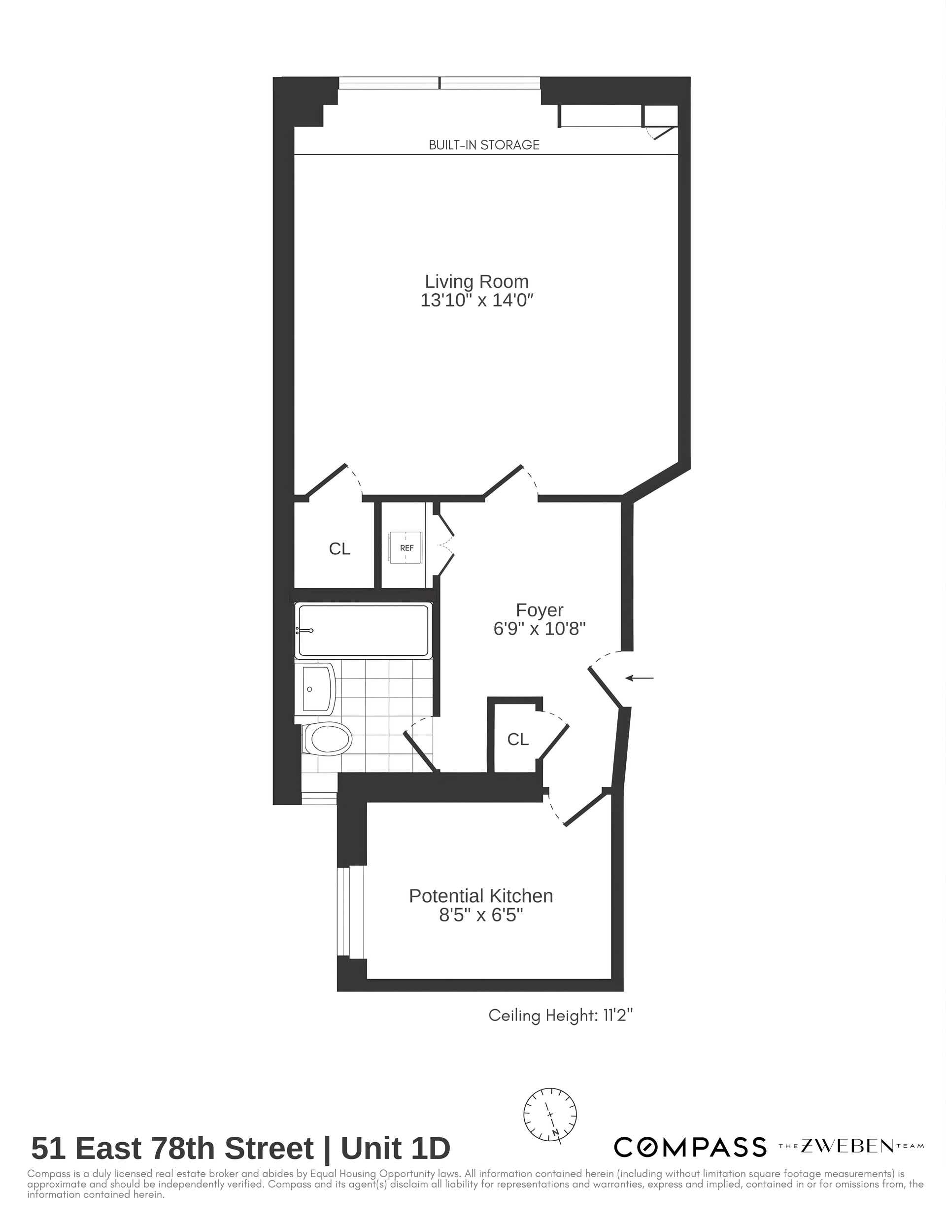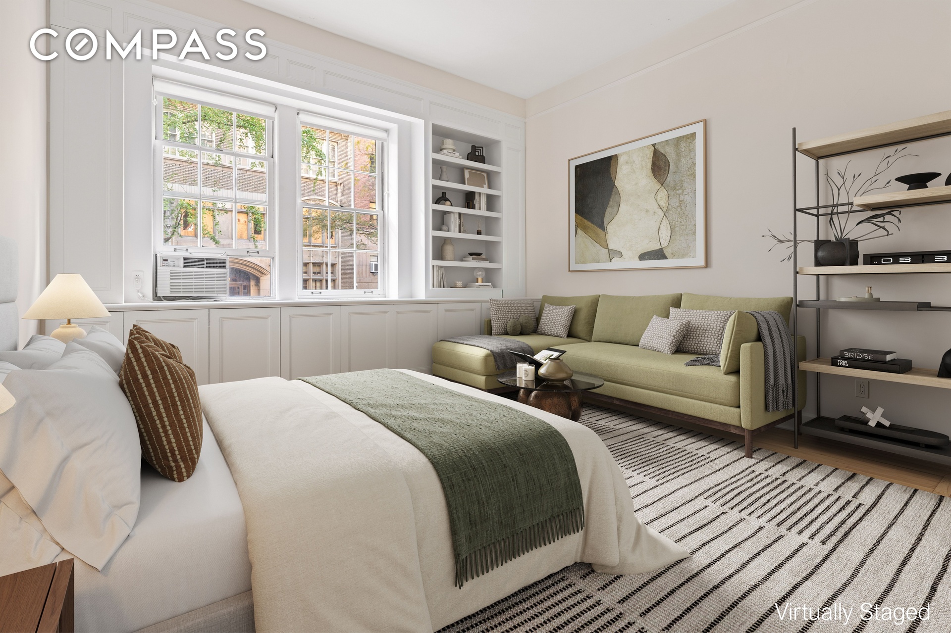 With over 11-foot ceilings and oversized, south-facing windows, this charming apartment has excellent light and is located on an elevated first floor off of the beautiful building lobby. With a formal entry foyer, this studio home has a gracious layout and the particularly high ceilings give the home an airy quality and spaciousness not often found in a studio. There is ample room for a full bedroom set and separate living area in the main room. The separate windowed kitchen area off of the entry foyer, is large enough for a proper kitchen and the separation from the main room helps keep cooking smells in the kitchen.