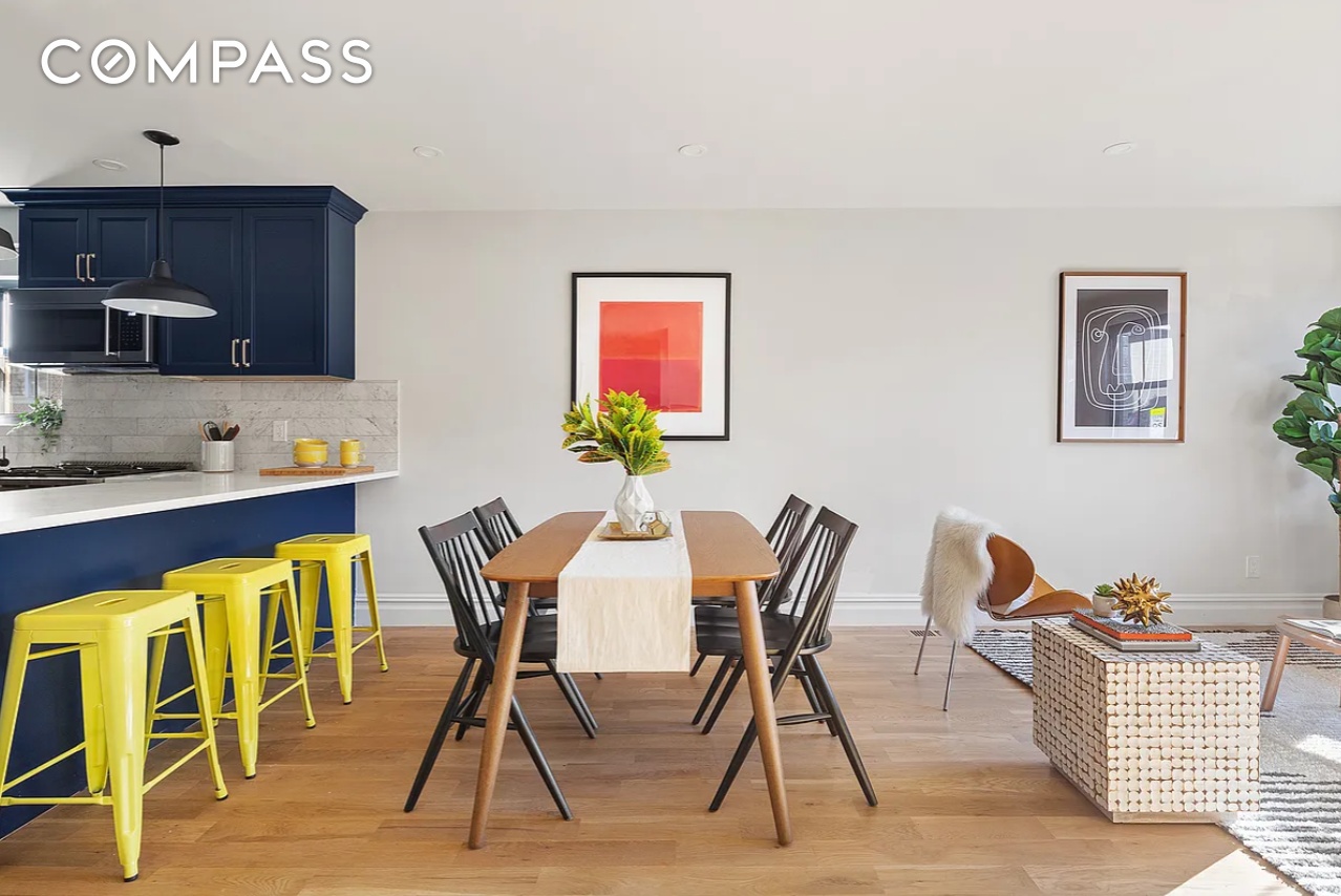 Step inside the owner’s duplex, which features two bedrooms, three bathrooms, and a finished basement. The open living and dining area is bright and airy, with two large windows bringing in southern light. The windowed kitchen stands out with its dark blue cabinetry, marble tile backsplash, and full suite of stainless steel appliances — including a 36" French door fridge, 30" stove, dishwasher, and microwave.