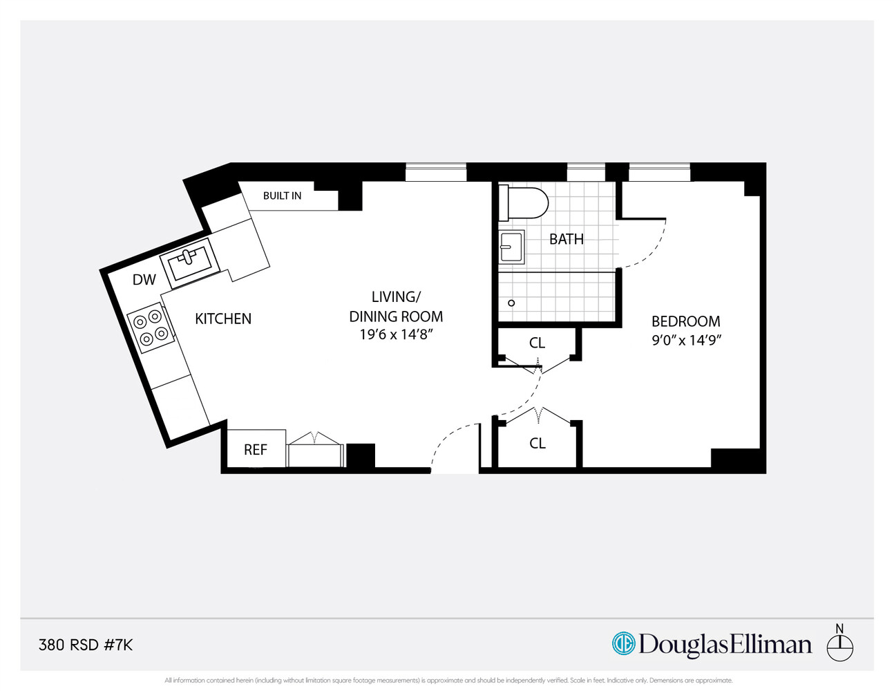 Additional highlights include built-in shelving in the living room and two closets for storage.