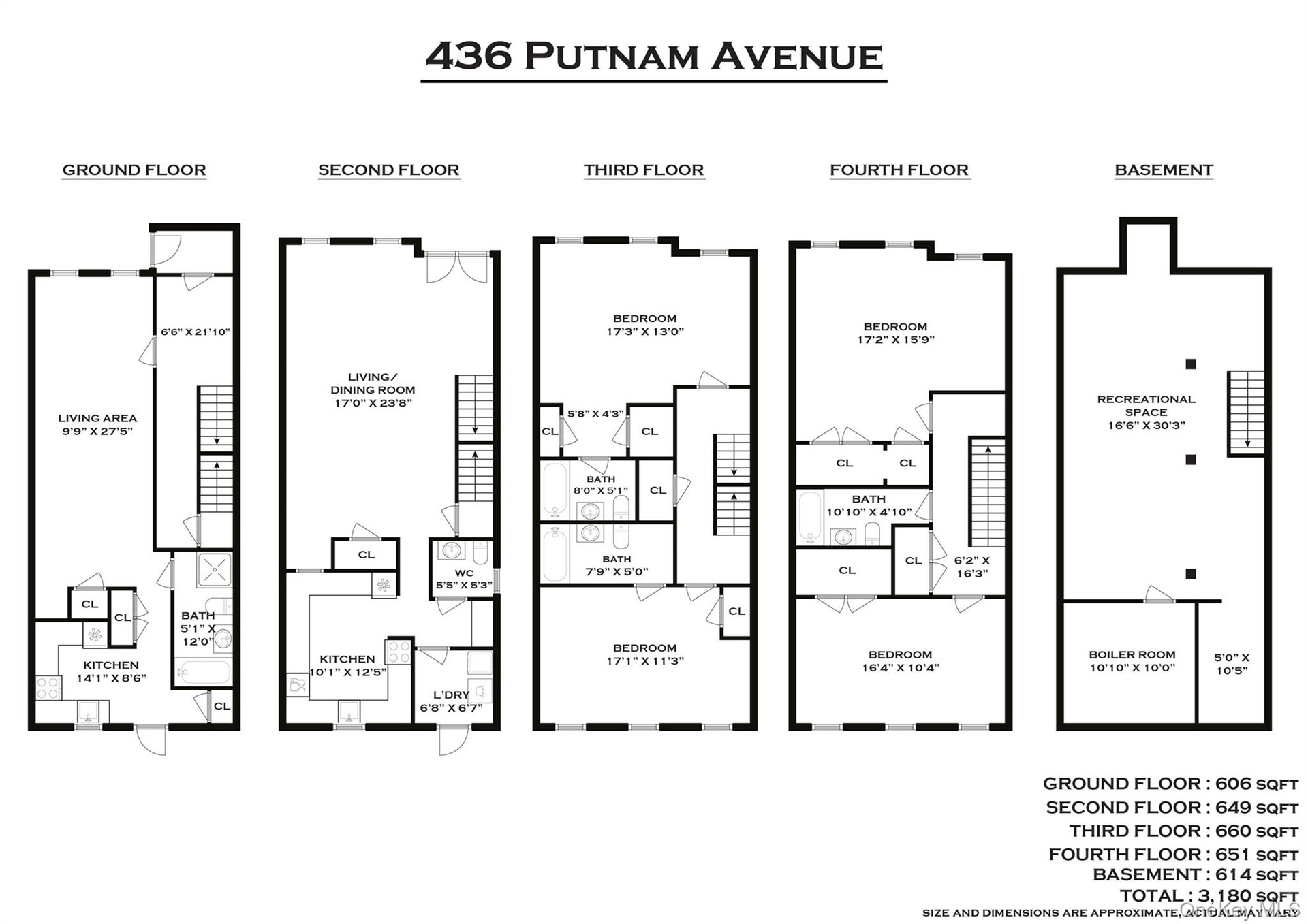 Welcome to 436 Putnam Avenue, a beautifully maintained multi-story brownstone with a finished basement located on a picturesque, tree-lined block in the heart of Bedford-Stuyvesant, Brooklyn. This expansive townhouse offers over 3,432 square feet of living space, blending timeless architectural charm with spacious modern living. The ground floor features a bright living area, updated kitchen, and full bathroom, offering a versatile layout perfect for entertaining or guest accommodations. The second floor boasts an open-concept living and dining space with a powder room and laundry area, ideal for hosting gatherings or relaxing evenings. Upstairs, the third and fourth floors provide a total of four large bedrooms and three full bathrooms, offering flexibility for a growing household or multiple home office setups. The fully finished basement includes a large recreation space and boiler room, adding functional square footage for storage, fitness, or creative use. With high ceilings, large windows, and well-defined rooms across every level, this home delivers both character and comfort. Conveniently located near local cafes, restaurants, and boutique shops, and within easy reach of public transportation (A, C, and G trains), 436 Putnam Avenue captures the best of Brooklyn living—space, style, and location in one exceptional package. Surrogate Court Approval Required before Transfer of Title!