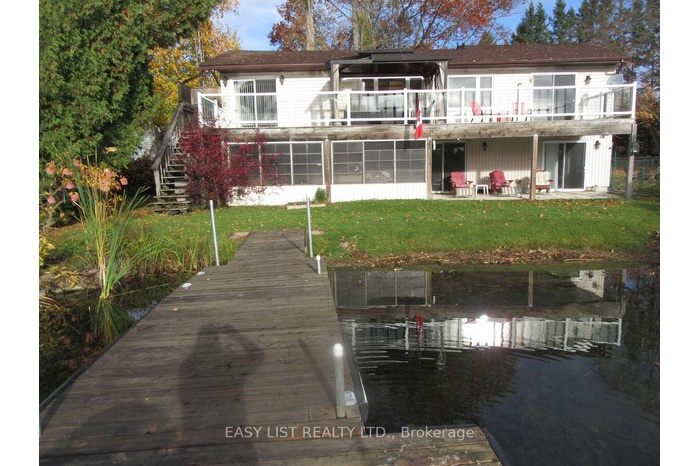 For more info on this property, please click the Brochure button. Located in a quiet bay of pigeon lake, this 2 storey ground level entry home has been cherished as a family cottage for 6 yrs and a family home for 25! The natural waterfront is gently sloping sandy walk-in area perfect for young children to wade into as well as the avid fisherman who is able to catch several species right off the floating dock. This 2600 sq ft home features 3 spacious bedrooms with a 4th easily made in the lower level by adding 1 wall. There are 2 - 3 pc washrooms one on each level. There are 5 sets of glass sliding doors 2 up and 3 down provide bright se sunrise waterfront views from most of the 2nd floor rooms. The spacious living room, huge kitchen, 3 bedrooms plus laundry are upstairs. Very large rec room with propane fireplace allows lots of space for friends and children to spread out. With 3 sets of sliding doors the patio and lakefront are just steps away as well as the 3rd set lead to a 22'x10' screen room for bug free relaxing that was previously used to have a hot tub and the 220v connection is still there as well as wired for satellite tv. The home has a propane/electric heat pump with central air. A propane fireplace adorns the lower family room level for cozy tv and entertaining. Bell FIBE Internet Just Installed. A dug sand point 16' well with a 3 stage UV system which has serviced the property for years will drinkable water. All external patio/deck furniture are included as well as Fire table and gazebo. There is a small seasonal adult oriented cottage/trailer resort next door. The property can be potentially run as a rental, family cottage or year round home!