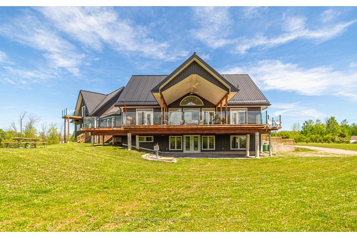 This beautiful 3-bedroom, 3-bathroom custom-built home is set on a private 7.4-acre lot and offers exceptional space and craftsmanship throughout. Featuring 9-ft ceilings and 8-ft glass doors, the home is finished with 8-inch engineered hardwood flooring. The spacious living room boasts 16-ft cathedral ceilings, pot lights, ceiling fans, and 7-ft windows that flood the space with natural light and provide a seamless walkout to an approx. 800 sq ft deck with custom aluminum frameless glass railing perfect for alfresco dining and entertaining. Enjoy five walkouts to the main deck, ideal for seamless indoor-outdoor living. The gourmet kitchen is a showstopper, featuring maple cabinetry with solid oak doors, a distressed leather granite countertop, and a massive 5x10 center island. The primary bedroom includes a walk-in closet, walkout to the deck, and an opulent 5-piece ensuite. The 2,525 sq. ft. basement offers three additional walkouts and endless potential. Additional highlights include upper and lower garages, perfect for vehicles, tools, or extra storage. Located just 10-15 minutes from shops, a bakery, pharmacy, and restaurants, with easy access to parks, a library, medical services, and only a 5-minute walk to year-round recreation on Lake Scugog, including a nearby boat launch for convenient lake access.