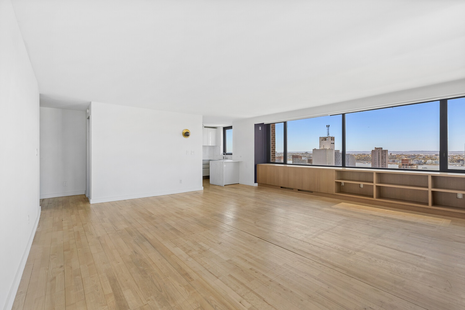 Bathed in natural light, the home features an open-concept layout with sleek modern finishes, oak floors, and floor-to-ceiling windows framing Manhattan's west side. The designer kitchen is outfitted with Poggenpohl cabinetry, Caesarstone countertops, and top-of-the-line stainless steel appliances. The spacious primary suite includes generous closet space and an elegant spa-style bath with marble finishes and a soaking tub.