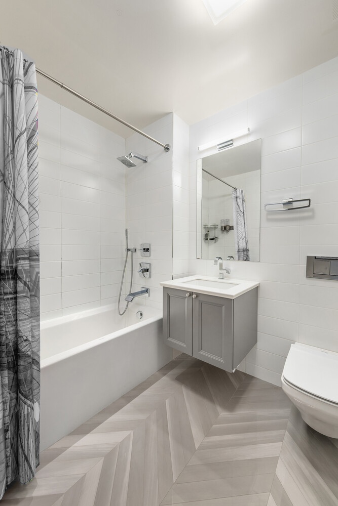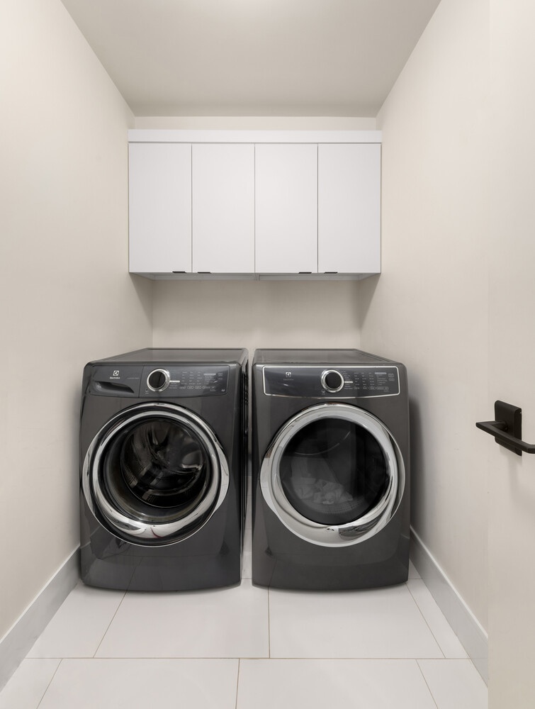A second full bath is located off the main hallway and features a striking chevron-tiled floor, deep soaking tub, along with similarly refined Duravit and Kohler finishes. Across the hall, you'll find a proper laundry room with full-sized washer and vented gas dryer-an increasingly rare convenience.