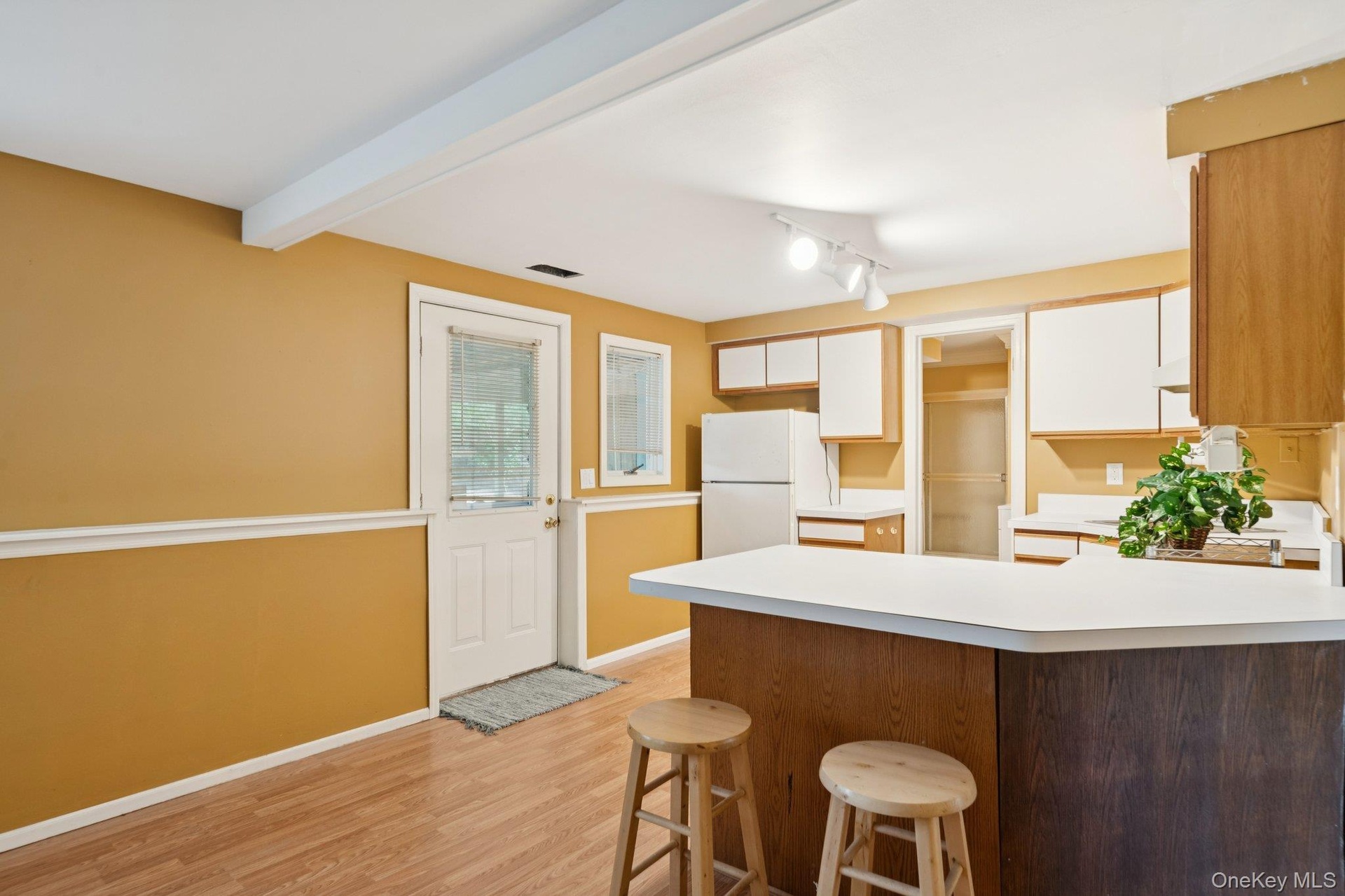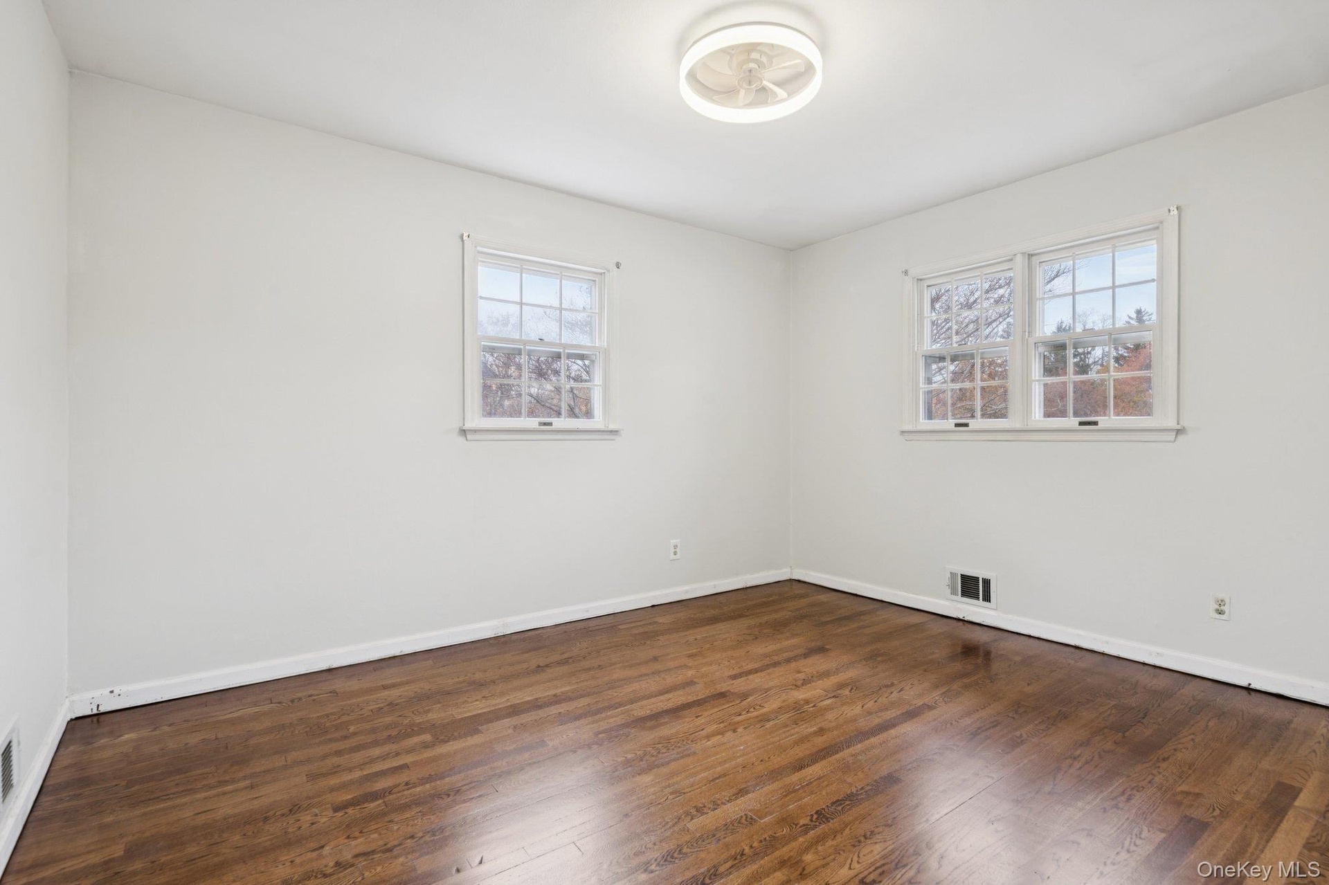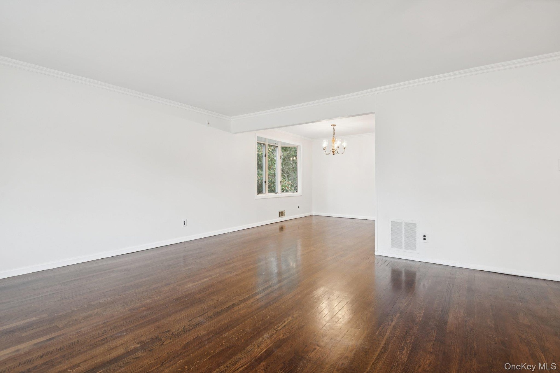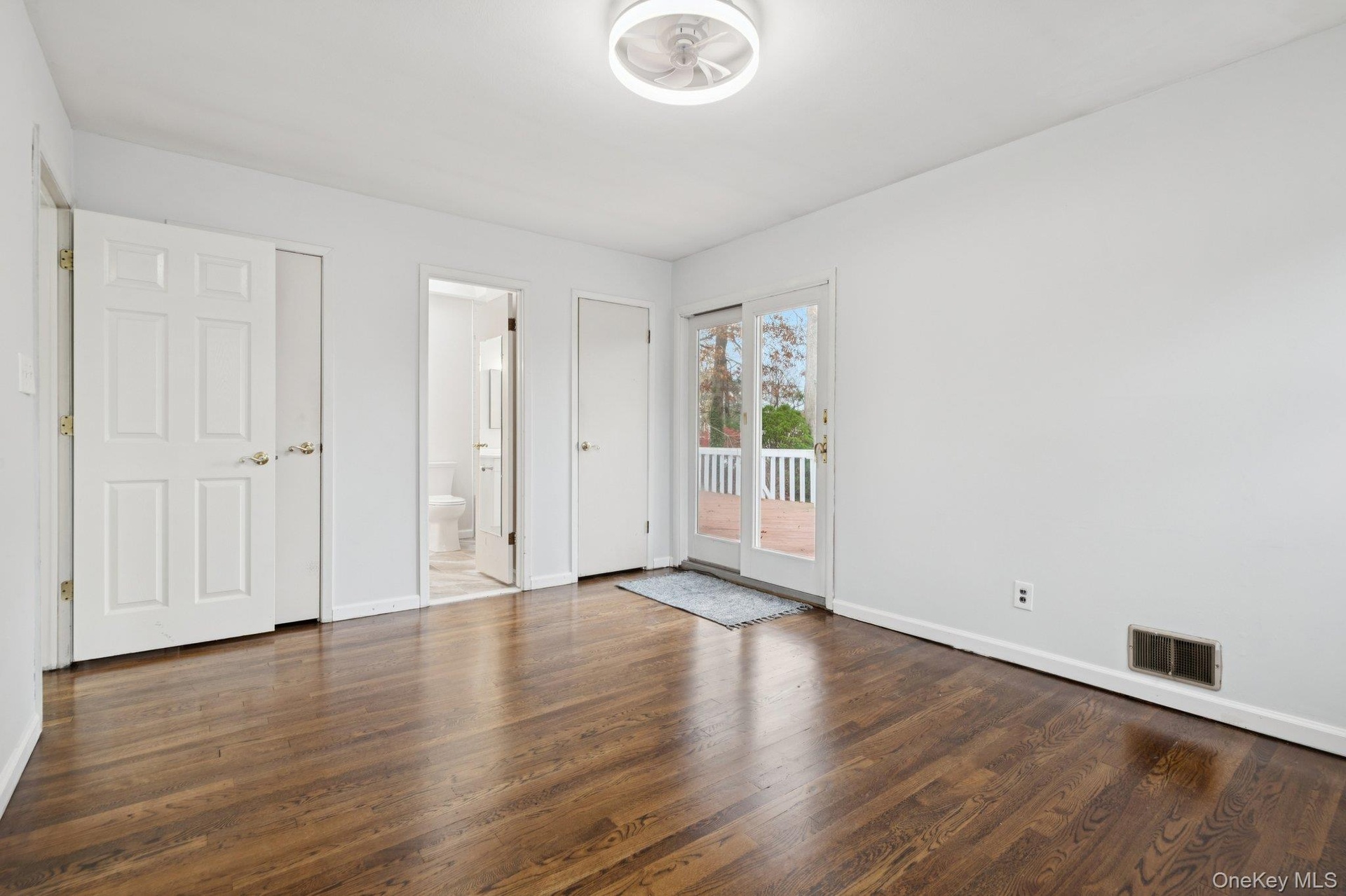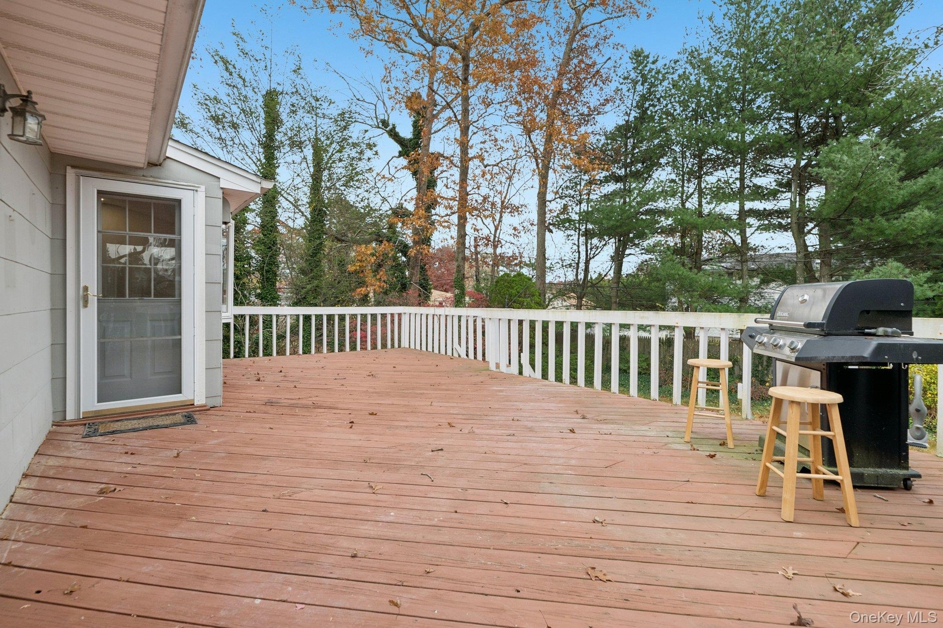 The main level features newly finished dark oak hardwood floors, elegant crown molding, and bay windows in the living, dining, and kitchen areas that fill the space with natural light. The updated kitchen boasts granite countertops, stainless steel appliances, and a newly installed wood floor. The primary bedroom includes a sliding door leading to a private deck—perfect for morning coffee or evening relaxation.