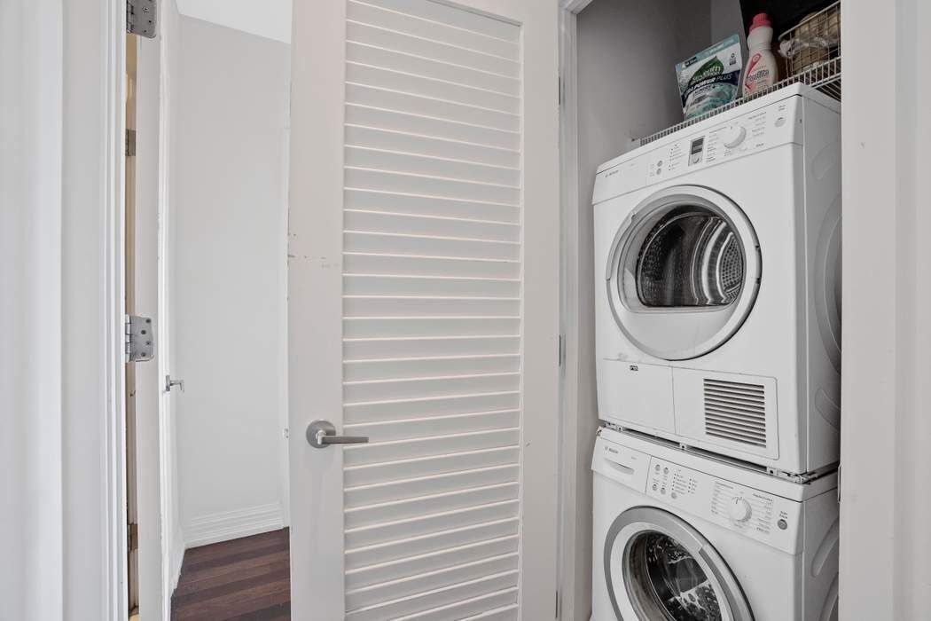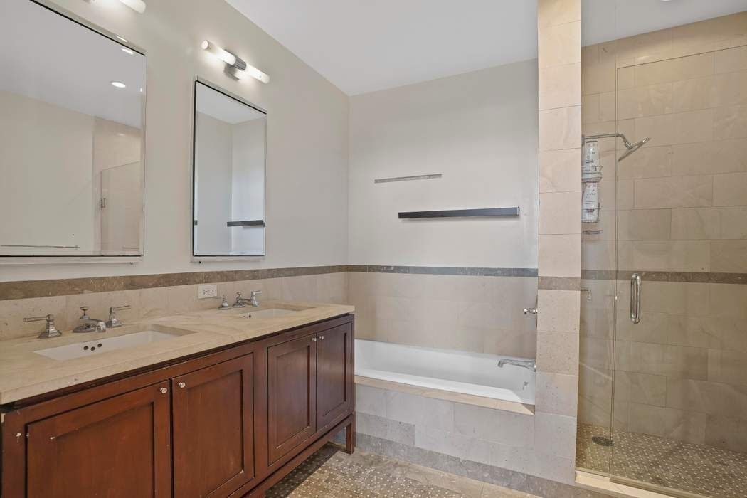 The split-bedroom layout ensures privacy and balance. The primary suite features two oversized closets and a luxurious spa bathroom with a soaking tub, glass-enclosed rain shower, and dual custom vanity surrounded by stone tile. The secondary bedroom enjoys its own full bath, while the bonus room/home office—accessible through a stylish barn door—offers flexible space for work or guests. Additional features include central heat and air, an in-unit Bosch washer/dryer, and two private storage lockers.