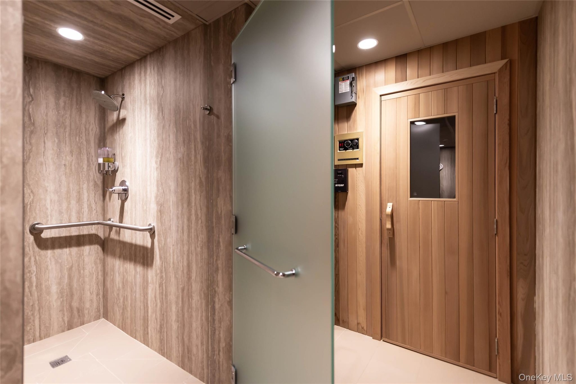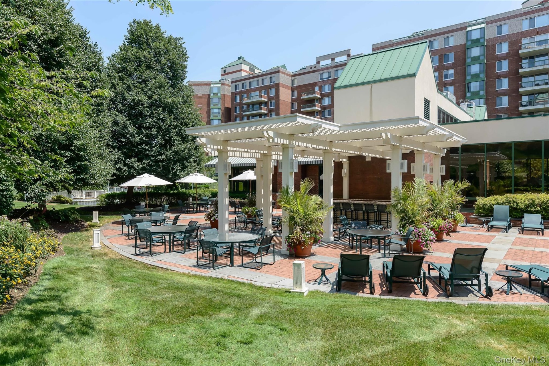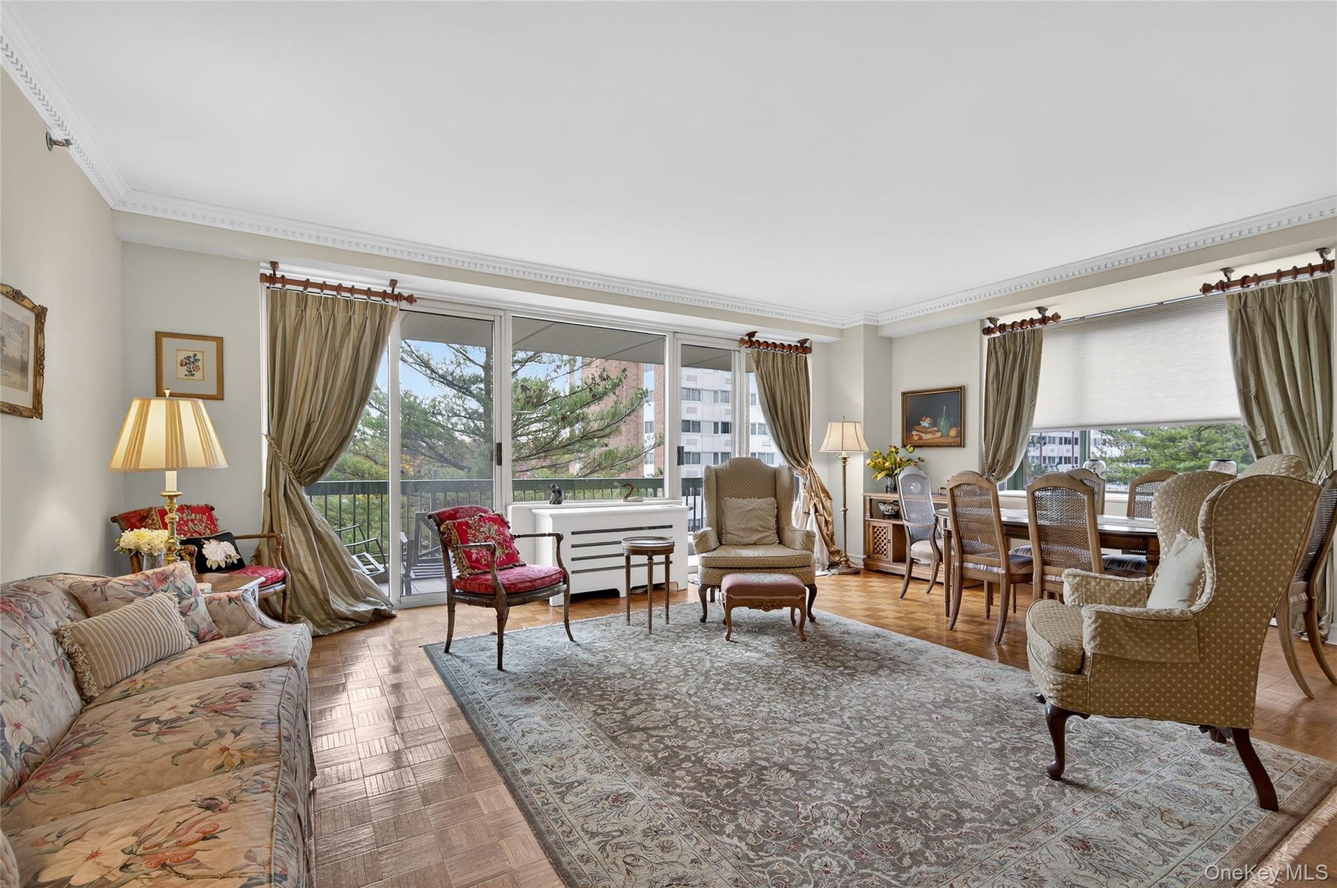 Rarely available, a Charming County Kitchen Model in the East Building. This sun-drenched corner unit offers both southern and western exposures, filling every room with natural light. One of the largest two-bedroom floor plans available, it features a spacious eat-in kitchen that opens seamlessly into the living and dining areas, complete with two sets of sliding doors leading to a private balcony — perfect for entertaining or relaxing outdoors. The primary suite impresses with two double closets, a large walk-in closet, and a luxurious spa-inspired en-suite bath. The secondary bedroom includes custom built-ins and its own en-suite bath. Additional highlights include custom moldings throughout, an in-unit washer/dryer, two valet garage parking spaces plus a lower-level storage bin. Enjoy Wyndham's 5-star, resort-style amenities, including a 24/7 doorman, concierge and valet services, state-of-the-art gym, indoor pool, exercise room, club and movie rooms, library, and conference facilities. Conveniently located near village shopping, fine dining, schools, parks, and the LIRR, The Wyndham isn’t just a home—it’s a lifestyle.
