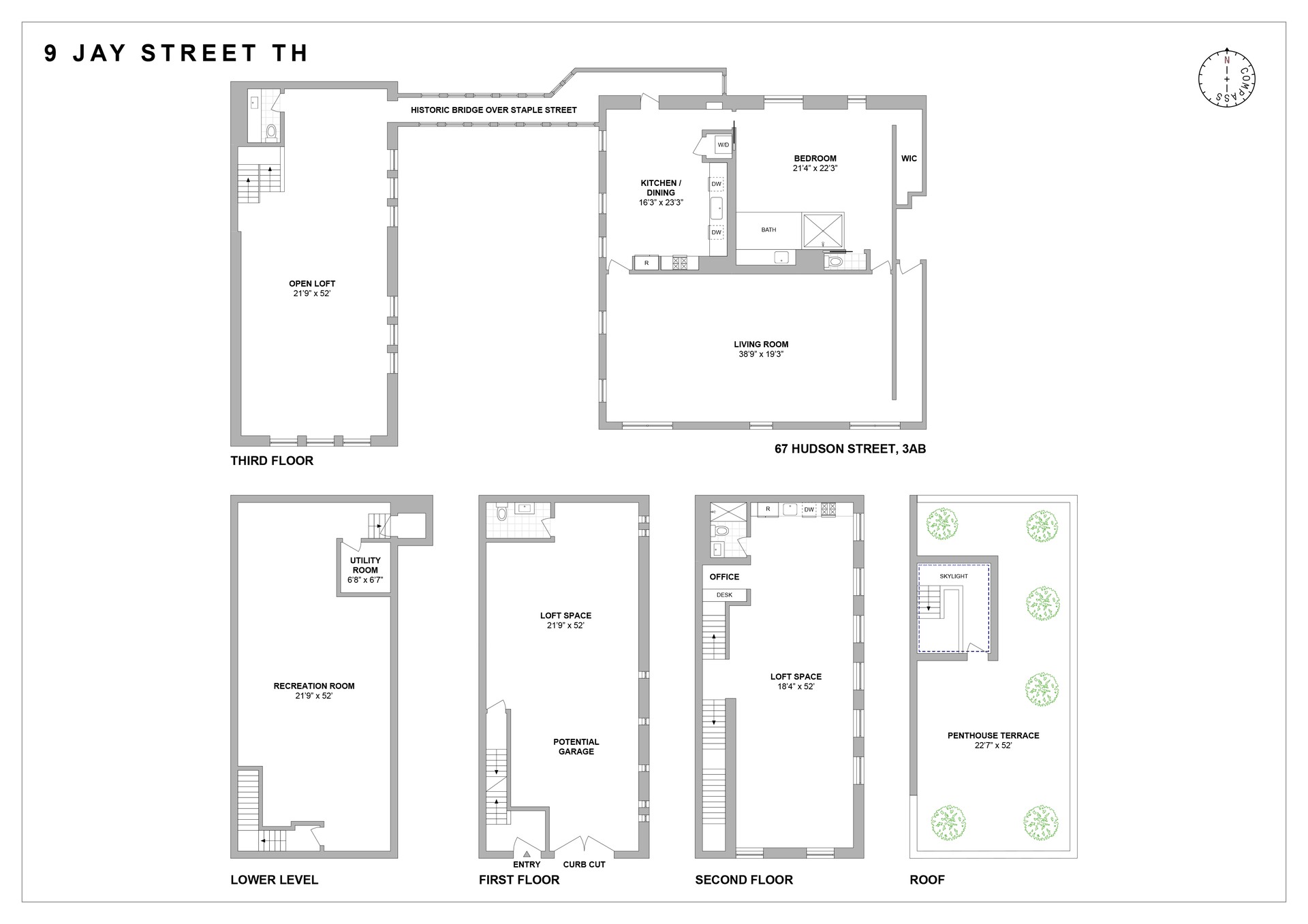 Positioned just moments from Hudson River Park, the Tribeca Film Center, Washington Market Park, and a collection of the city’s most celebrated restaurants, 9 Jay Street captures the essence of downtown New York while offering privacy, scale, and story. Opportunities of this caliber — with architectural pedigree, private parking, and such an iconic feature as the Staple Street footbridge — rarely come to market. This is more than a home; it’s a defining piece of New York history and a chance to shape its next chapter.