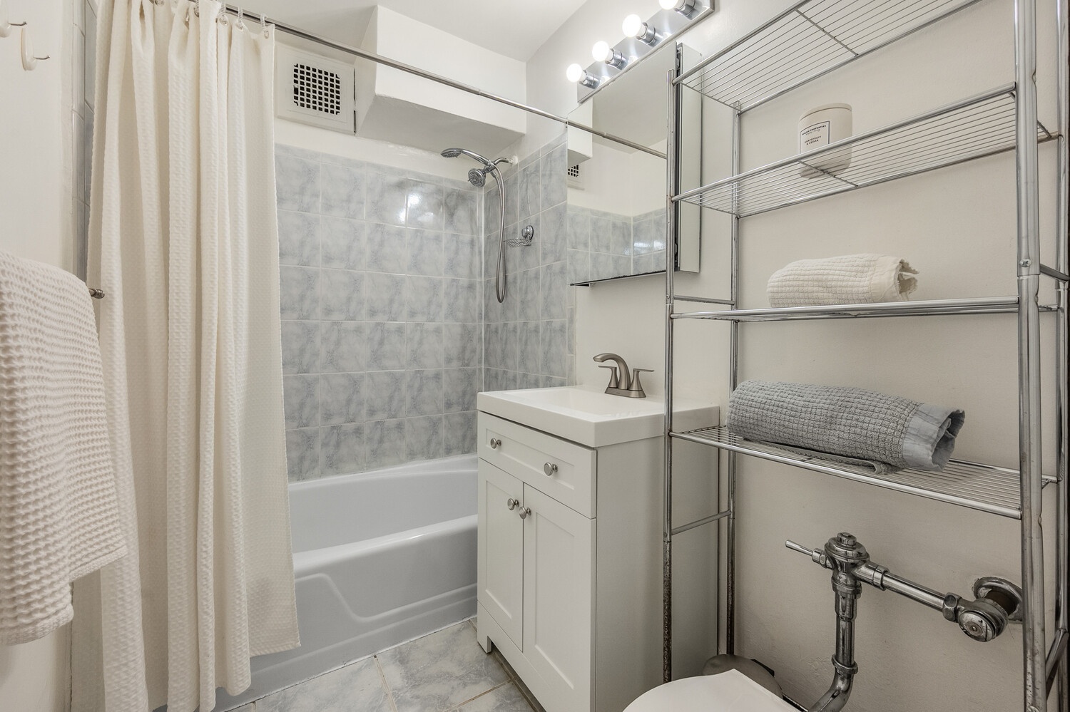 The king-sized bedroom offers excellent closet space and a quiet rear-facing exposure. The bathroom is clean and in good condition. The apartment is move-in ready, with the option to make cosmetic updates over time.