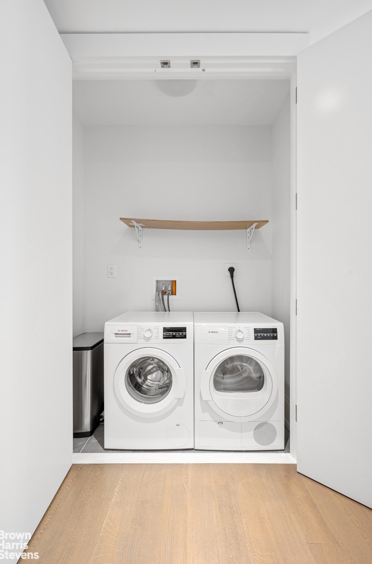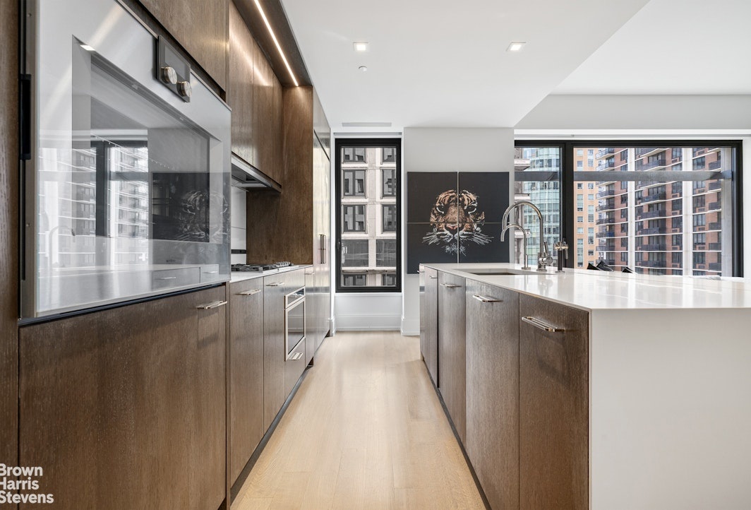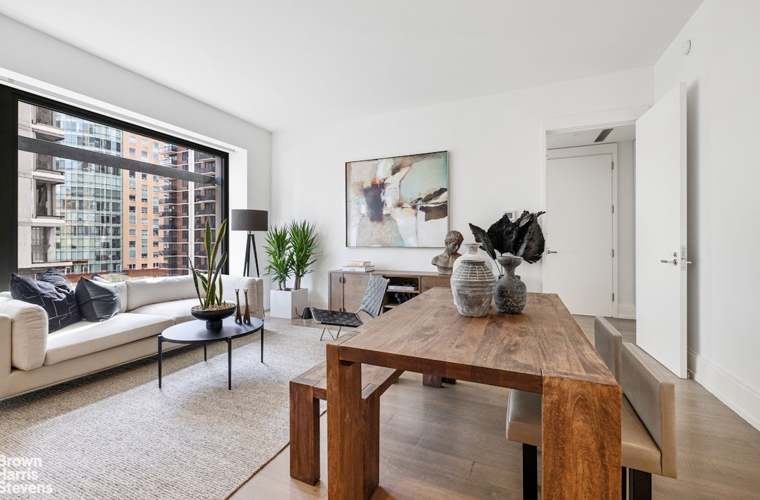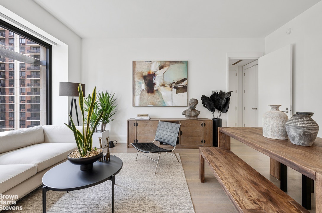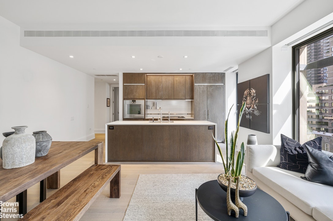 This double corner unit spans 1,447 square feet, featuring two bedrooms and two-and-a-half baths. Enter through a gracious foyer leading to a southern-facing, light-filled living/dining room, perfect for entertaining. With sun-soaked city views to the south, east, and west, this residence boasts a CookFox-designed kitchen equipped with a professional-grade Gaggenau appliance suite, U-line wine fridge, Dornbracht faucets with a filtered instant hot/cold waterspout, custom cabinetry, ample storage, Caesarstone countertops, and a Bianco Dolomiti marble backsplash.