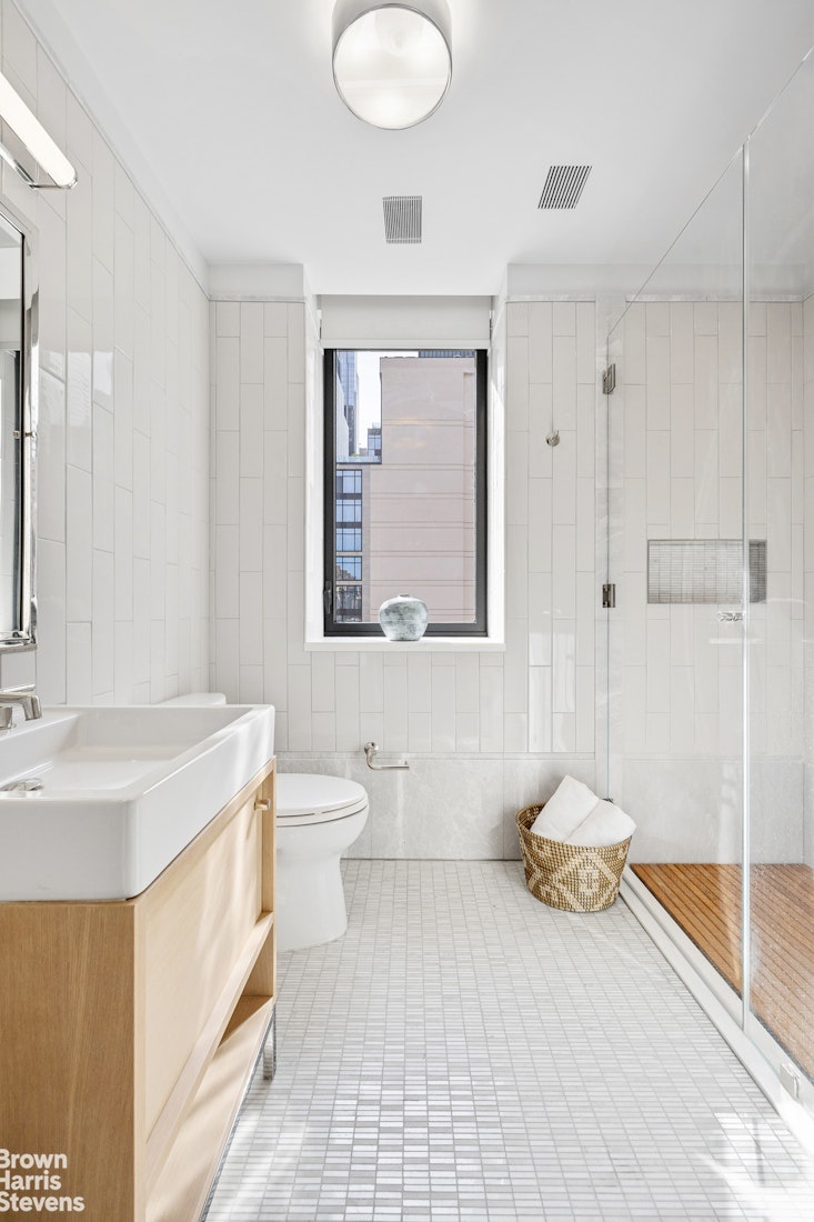 The primary bedroom has eastern and southern exposures, a large windowed walk-in closet, a separate full-sized closet, and an oversized bathroom featuring a glass-enclosed shower, soaking tub, Bianco Dolomiti marble, Calacatta Gold mosaic flooring, Waterworks fixtures, and custom lighting by CookFox. The spacious second bedroom enjoys western and southern exposures, an ensuite bath, and a full-sized closet.