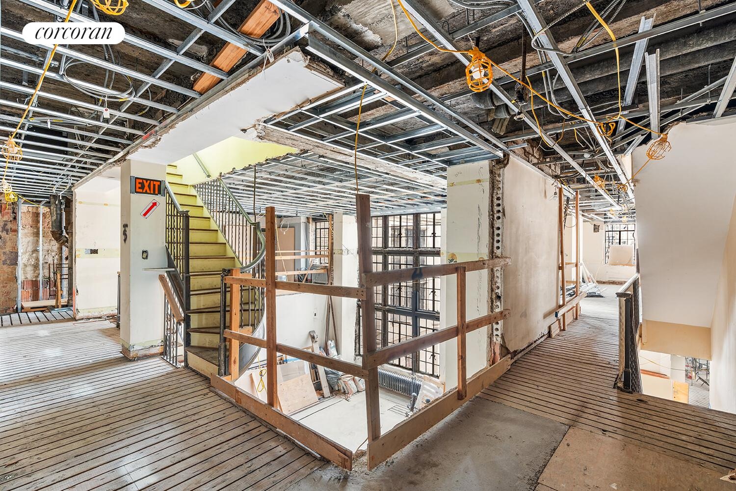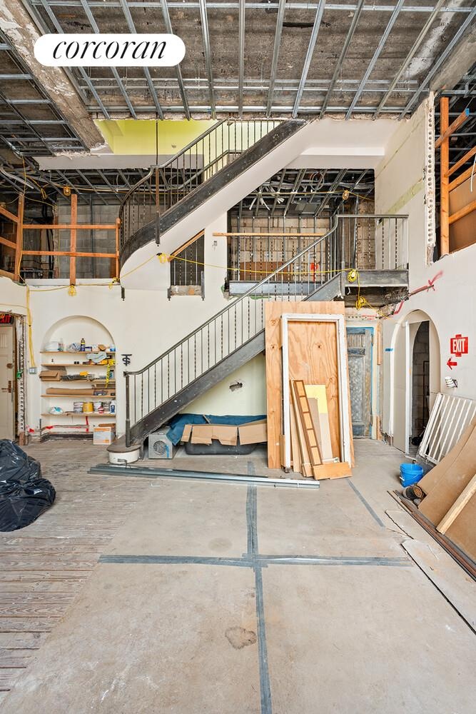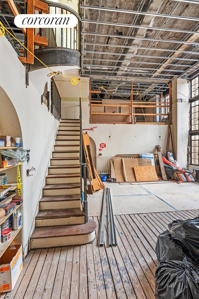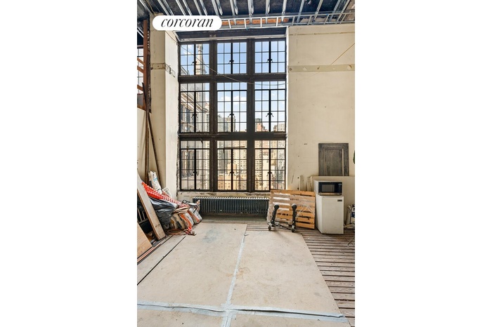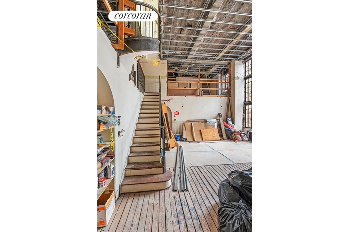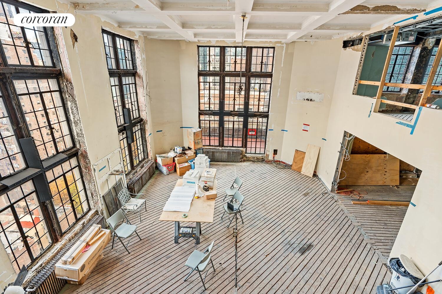 Soaring ceilings, exposed beams, and original steel casement windows recall the building's 1920s Gothic Revival origins, blending historic craftsmanship with the opportunity for modern reinvention.