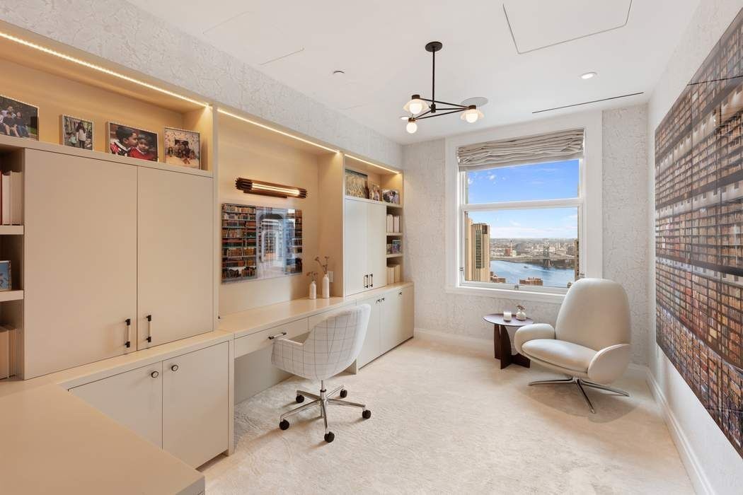The centerpiece of the home is the dramatic 36’ ± corner great room where sunlight pours in through oversized windows that frame sweeping city and river views. A custom bar completes the space and is perfect for effortless entertaining. Currently configured as a three-bedroom with a home office, the layout allows for an easy conversion to a four-bedroom plus office, offering remarkable flexibility for today’s lifestyle.