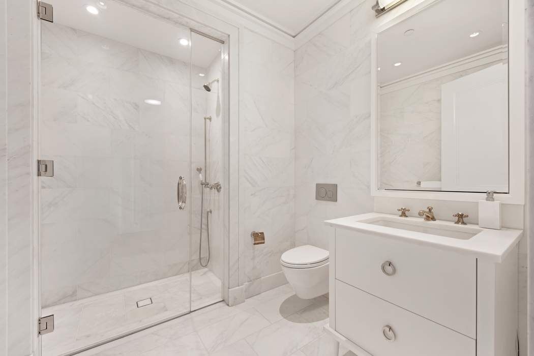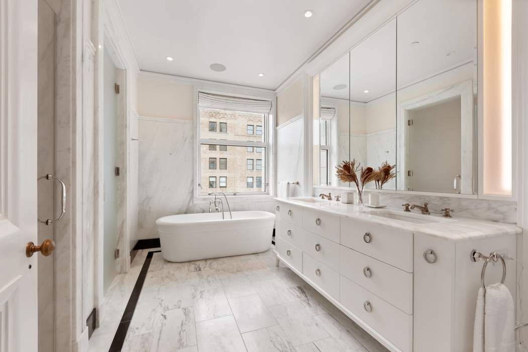 The oversized corner primary suite is a serene retreat, complete with a 13’ x 10’ walk-in closet and a spa-like bath boasting a steam shower, freestanding Porcelanosa soaking tub, dual vanity with Dornbracht platinum-finish fixtures, and radiant-heated Calacatta Caldia marble floors.