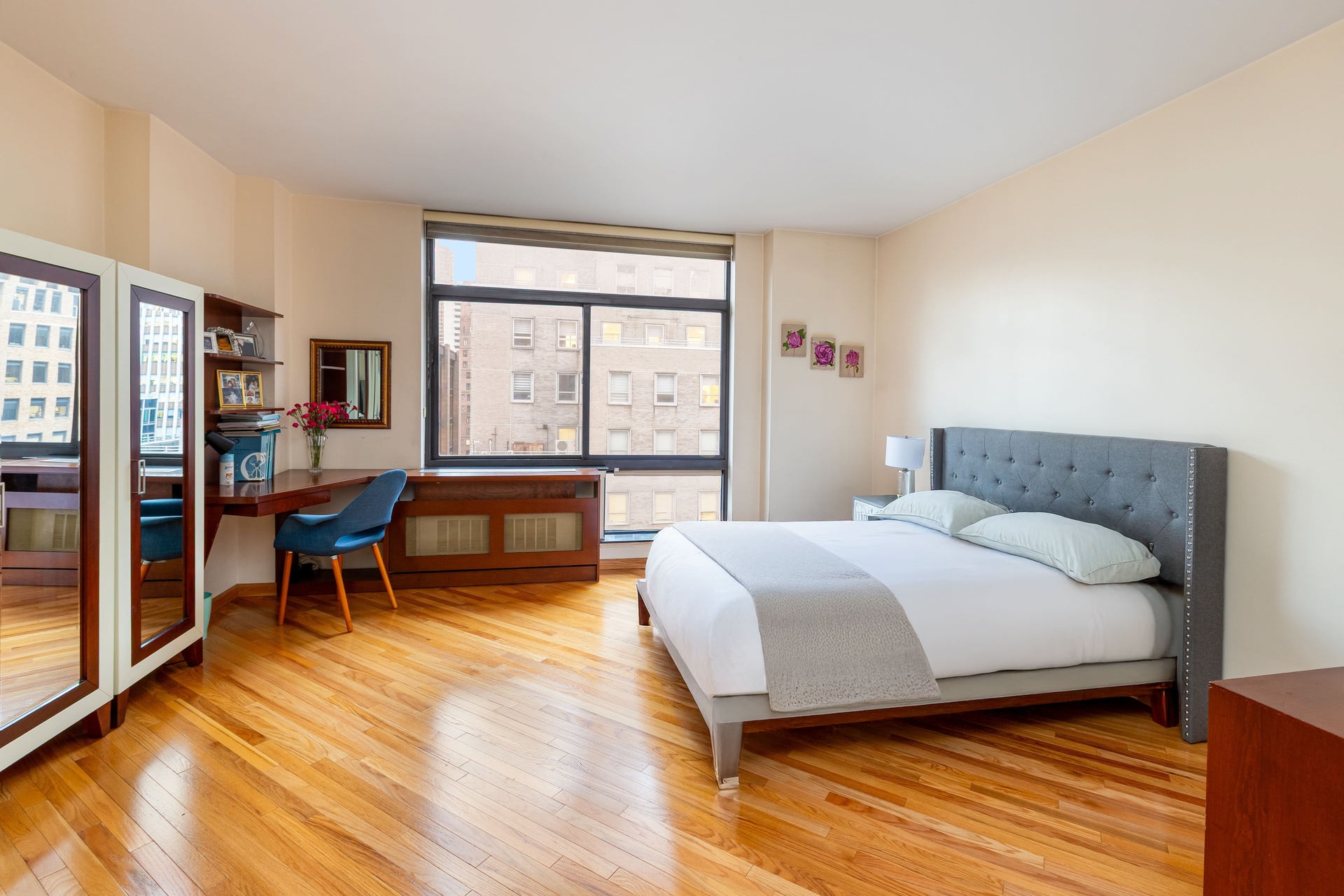 The intelligent split-bedroom layout ensures exceptional privacy and tranquility. The oversized primary suite is a serene retreat, boasting beautiful Western views, ample custom closets, newly installed wood floors, and a luxurious en-suite bath complete with refined fixtures, a deep soaking tub, and custom marble vanity. The primary suite also includes a custom built-in desk, perfect for remote work or study. The second bedroom is equally impressive, offering bright corner exposures (N/E) and inspiring skyline views.