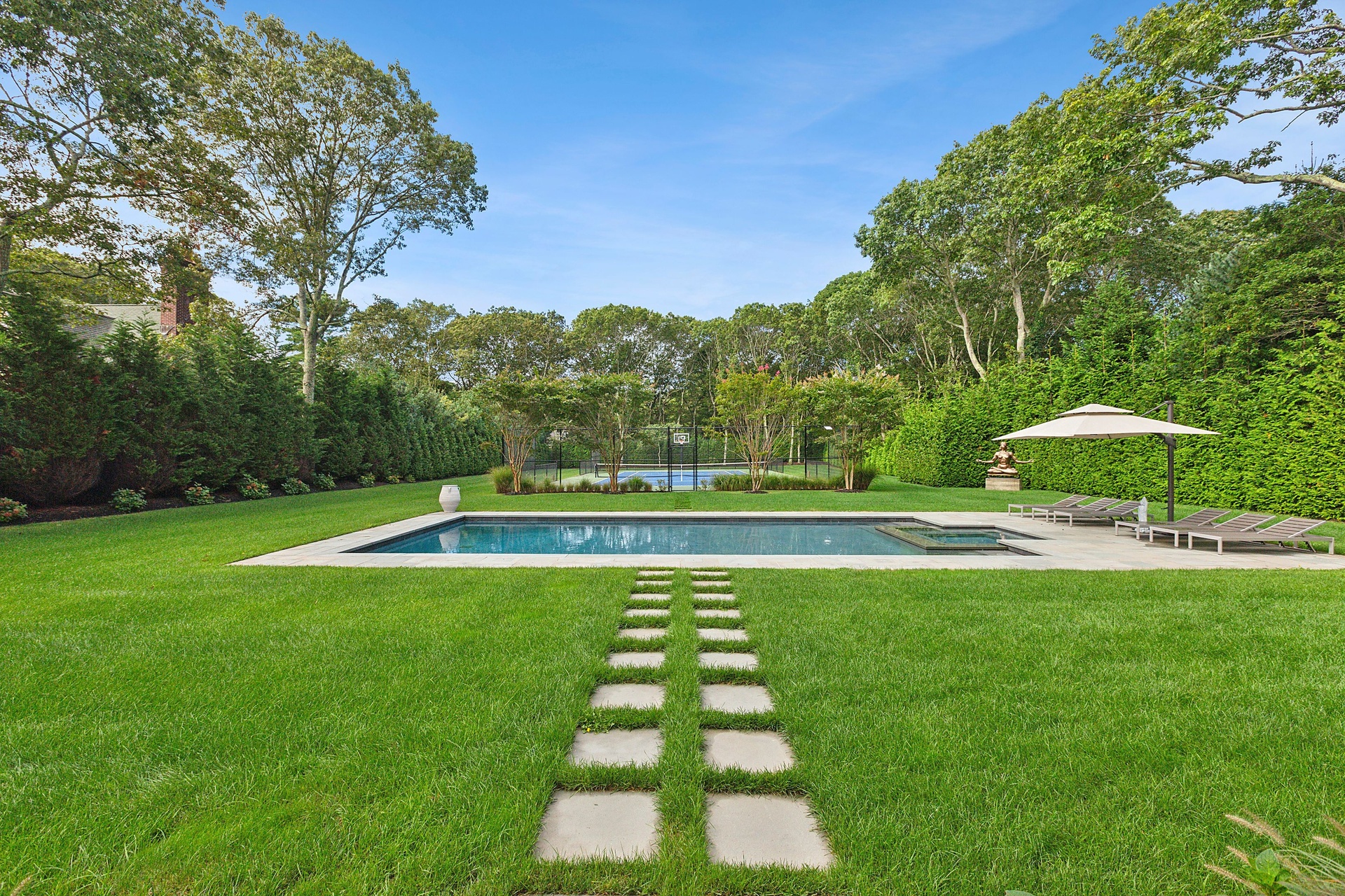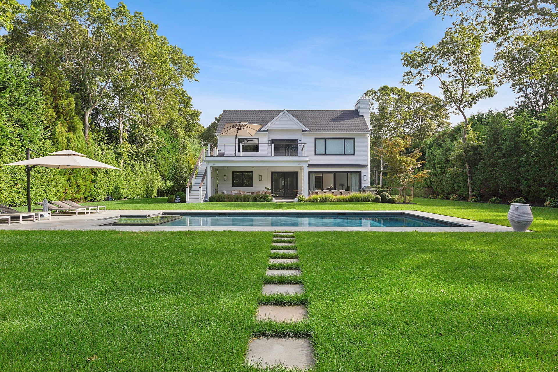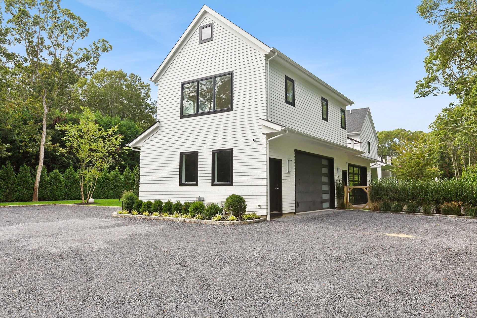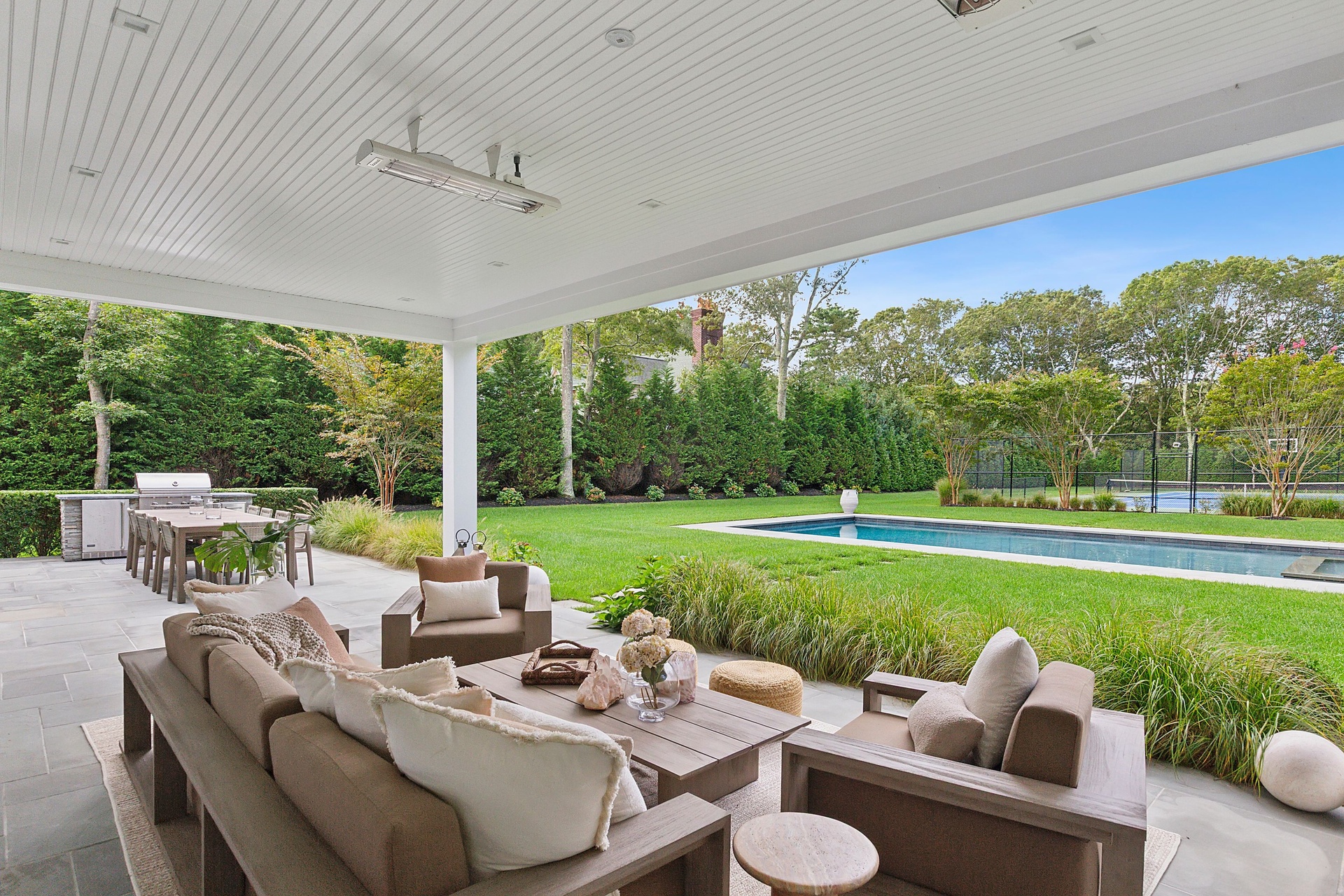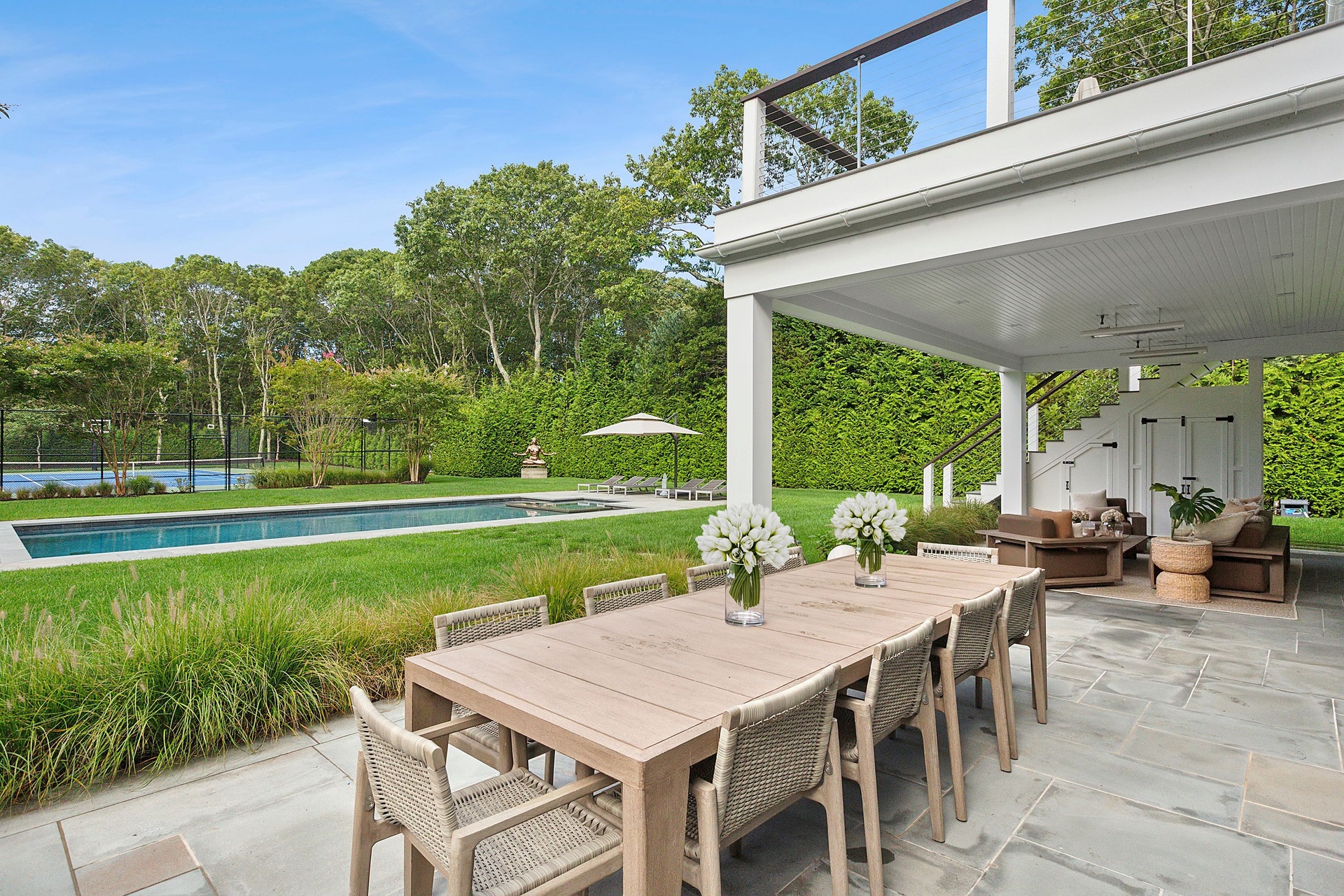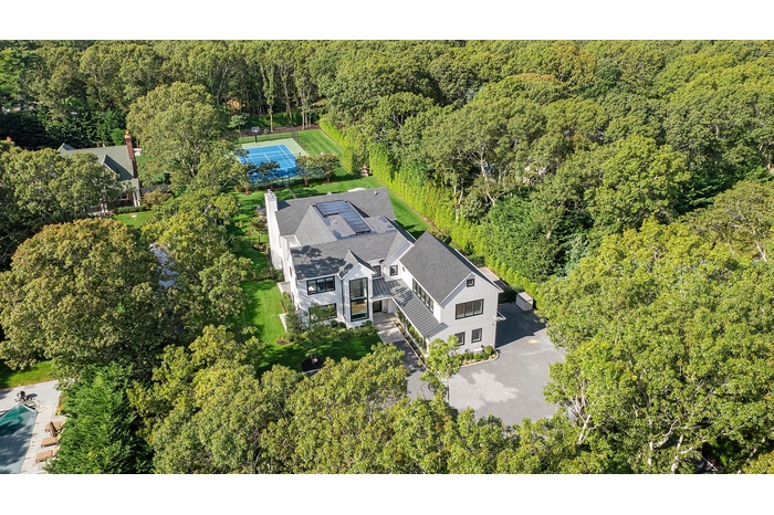 Nestled on a serene 1.3 acre flag lot, this gated estate is enveloped by mature privacy trees and lush, meticulously landscaped grounds creating a true private retreat. Spanning 7,000 square feet across three levels, the residence offers 7 bedrooms and 6.5 baths, thoughtfully designed with six-inch-wide white oak select hardwood flooring throughout. At the heart of the home, the gourmet kitchen showcases premium Sub-Zero and Wolf appliances, including an 8-burner stove, and a striking waterfall edge island with ample seating. Matching stone countertops and backsplash slabs add a touch of modern elegance, while an adjacent private dining area with a glass-front wine closet provides the perfect setting for entertaining. Just off the main living area, a state of the art fitness center opens through a full garage-style glass door into a private garden area, blending indoor and outdoor wellness experiences. Upstairs, the primary suite spans the entire rear of the home, offering tranquil backyard vistas from a wraparound balcony shared with the guest suite. The suite features a spacious sitting area or office alcove, a cozy fireplace, and an expansive custom closets. Three additional bedrooms and a fully equipped laundry room with generous storage and counter space complete this floor. The lower level is designed for leisure and entertainment, featuring a private sauna, theater/media room and two bedrooms with one full bathoom. The home features a state-of-the-art Japanese water filtration system servicing the entire house, delivering exceptionally pure, spa-quality water at every tap. Outdoors, the property transforms into a resort inspired sanctuary with a heated patio area, fire pit lounge, outdoor shower, pickleball and tennis court, and a built in spa integrated into the pool. Combining refined luxury with wellness focused living, this exceptional home offers a one of a kind retreat for relaxation, recreation, and rejuvenation. Only 5 minutes to water access to launch a paddle board or kayak on the peconic bay! **Rental includes use of an Escalade truck with Town of Southampton Beach Parking Pass!**