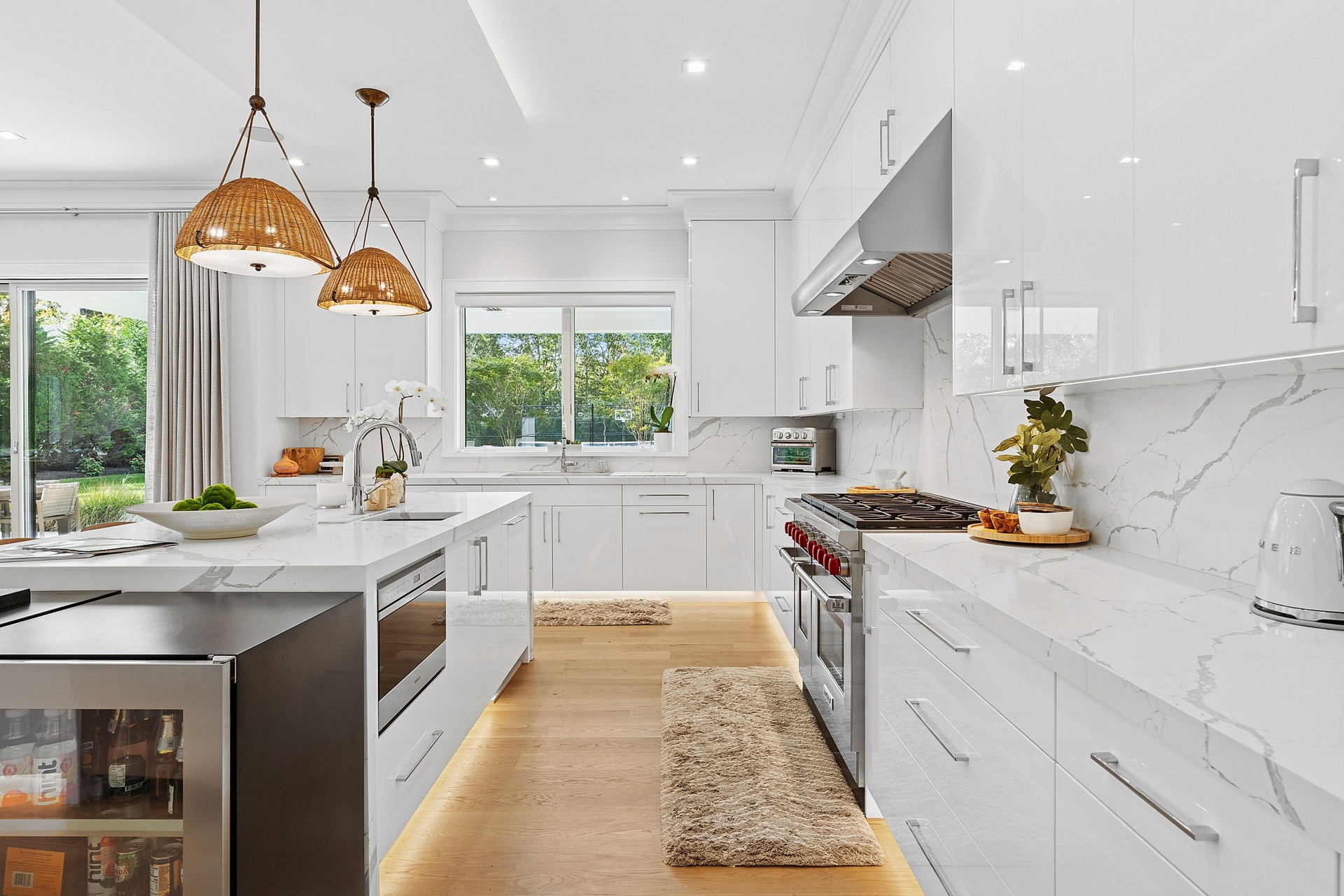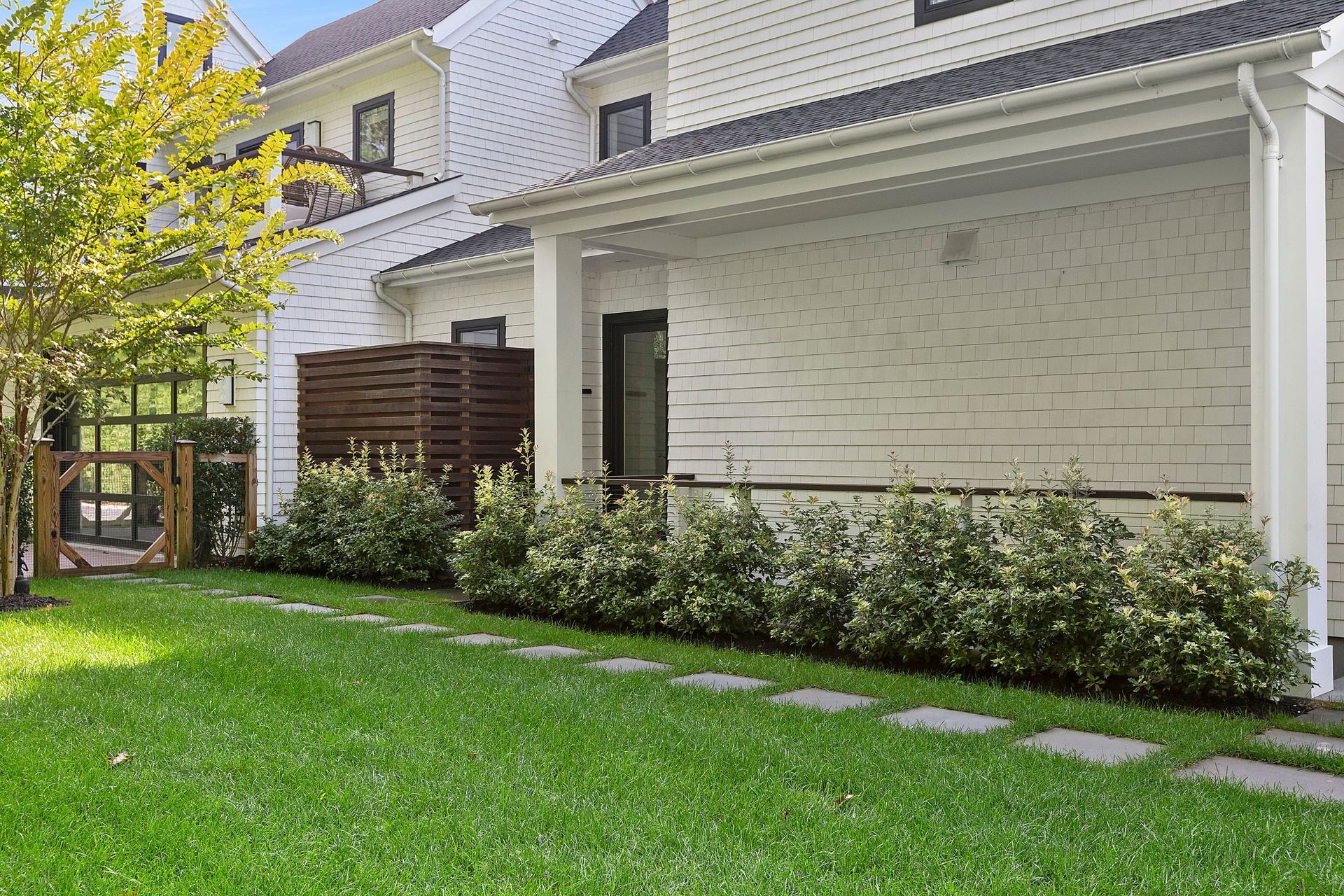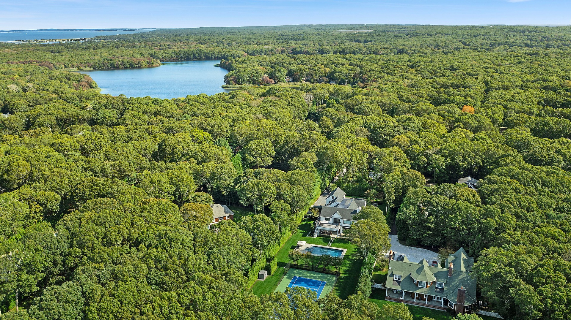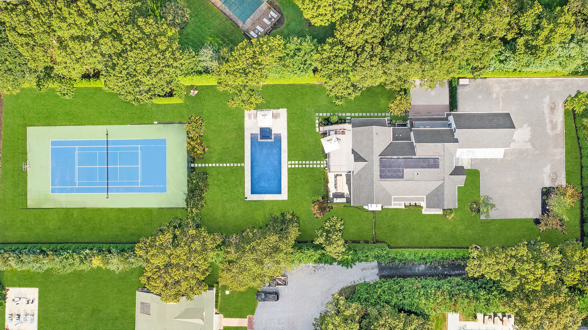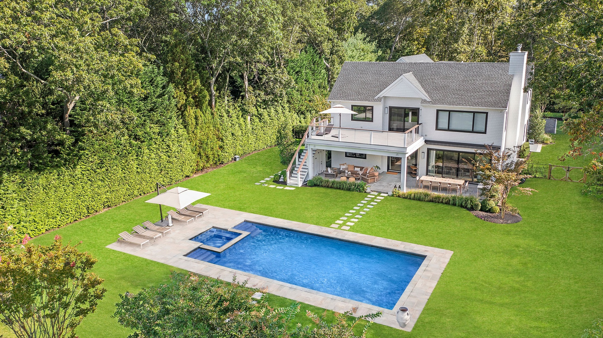 Nestled on a serene 1.3 acre flag lot, this gated estate is enveloped by mature privacy trees and lush, meticulously landscaped grounds creating a true private retreat. Spanning 7,000 square feet across three levels, the residence offers 7 bedrooms and 6.5 baths, thoughtfully designed with six-inch-wide white oak select hardwood flooring throughout. At the heart of the home, the gourmet kitchen showcases premium Sub-Zero and Wolf appliances, including an 8-burner stove, and a striking waterfall edge island with ample seating. Matching stone countertops and backsplash slabs add a touch of modern elegance, while an adjacent private dining area with a glass-front wine closet provides the perfect setting for entertaining. Just off the main living area, a state of the art fitness center opens through a full garage-style glass door into a private garden area, blending indoor and outdoor wellness experiences. Upstairs, the primary suite spans the entire rear of the home, offering tranquil backyard vistas from a wraparound balcony shared with the guest suite. The suite features a spacious sitting area or office alcove, a cozy fireplace, and an expansive custom closets. Three additional bedrooms and a fully equipped laundry room with generous storage and counter space complete this floor. The lower level is designed for leisure and entertainment, featuring a private sauna, theater/media room and two bedrooms with one full bathoom. The home features a state-of-the-art Japanese water filtration system servicing the entire house, delivering exceptionally pure, spa-quality water at every tap. Outdoors, the property transforms into a resort inspired sanctuary with a heated patio area, fire pit lounge, outdoor shower, pickleball and tennis court, and a built in spa integrated into the pool. Combining refined luxury with wellness focused living, this exceptional home offers a one of a kind retreat for relaxation, recreation, and rejuvenation. Only 5 minutes to water access to launch a paddle board or kayak on the peconic bay! **Rental includes use of an Escalade truck with Town of Southampton Beach Parking Pass!**