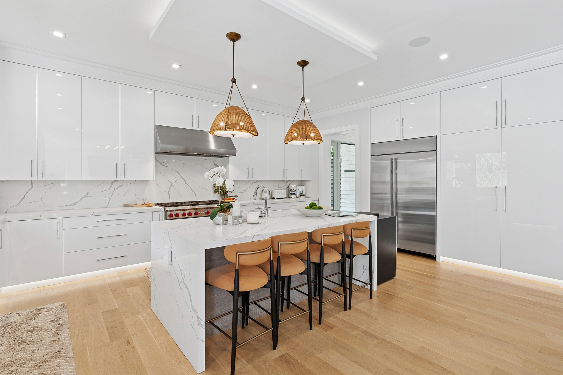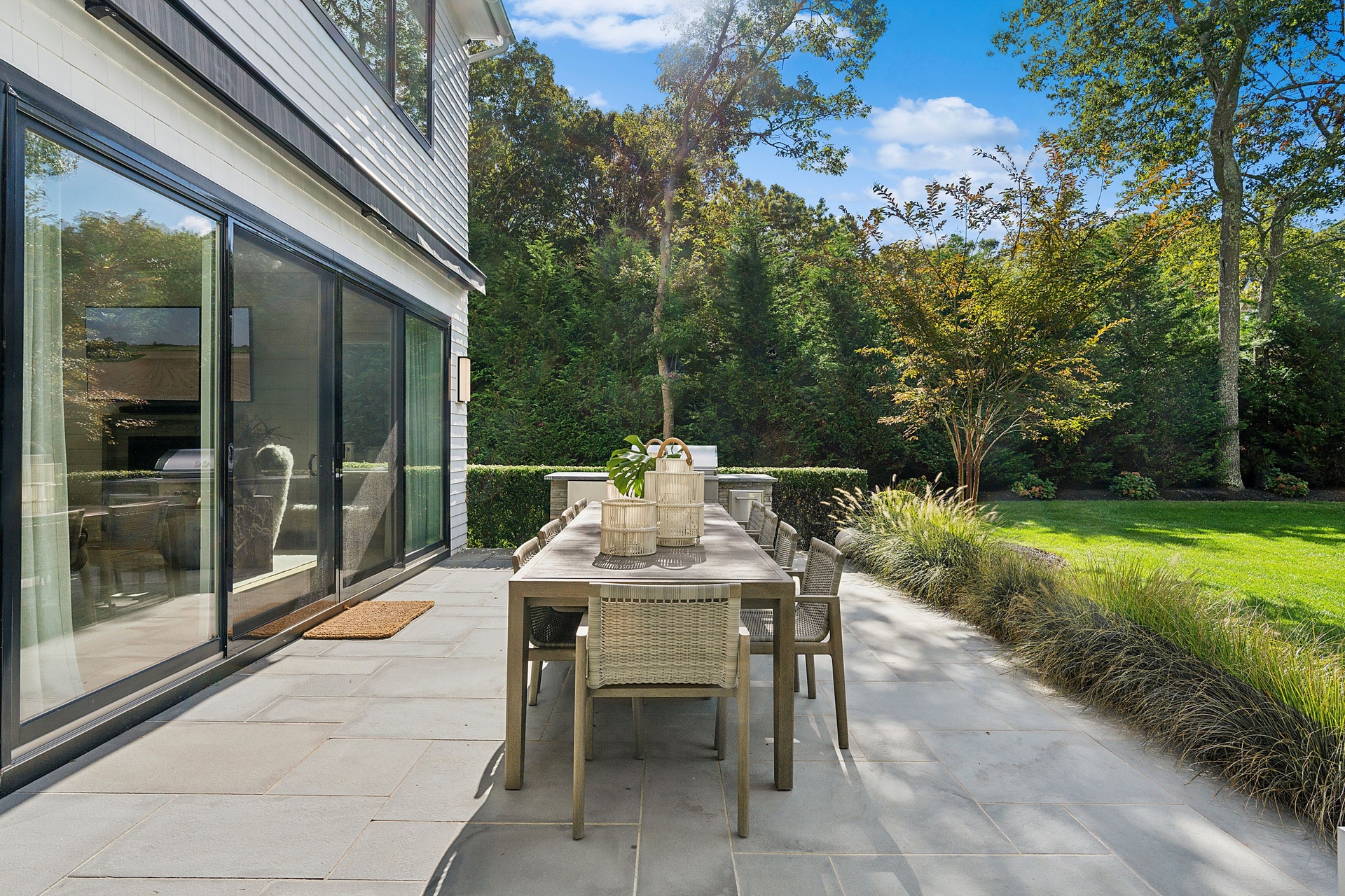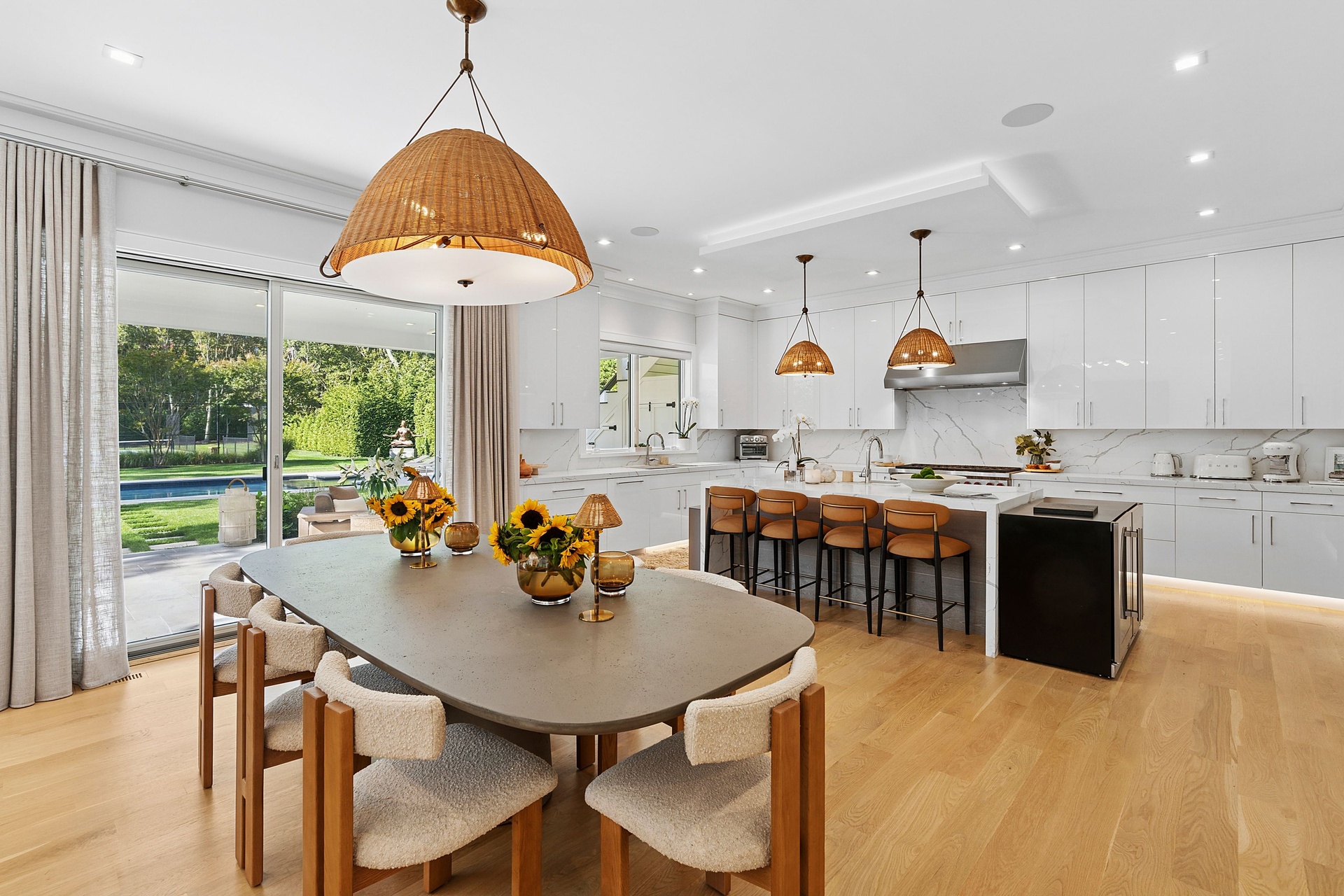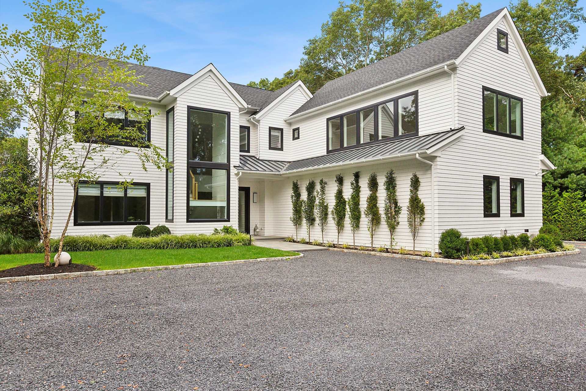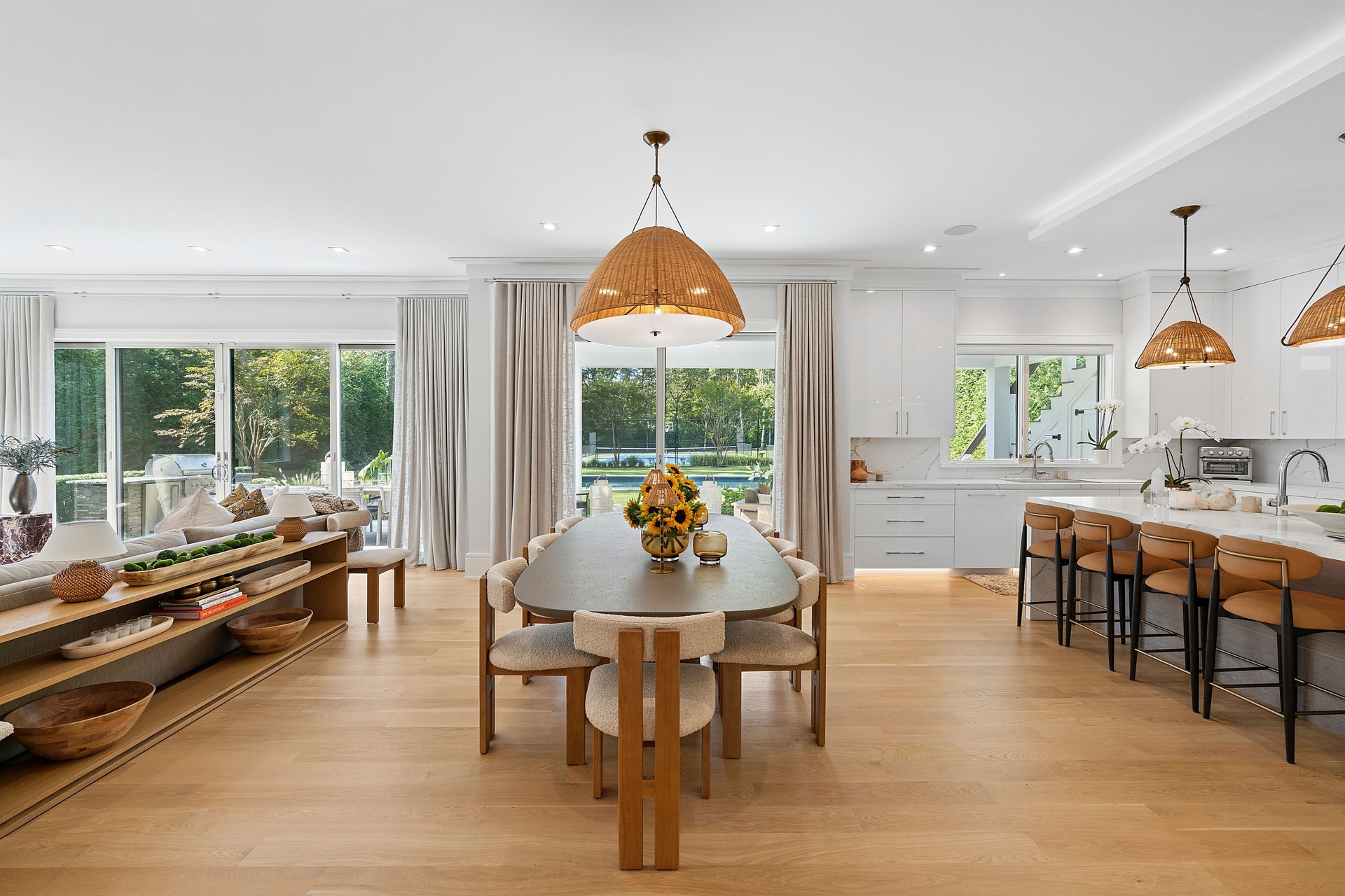 Nestled on a serene 1.3 acre flag lot, this gated estate is enveloped by mature privacy trees and lush, meticulously landscaped grounds creating a true private retreat. Spanning 7,000 square feet across three levels, the residence offers 7 bedrooms and 6.5 baths, thoughtfully designed with six-inch-wide white oak select hardwood flooring throughout. At the heart of the home, the gourmet kitchen showcases premium Sub-Zero and Wolf appliances, including an 8-burner stove, and a striking waterfall edge island with ample seating. Matching stone countertops and backsplash slabs add a touch of modern elegance, while an adjacent private dining area with a glass-front wine closet provides the perfect setting for entertaining. Just off the main living area, a state of the art fitness center opens through a full garage-style glass door into a private garden area, blending indoor and outdoor wellness experiences. Upstairs, the primary suite spans the entire rear of the home, offering tranquil backyard vistas from a wraparound balcony shared with the guest suite. The suite features a spacious sitting area or office alcove, a cozy fireplace, and an expansive custom closets. Three additional bedrooms and a fully equipped laundry room with generous storage and counter space complete this floor. The lower level is designed for leisure and entertainment, featuring a private sauna, theater/media room and two bedrooms with one full bathoom. The home features a state-of-the-art Japanese water filtration system servicing the entire house, delivering exceptionally pure, spa-quality water at every tap. Outdoors, the property transforms into a resort inspired sanctuary with a heated patio area, fire pit lounge, outdoor shower, pickleball and tennis court, and a built in spa integrated into the pool. Combining refined luxury with wellness focused living, this exceptional home offers a one of a kind retreat for relaxation, recreation, and rejuvenation. Only 5 minutes to water access to launch a paddle board or kayak on the peconic bay! **Rental includes use of an Escalade truck with Town of Southampton Beach Parking Pass!**