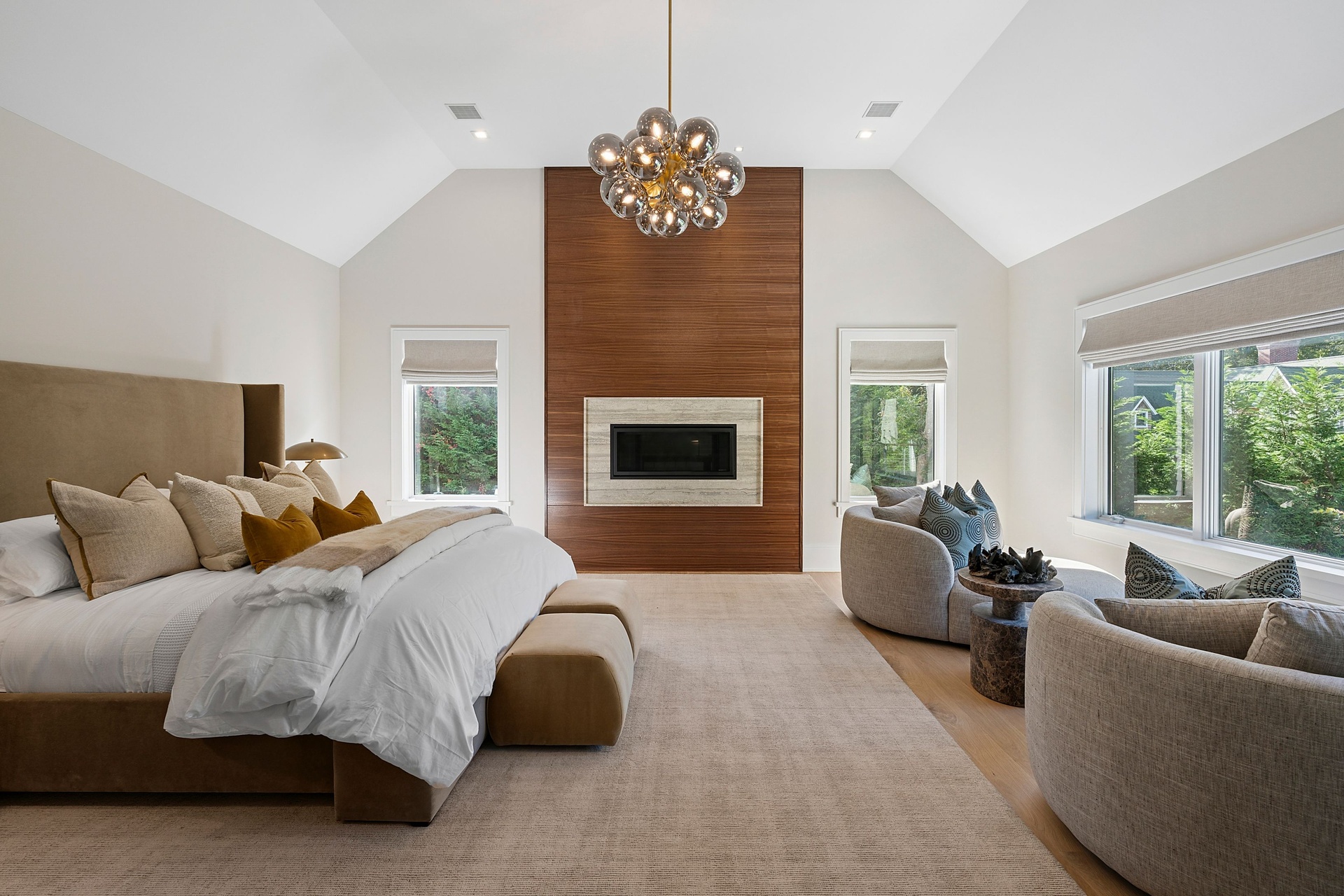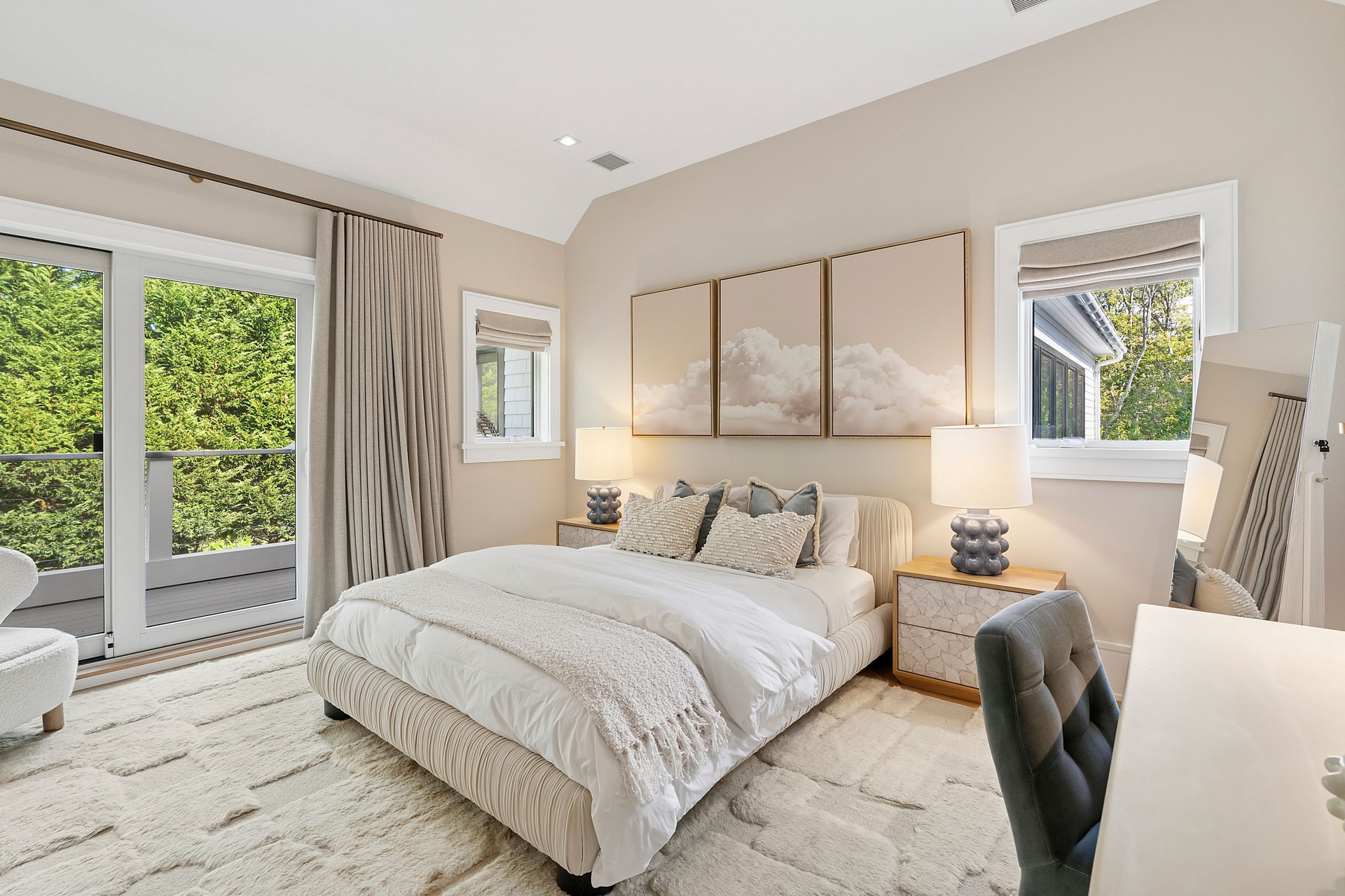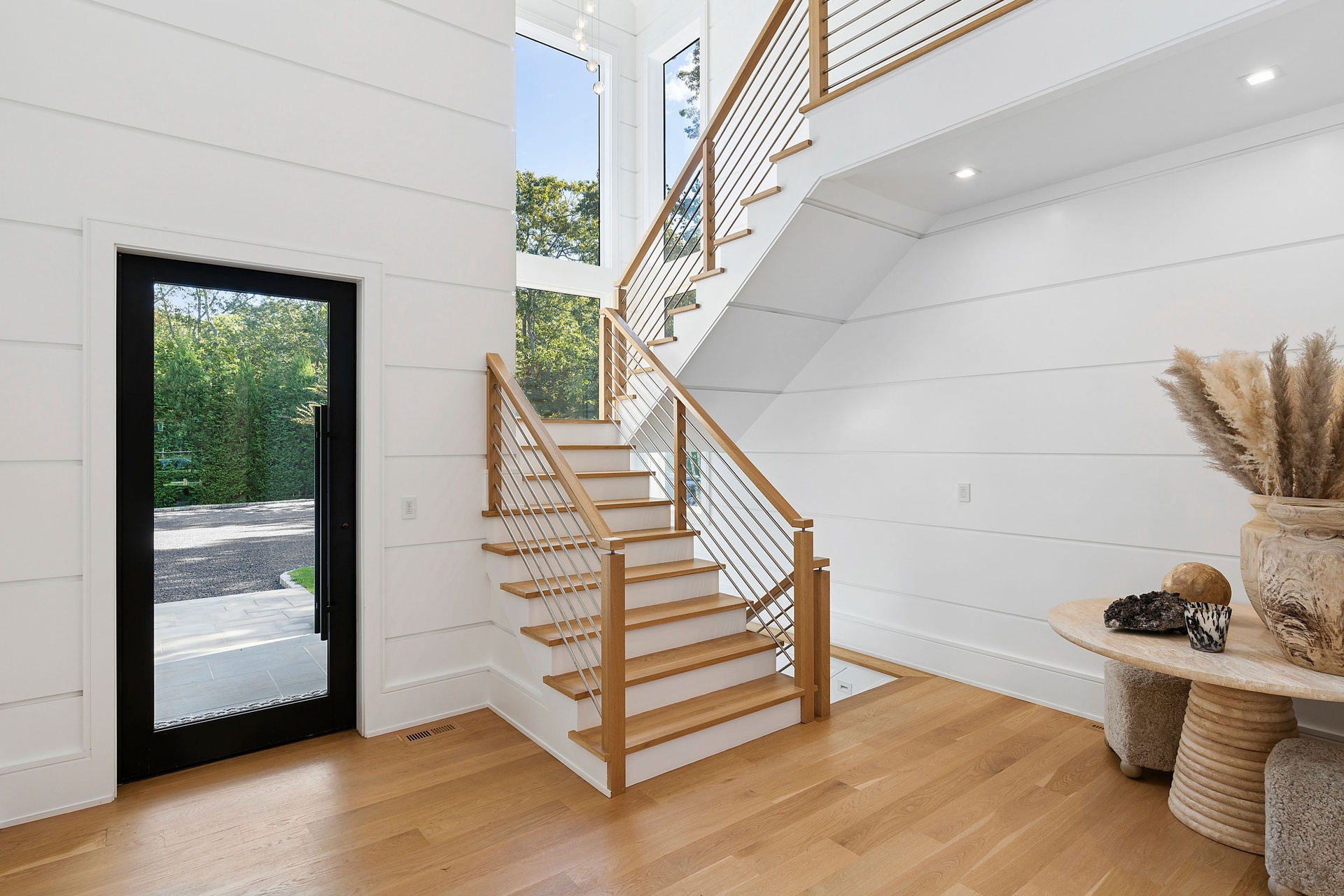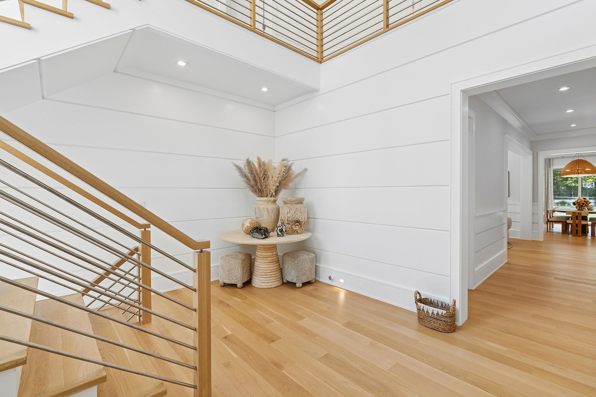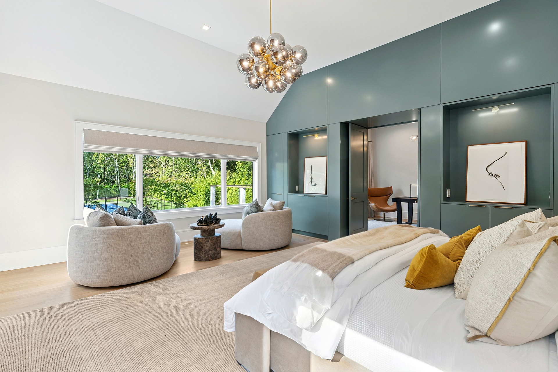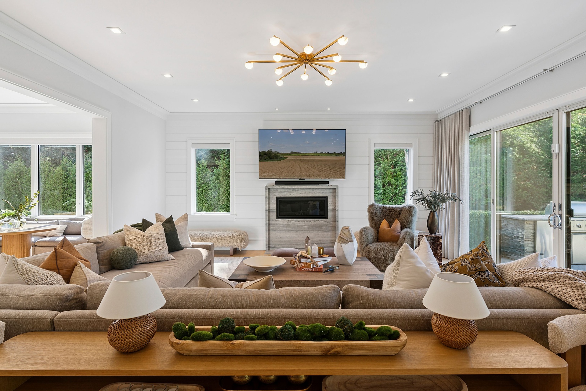 Nestled on a serene 1.3 acre flag lot, this gated estate is enveloped by mature privacy trees and lush, meticulously landscaped grounds creating a true private retreat. Spanning 7,000 square feet across three levels, the residence offers 7 bedrooms and 6.5 baths, thoughtfully designed with six-inch-wide white oak select hardwood flooring throughout. At the heart of the home, the gourmet kitchen showcases premium Sub-Zero and Wolf appliances, including an 8-burner stove, and a striking waterfall edge island with ample seating. Matching stone countertops and backsplash slabs add a touch of modern elegance, while an adjacent private dining area with a glass-front wine closet provides the perfect setting for entertaining. Just off the main living area, a state of the art fitness center opens through a full garage-style glass door into a private garden area, blending indoor and outdoor wellness experiences. Upstairs, the primary suite spans the entire rear of the home, offering tranquil backyard vistas from a wraparound balcony shared with the guest suite. The suite features a spacious sitting area or office alcove, a cozy fireplace, and an expansive custom closets. Three additional bedrooms and a fully equipped laundry room with generous storage and counter space complete this floor. The lower level is designed for leisure and entertainment, featuring a private sauna, theater/media room and two bedrooms with one full bathoom. The home features a state-of-the-art Japanese water filtration system servicing the entire house, delivering exceptionally pure, spa-quality water at every tap. Outdoors, the property transforms into a resort inspired sanctuary with a heated patio area, fire pit lounge, outdoor shower, pickleball and tennis court, and a built in spa integrated into the pool. Combining refined luxury with wellness focused living, this exceptional home offers a one of a kind retreat for relaxation, recreation, and rejuvenation. Only 5 minutes to water access to launch a paddle board or kayak on the peconic bay! **Rental includes use of an Escalade truck with Town of Southampton Beach Parking Pass!**