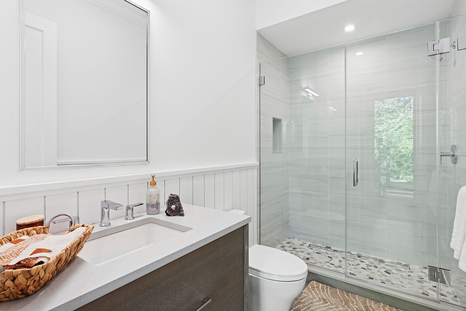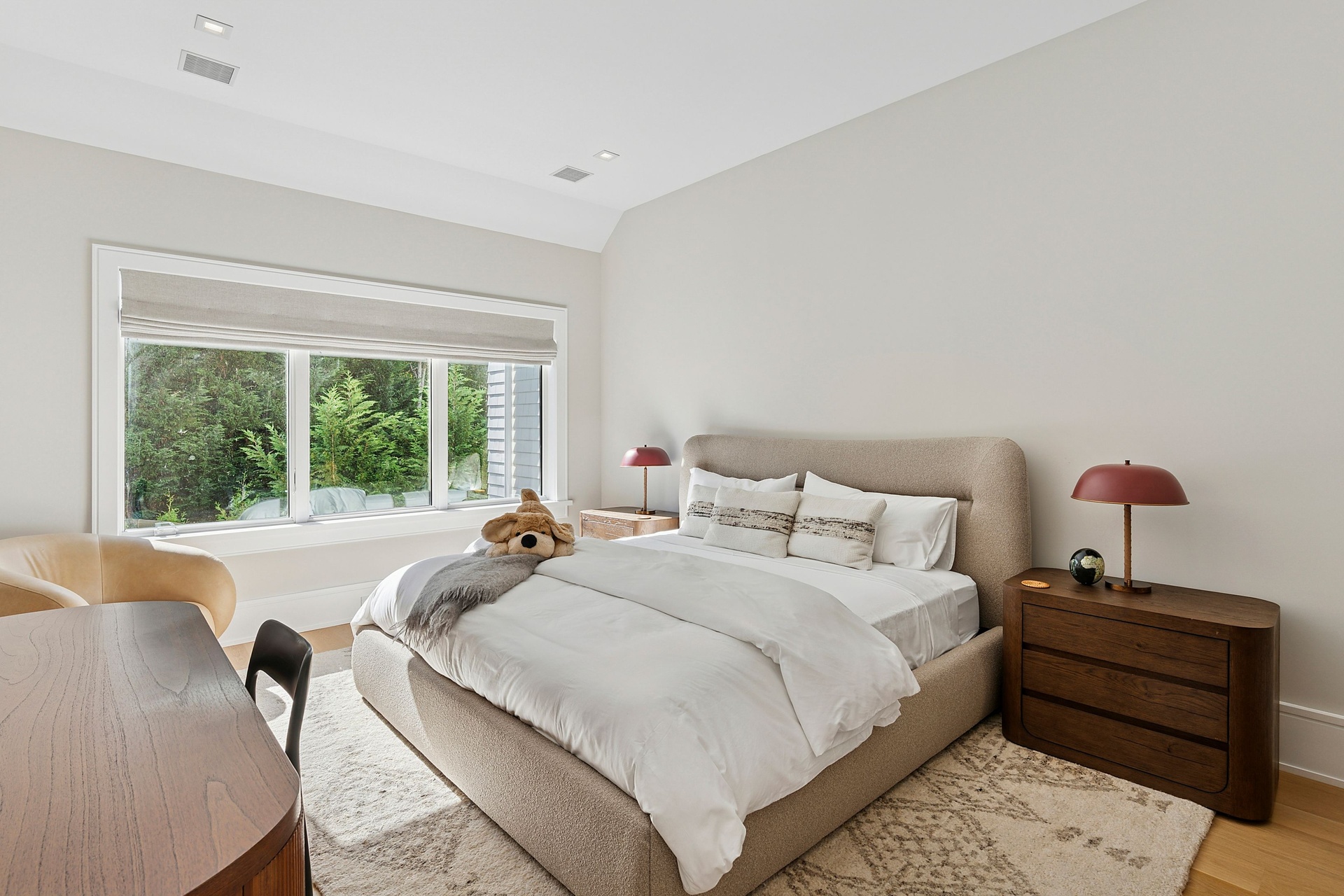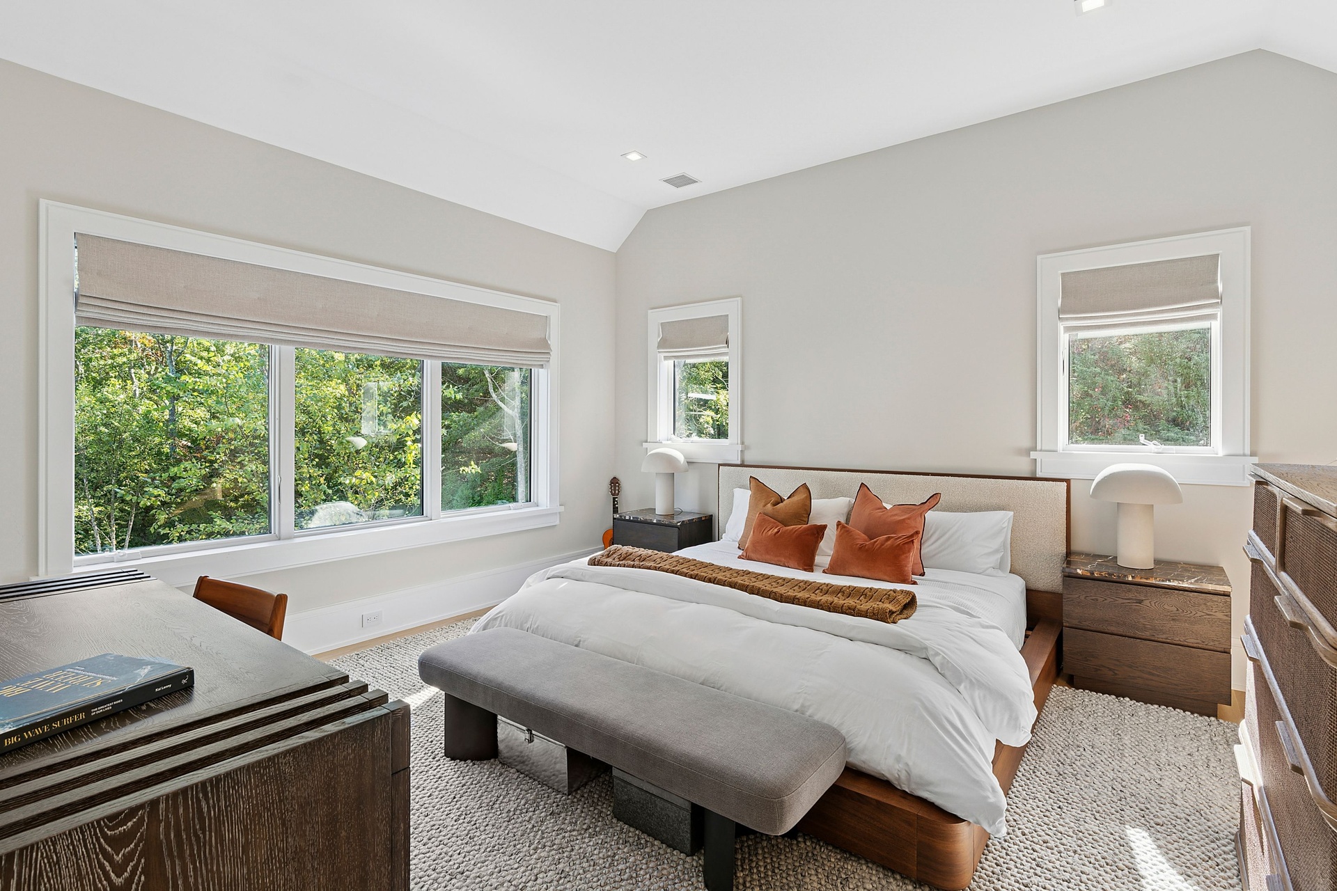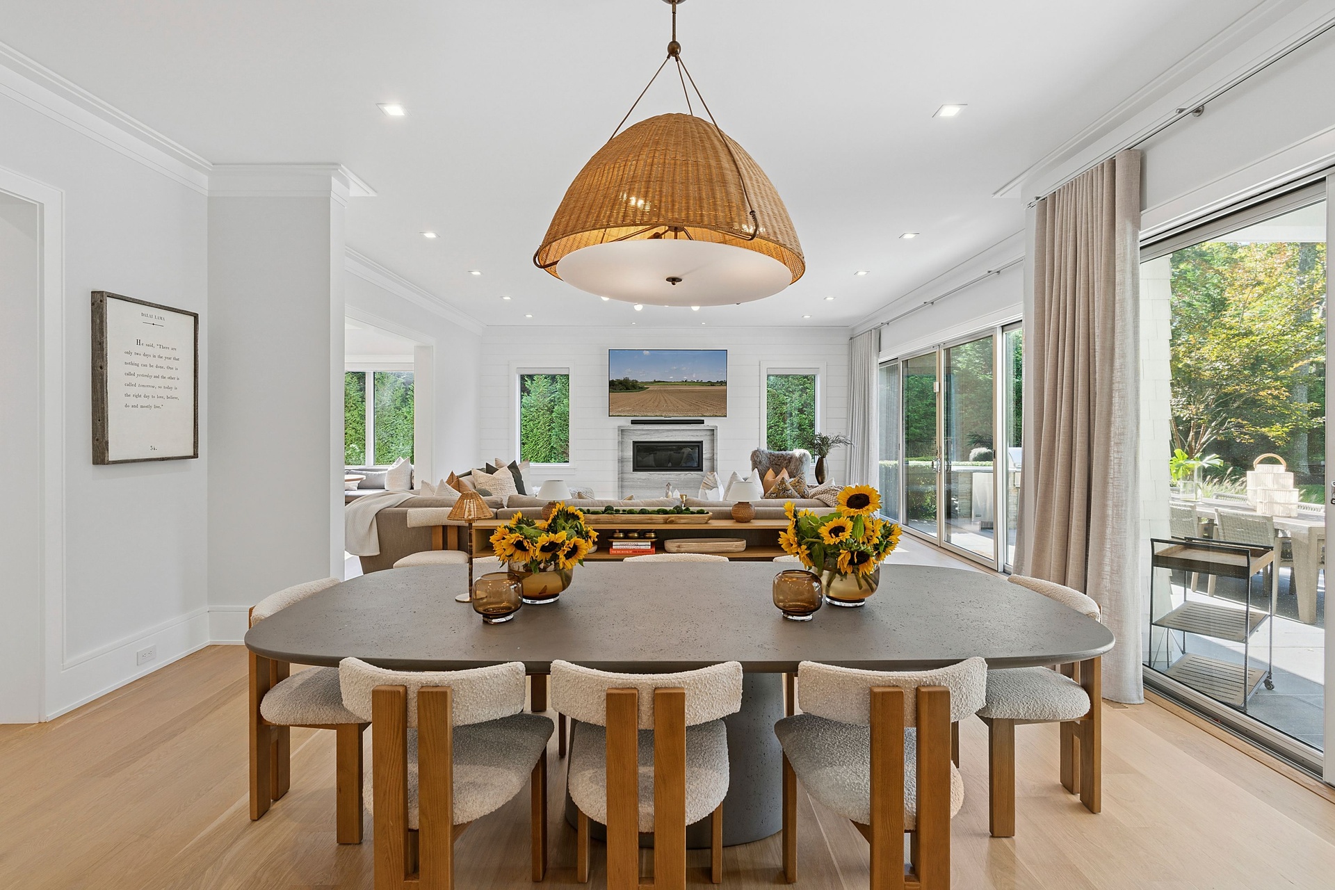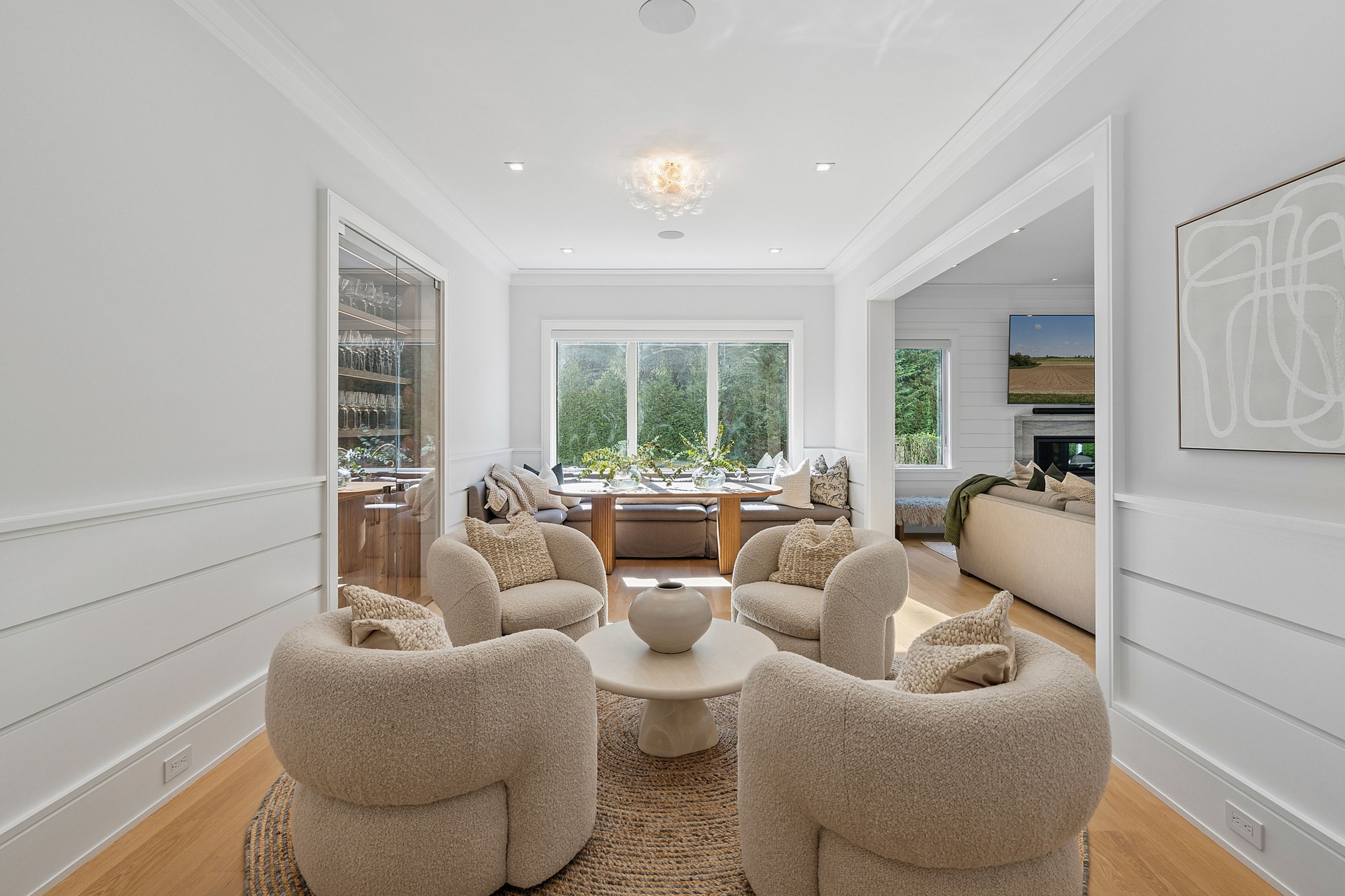 Nestled on a serene 1.3 acre flag lot, this gated estate is enveloped by mature privacy trees and lush, meticulously landscaped grounds creating a true private retreat. Spanning 7,000 square feet across three levels, the residence offers 7 bedrooms and 6.5 baths, thoughtfully designed with six-inch-wide white oak select hardwood flooring throughout. At the heart of the home, the gourmet kitchen showcases premium Sub-Zero and Wolf appliances, including an 8-burner stove, and a striking waterfall edge island with ample seating. Matching stone countertops and backsplash slabs add a touch of modern elegance, while an adjacent private dining area with a glass-front wine closet provides the perfect setting for entertaining. Just off the main living area, a state of the art fitness center opens through a full garage-style glass door into a private garden area, blending indoor and outdoor wellness experiences. Upstairs, the primary suite spans the entire rear of the home, offering tranquil backyard vistas from a wraparound balcony shared with the guest suite. The suite features a spacious sitting area or office alcove, a cozy fireplace, and an expansive custom closets. Three additional bedrooms and a fully equipped laundry room with generous storage and counter space complete this floor. The lower level is designed for leisure and entertainment, featuring a private sauna, theater/media room and two bedrooms with one full bathoom. The home features a state-of-the-art Japanese water filtration system servicing the entire house, delivering exceptionally pure, spa-quality water at every tap. Outdoors, the property transforms into a resort inspired sanctuary with a heated patio area, fire pit lounge, outdoor shower, pickleball and tennis court, and a built in spa integrated into the pool. Combining refined luxury with wellness focused living, this exceptional home offers a one of a kind retreat for relaxation, recreation, and rejuvenation. Only 5 minutes to water access to launch a paddle board or kayak on the peconic bay! **Rental includes use of an Escalade truck with Town of Southampton Beach Parking Pass!**