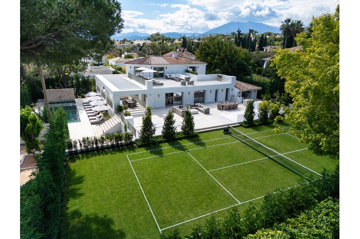 It stands out as one of the only homes on the Golden Mile with a full-size private grass tennis court. Inside, the layout features bright open-plan living spaces, a high-spec kitchen and a variety of comfortable lounge areas.