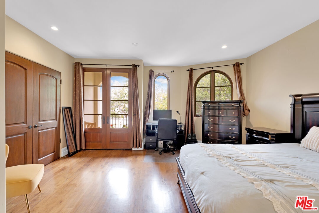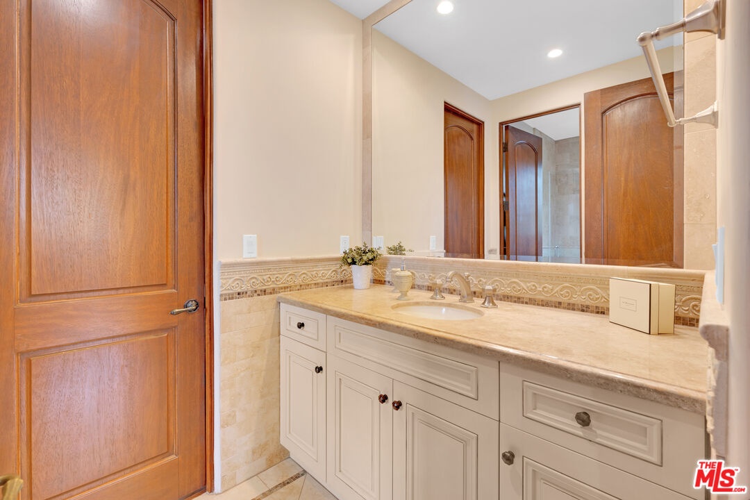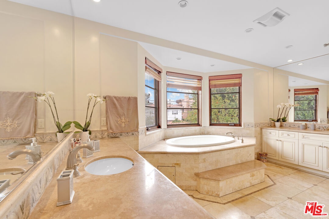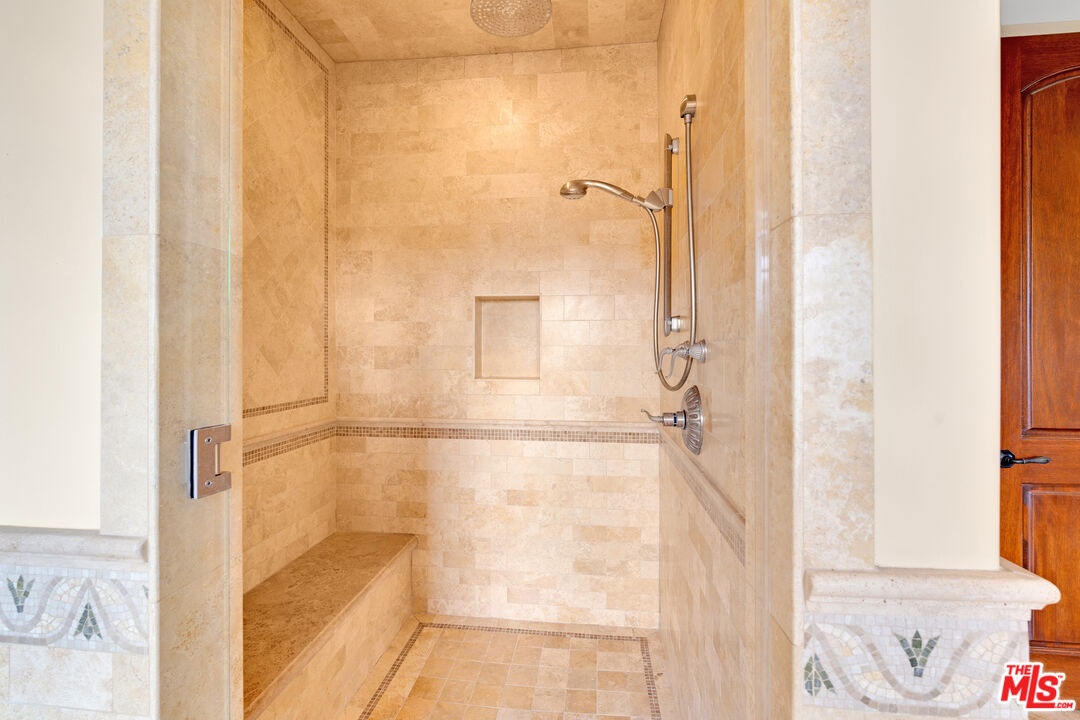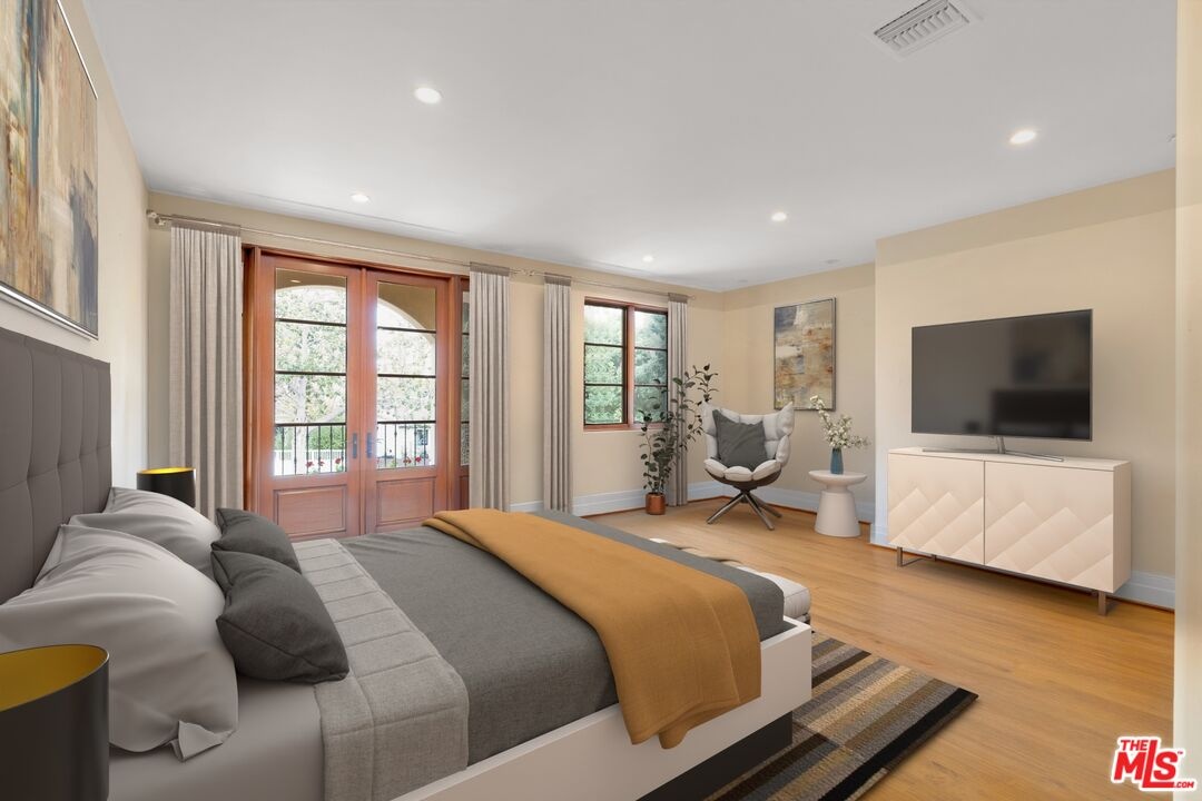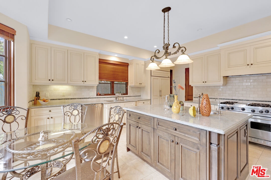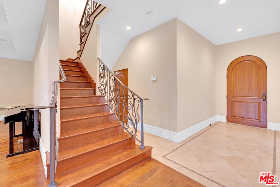Nestled on a quiet, tree-lined street in the coveted Brentwood neighborhood, this beautiful four-bedroom, five-bathroom Tuscan-style home blends luxury with everyday comfort. With 3,933 square feet of living space, the property sits behind a wide secured gated driveway that offers both privacy and curb appeal. Curved arches, lush hedges, and timeless details create a warm and inviting first impression. Inside, high ceilings, travertine stone, and thoughtful finishes set the tone. The entry opens to a bright office overlooking the front garden. The spacious great room features a striking fireplace and flows effortlessly into the family room, the gourmet kitchen, and the backyard perfect for indoor-outdoor living. The kitchen includes a large stone island, a cozy breakfast nook, a Miele dishwasher, a Sub-Zero refrigerator, and a convenient butler's pantry that connects directly to the expansive dining room with its custom 12-person table and wet bar. Upstairs, a skylit hallway leads to a laundry room, a second den with a private balcony, and four upstairs bedroom suites. The primary suite is a true retreat, complete with a gas fireplace, a private balcony overlooking the backyard, a spa-like bathroom with dual sinks, a glass-enclosed shower, a soaking tub, and a generous walk-in closet.The backyard is ideal for entertaining, offering a dining terrace and mature cypress trees that enhance the home's seamless indoor-outdoor lifestyle. Parking for up to four cars is available between the two-car garage and gated driveway, which also features a Tesla charger. Additional security includes 24/7 neighborhood street cameras, a Ring door camera, and full property gating with secure entry. Just moments from top San Vicente restaurants and shopsincluding Katsuya, Baltaire, Great White, Coral Tree, Whole Foods, S Bar, and the Farmers Market this home captures the best of modern Brentwood living with easy access to Brentwood Village and Santa Monica. Available semi-furnished; photos are virtually staged.