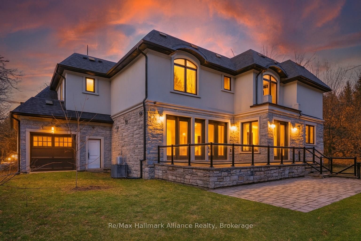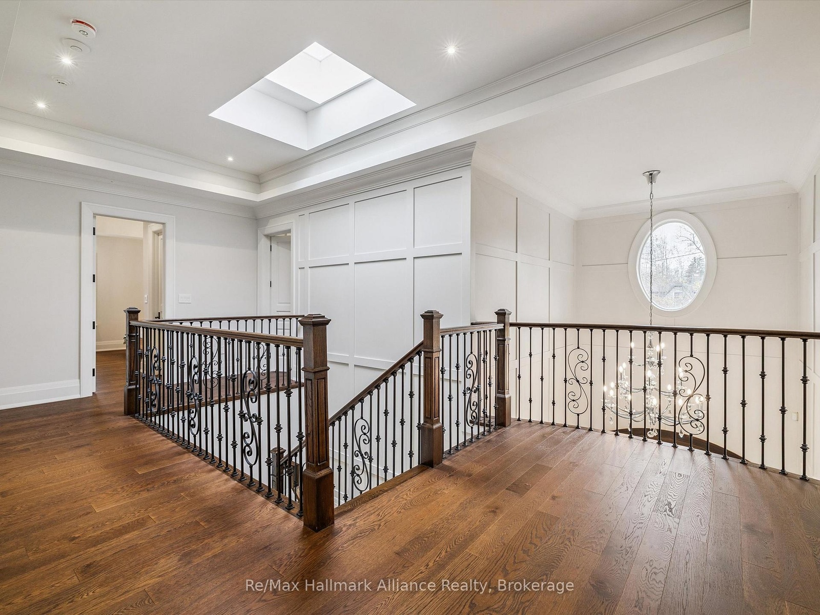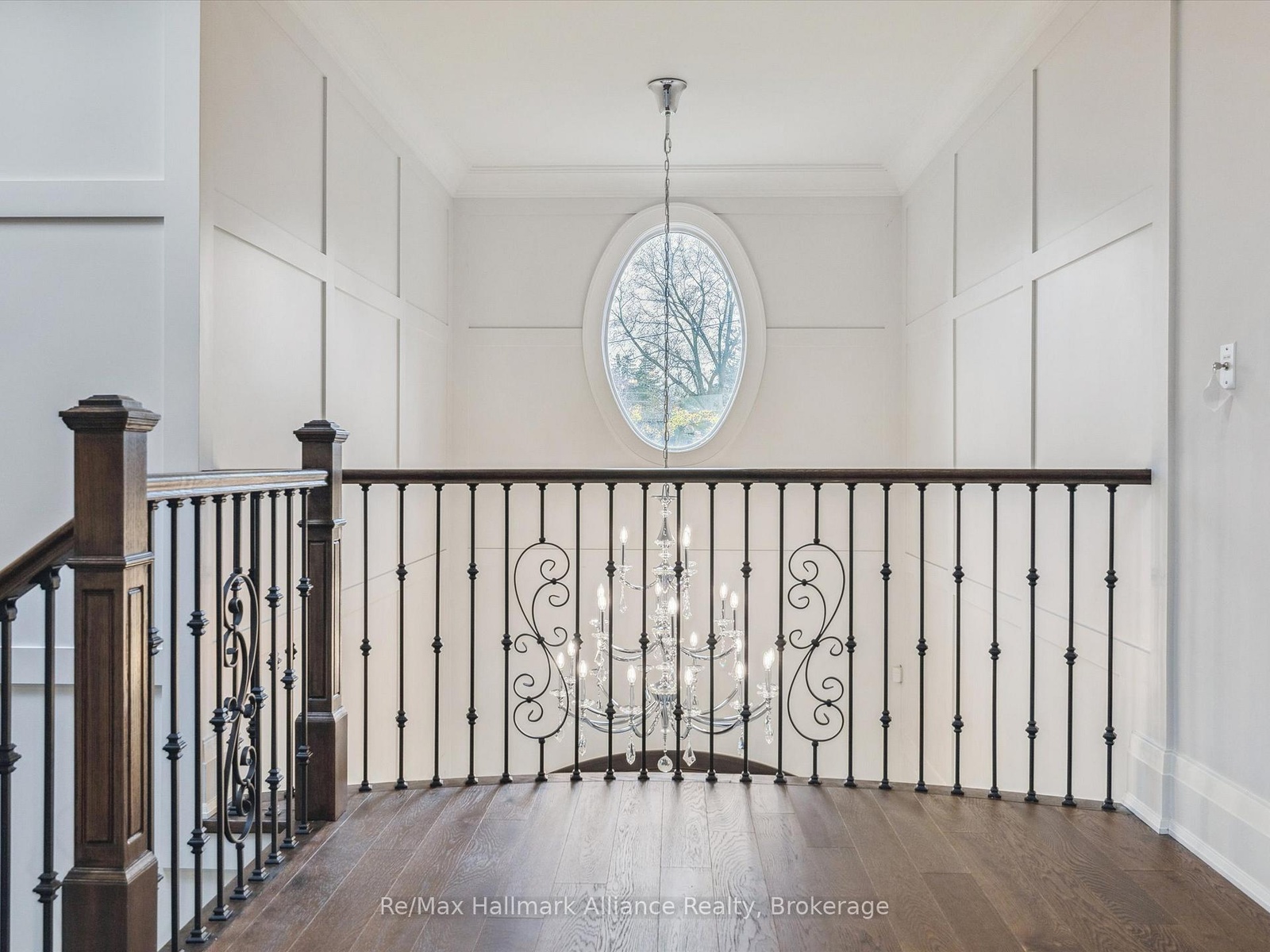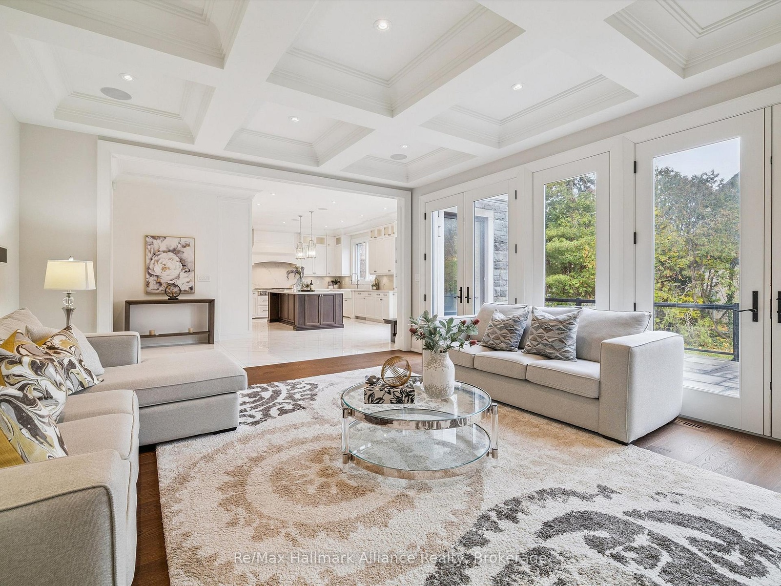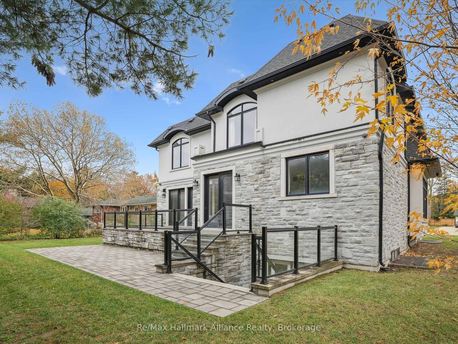 Welcome to this elegant custom-built french chateau ideally situated on a quiet, child-safe street with no sidewalk in the heart of South East Oakville. Thoughtfully designed and meticulously crafted by the original owner to the highest standards of quality, this home showcases refined architectural detail, timeless elegance, and a highly functional layout. Step inside to discover rare 10-foot ceilings on all three levels and a magnificent 20-foot two-storey great room with oversized floor-to-ceiling windows that fill the home with natural light. The interior exudes sophistication with extensive panelled wall detailing, custom crown mouldings, and varied ceiling designs in every principal room. A large custom skylight on the upper floor enhances the home's bright, airy ambiance.The main floor home office, beautifully appointed with custom walnut built-ins, provides a distinguished workspace. The gourmet eat-in kitchen is a chef's dream, featuring a large centre island, premium custom cabinetry, top-of-the-line appliances, and a walk-in pantry with a servery-all seamlessly open to the breakfast area and family room for effortless family living and entertaining.The upper level offers four generous bedrooms, each with its own private ensuite bathroom and 10-foot high tray ceilings, along with a convenient upper-level laundry room.The walk-out lower level extends the living space with a spacious recreation room, exercise room, guest bedroom, full bathroom, and bar area, along with abundant storage space.This residence also includes built-in speakers throughout, security cameras, an alarm system, and a natural stone exterior. The extra-long driveway accommodates 8+ cars, offering both practicality and curb appeal. A rare combination of luxury, comfort, and location, this exceptional home embodies the best of South East Oakville living - just 600 metres from top-rated schools, walk to the lake, parks, and other amenities, all in one of the area's most coveted settings.