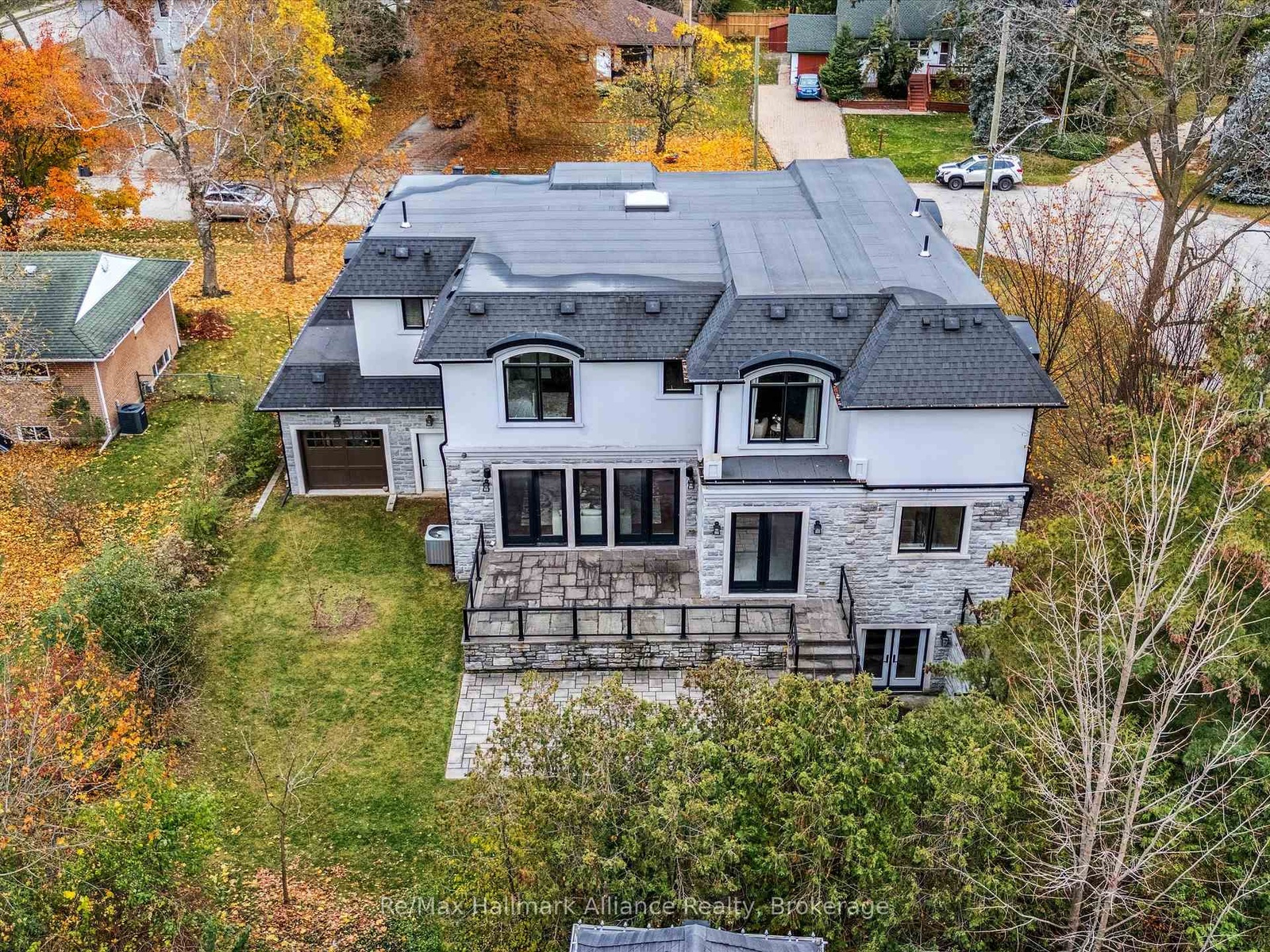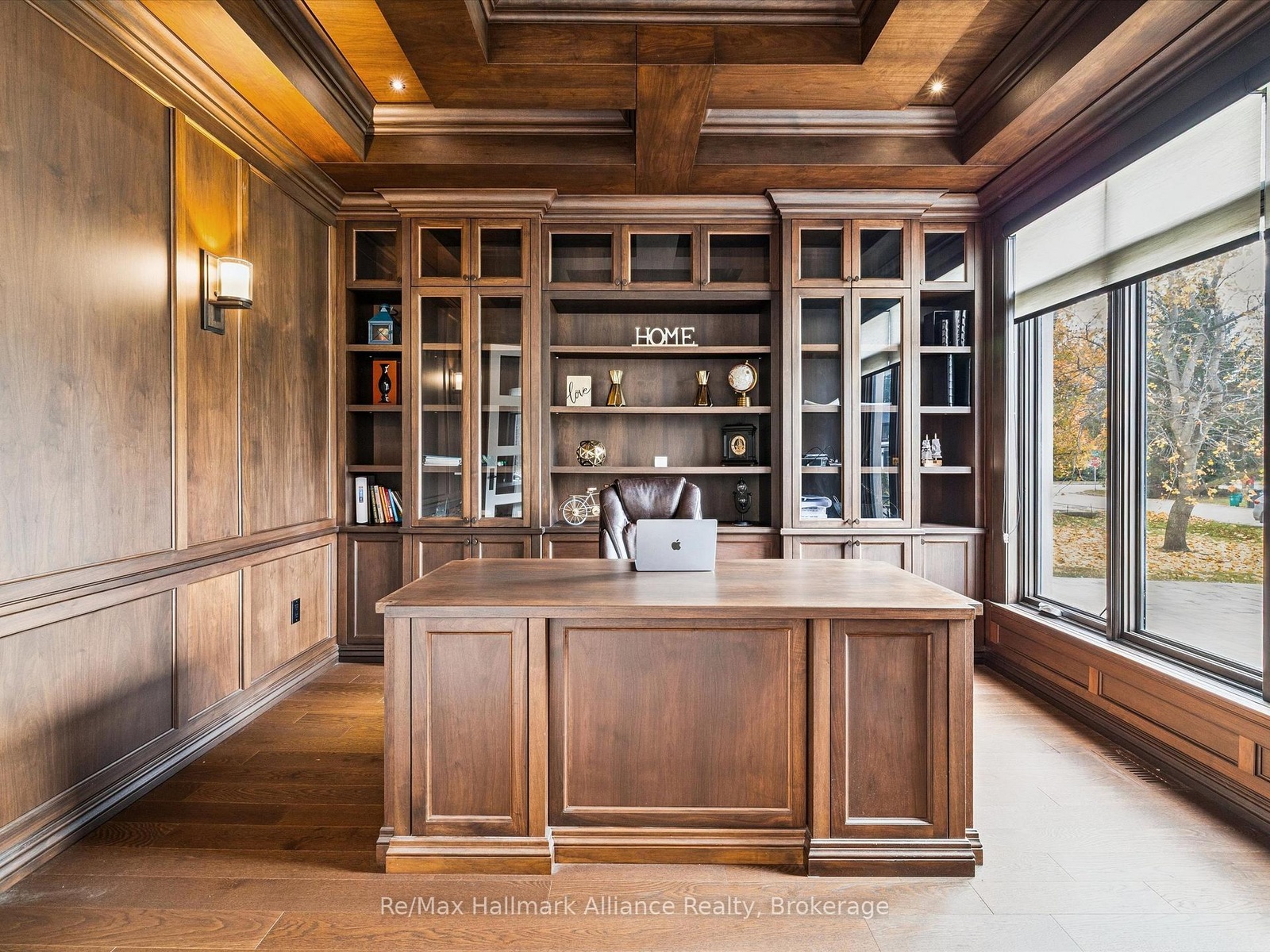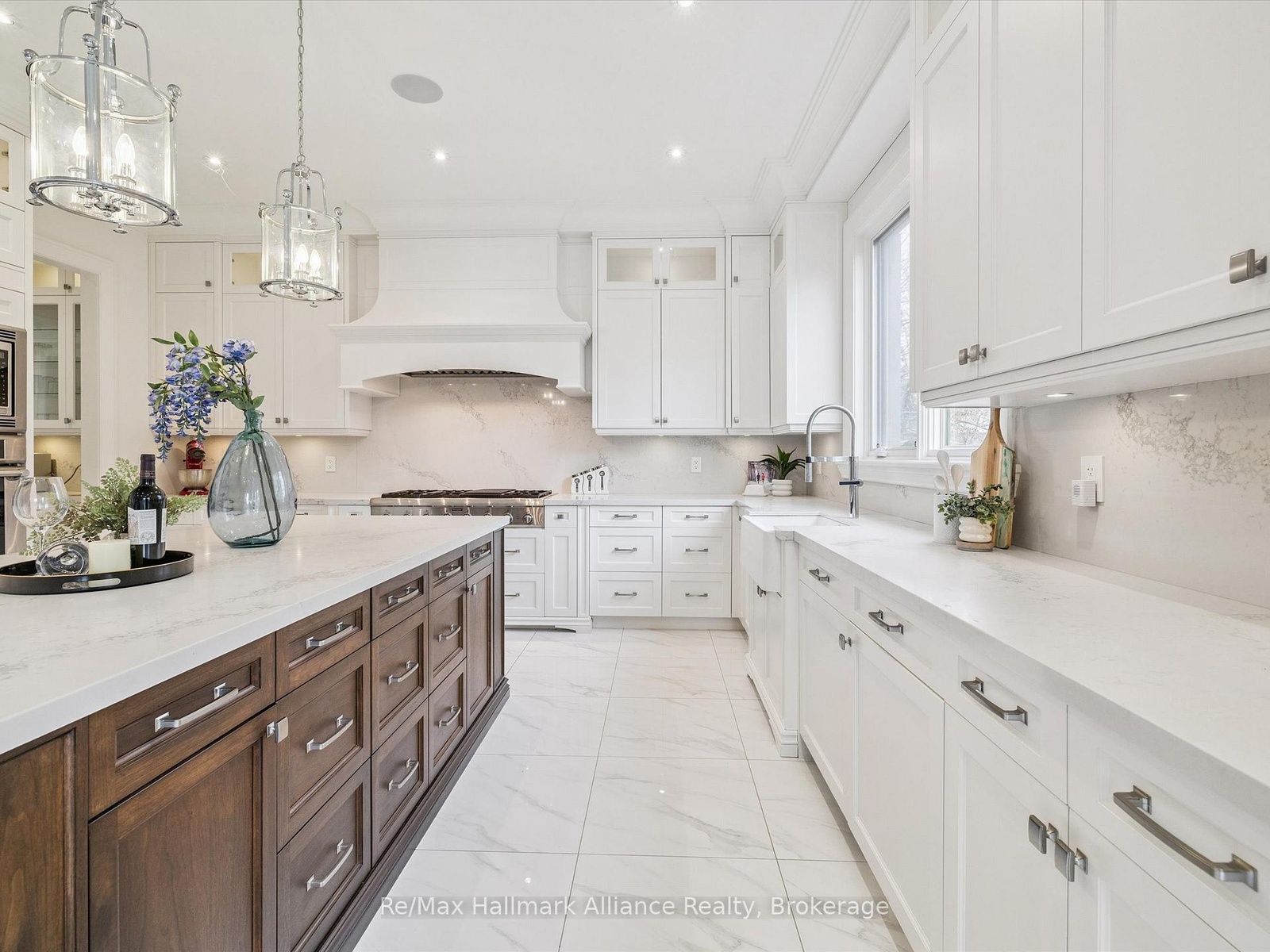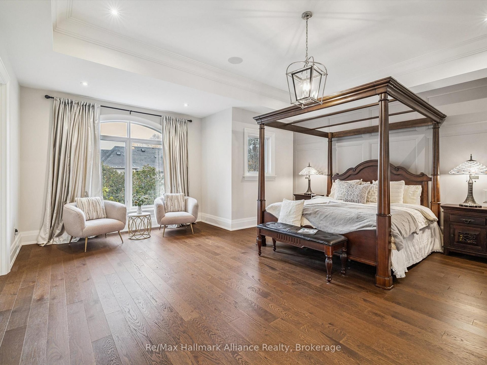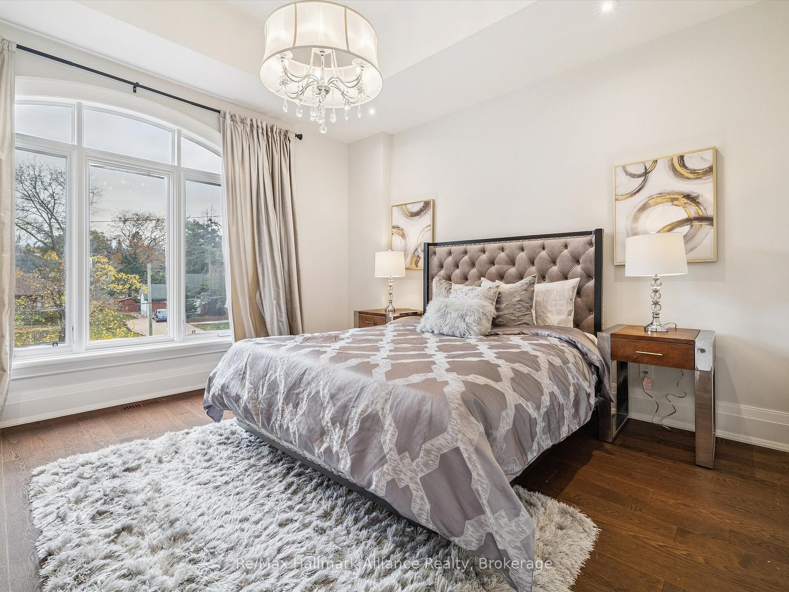 Welcome to this elegant custom-built french chateau ideally situated on a quiet, child-safe street with no sidewalk in the heart of South East Oakville. Thoughtfully designed and meticulously crafted by the original owner to the highest standards of quality, this home showcases refined architectural detail, timeless elegance, and a highly functional layout. Step inside to discover rare 10-foot ceilings on all three levels and a magnificent 20-foot two-storey great room with oversized floor-to-ceiling windows that fill the home with natural light. The interior exudes sophistication with extensive panelled wall detailing, custom crown mouldings, and varied ceiling designs in every principal room. A large custom skylight on the upper floor enhances the home's bright, airy ambiance.The main floor home office, beautifully appointed with custom walnut built-ins, provides a distinguished workspace. The gourmet eat-in kitchen is a chef's dream, featuring a large centre island, premium custom cabinetry, top-of-the-line appliances, and a walk-in pantry with a servery-all seamlessly open to the breakfast area and family room for effortless family living and entertaining.The upper level offers four generous bedrooms, each with its own private ensuite bathroom and 10-foot high tray ceilings, along with a convenient upper-level laundry room.The walk-out lower level extends the living space with a spacious recreation room, exercise room, guest bedroom, full bathroom, and bar area, along with abundant storage space.This residence also includes built-in speakers throughout, security cameras, an alarm system, and a natural stone exterior. The extra-long driveway accommodates 8+ cars, offering both practicality and curb appeal. A rare combination of luxury, comfort, and location, this exceptional home embodies the best of South East Oakville living - just 600 metres from top-rated schools, walk to the lake, parks, and other amenities, all in one of the area's most coveted settings.