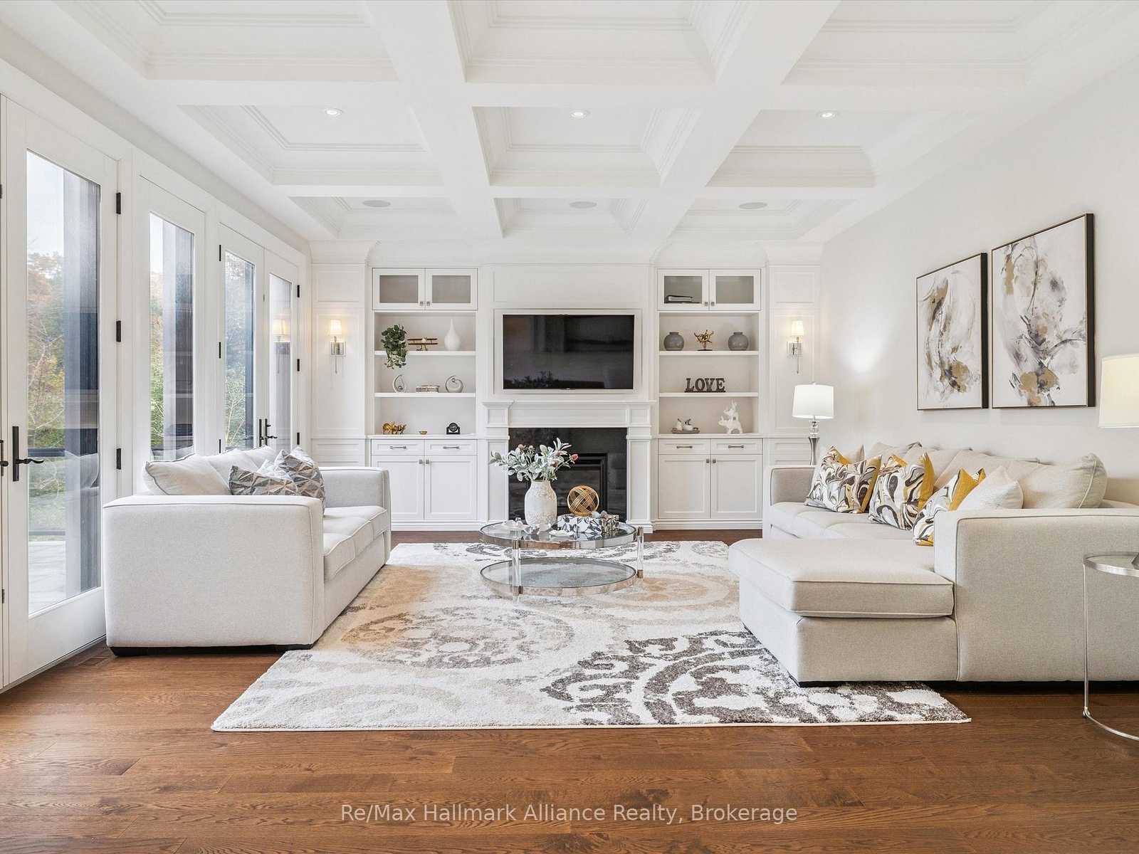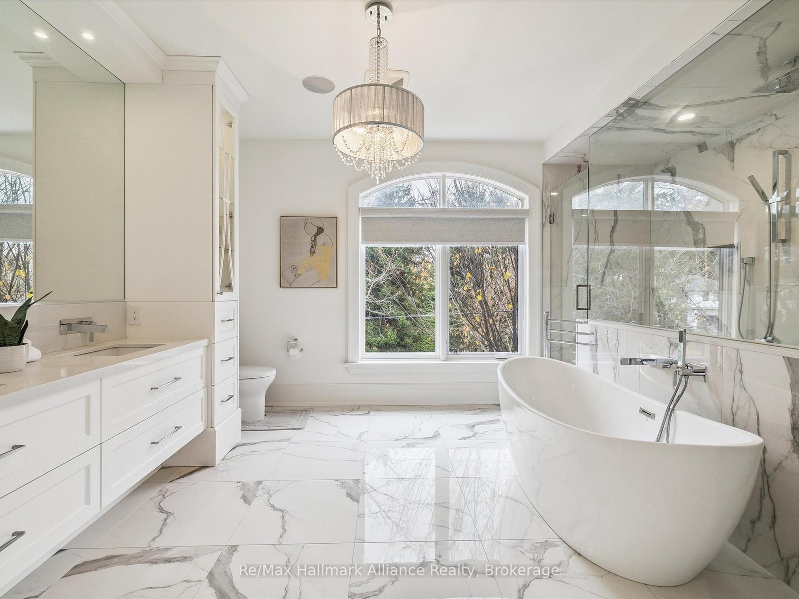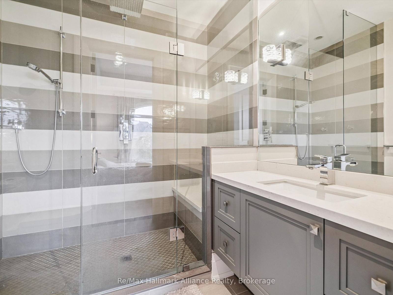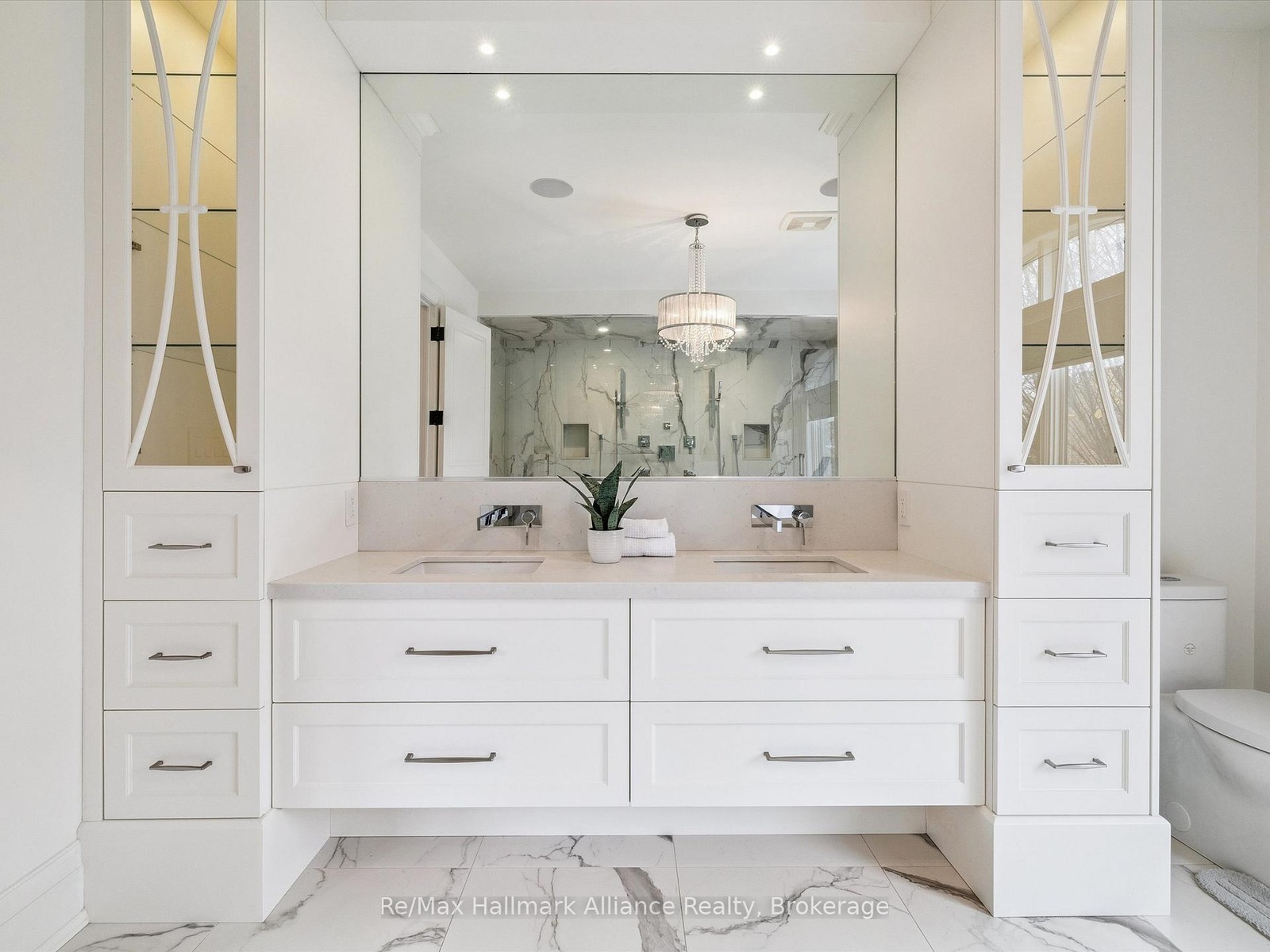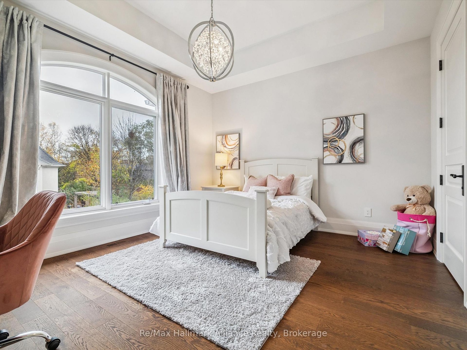 Welcome to this elegant custom-built french chateau ideally situated on a quiet, child-safe street with no sidewalk in the heart of South East Oakville. Thoughtfully designed and meticulously crafted by the original owner to the highest standards of quality, this home showcases refined architectural detail, timeless elegance, and a highly functional layout. Step inside to discover rare 10-foot ceilings on all three levels and a magnificent 20-foot two-storey great room with oversized floor-to-ceiling windows that fill the home with natural light. The interior exudes sophistication with extensive panelled wall detailing, custom crown mouldings, and varied ceiling designs in every principal room. A large custom skylight on the upper floor enhances the home's bright, airy ambiance.The main floor home office, beautifully appointed with custom walnut built-ins, provides a distinguished workspace. The gourmet eat-in kitchen is a chef's dream, featuring a large centre island, premium custom cabinetry, top-of-the-line appliances, and a walk-in pantry with a servery-all seamlessly open to the breakfast area and family room for effortless family living and entertaining.The upper level offers four generous bedrooms, each with its own private ensuite bathroom and 10-foot high tray ceilings, along with a convenient upper-level laundry room.The walk-out lower level extends the living space with a spacious recreation room, exercise room, guest bedroom, full bathroom, and bar area, along with abundant storage space.This residence also includes built-in speakers throughout, security cameras, an alarm system, and a natural stone exterior. The extra-long driveway accommodates 8+ cars, offering both practicality and curb appeal. A rare combination of luxury, comfort, and location, this exceptional home embodies the best of South East Oakville living - just 600 metres from top-rated schools, walk to the lake, parks, and other amenities, all in one of the area's most coveted settings.
