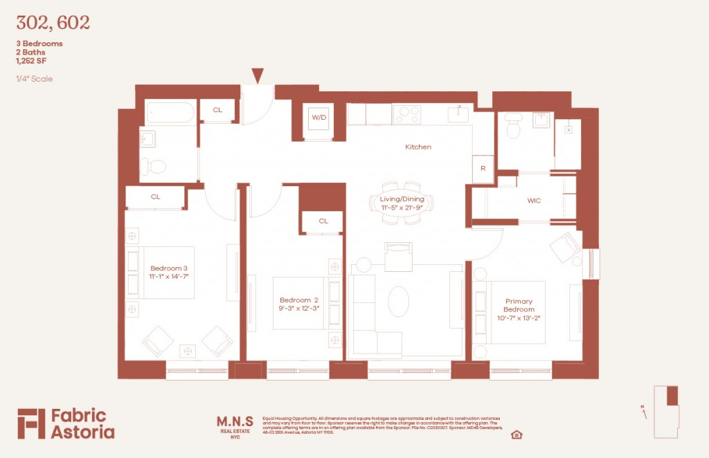 MULTIPLE INCENTIVES NOW OFFERED!- Receive $40,000 in closing costs*- Ask about our free parking*Schedule your exclusive tour in Astoria’s latest 20 YEAR TAX ABATED** condominium.Discover a timeless 3-bedroom, 2-bathroom residence waiting for you at Fabric Astoria. Inside, three generously sized bedrooms await, including a primary suite with an en-suite bathroom and a fully customized walk-in closet. The open kitchen, living, and dining area create a seamless flow of light and air throughout the home.Weaving contemporary design and exceptional amenities into its accessible Astoria location, Fabric Astoria offers 35 one through three-bedroom condominium residences. Featuring brand-new quality construction, with a robust collection of indoor and outdoor amenities, this one-of-a-kind residence elevates the concept of Queens living with a full lifestyle offering of quality design, shared community, and a culturally vibrant neighborhood.Fabric Astoria residences feature large windows, open plan layouts, modern kitchens with top-of-the-line appliances and hand-picked finishes, an in-unit washer and dryer, and bright, sun-filled views of the city skyline or landscaped courtyard. Attention to detail is paramount, from the herringbone-pattern oak floors and built-in blinds to the high-technology Carson app that manages packages, maintenance, apartment access, and more.Fabric Astoria offers over 21,000 SF of coveted, well-designed indoor and outdoor amenity space. This comprehensive collection includes two landscaped roof terraces with skyline views, a state-of-the-art fitness center opening to an adjoining two-level courtyard terrace, an outdoor BBQ, a dry sauna, a co-working space, a recreation lounge with pool table, a children’s playroom and more.Amenities- Landscaped roof terrace with sweeping Manhattan views- Landscaped and furnished courtyard with outdoor kitchen- State-of-the-art fitness center with direct access to courtyard- Resident lounge with pool table/converts to dining table- Co-working space, with conference room and private work stations- Children’s playroom- Dry sauna- Bicycle storage- Pet spa- Live-In Super- Carson virtual doorman featuring remote apartment entry,package notification, maintenance tracking and more- Roof solar panels to supply power to common elements- On-site parking with EV chargers* Additional fees may apply.- 421a Tax Abatement**Astoria is one of Queens’ most vibrant and diverse neighborhoods, known for its rich culture, thriving dining scene, and close proximity to Manhattan. From tree-lined streets and scenic waterfront parks to world-class restaurants and trendy cafes, Astoria offers the perfect blend of urban convenience and neighborhood charm. With easy access to multiple subway lines, top-rated schools, and a strong sense of community, it's no wonder Astoria remains one of NYC’s most sought-after places to call home.**Real estate taxes stated herein are projected estimates that assume the 421a Tax Abatement (Option D) will eventually be granted by HPD. There is no guarantee these benefits will be granted. For further detail regarding the 421a Tax Abatement at Fabric Astoria, prospective purchasers should review the offering plan, specifically the special risks and tax opinion letter.Photos, renderings, videos and/or 3D tours may be reflective of a similar unit or staged residence.Equal Housing Opportunity. All dimensions and square footages are approximate and subject to construction variances and may vary from floor to floor. Sponsor reserves the right to make changes in accordance with the offering plan. The complete offering terms are in an offering plan available from the Sponsor. File No. CD230207. Sponsor: MD45 Developers, 48-02 25th Avenue, Astoria NY 11105.*Terms and conditions apply, inquire for details.