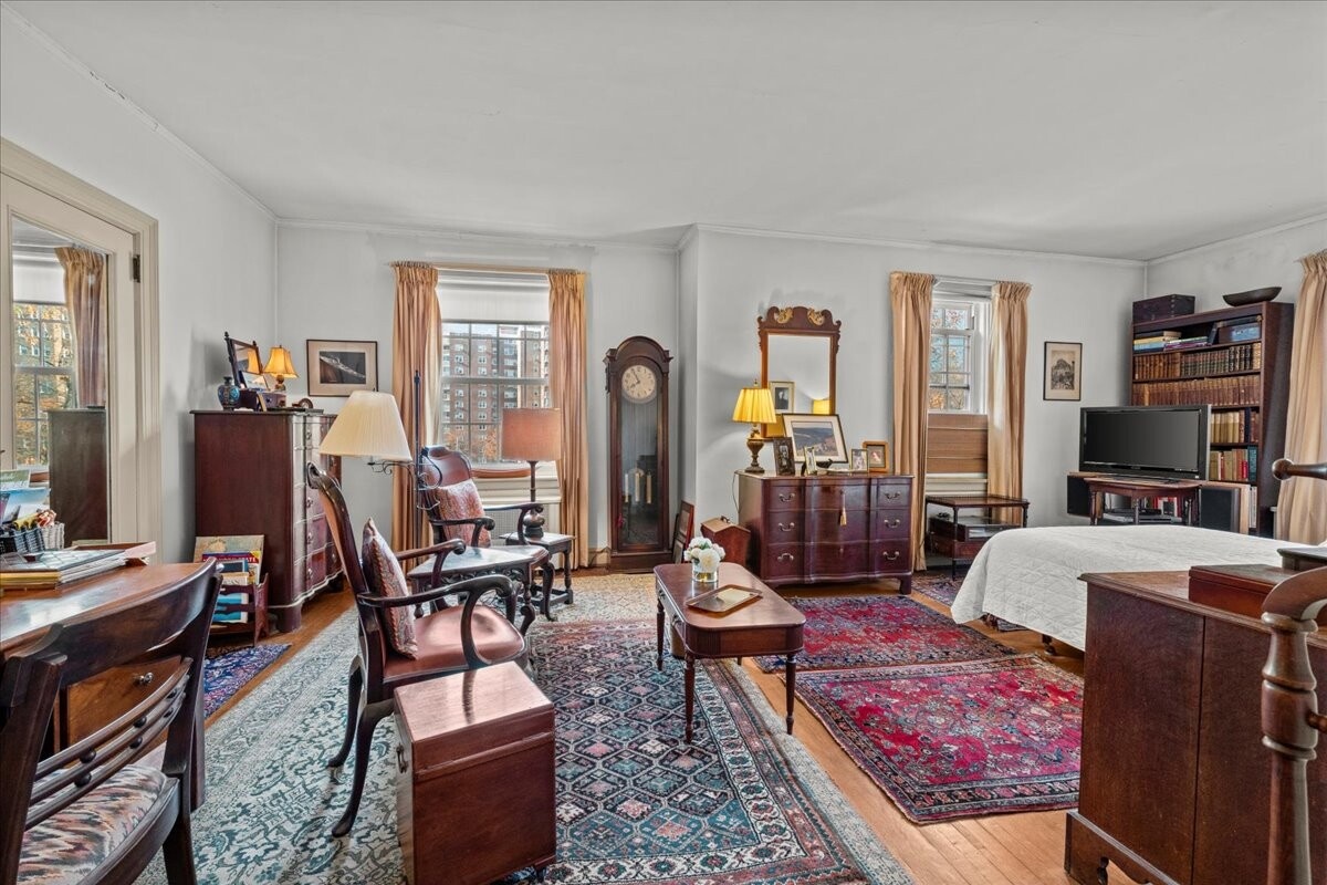 Additional amenities include nine generous closets throughout, nine-foot ceilings with crown moldings, oversized windows in every room, an in-unit washer and dryer, and a functioning dumbwaiter. The building is well-managed and 100% co-op, with a live-in superintendent. It is pet-friendly, providing convenient stroller and bike storage, dedicated storage units, beautiful gardens, and a private park for residents.