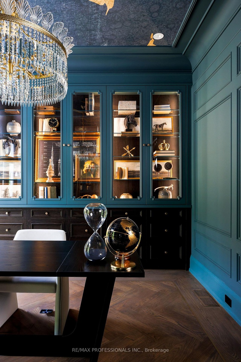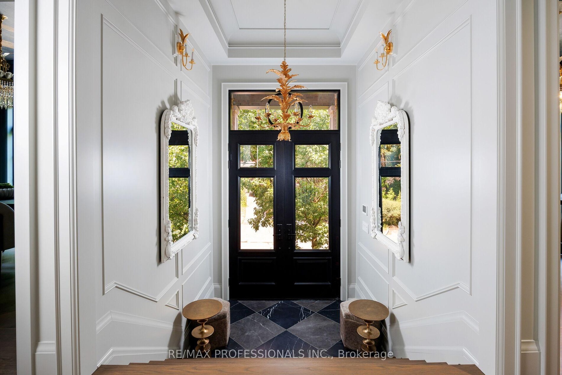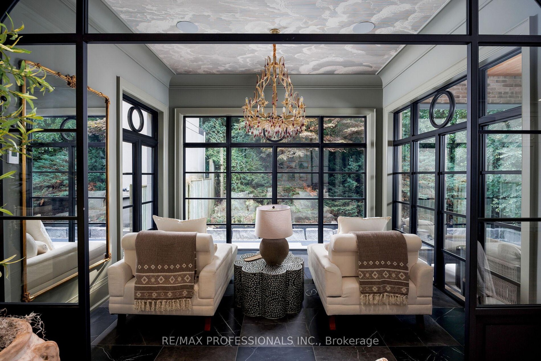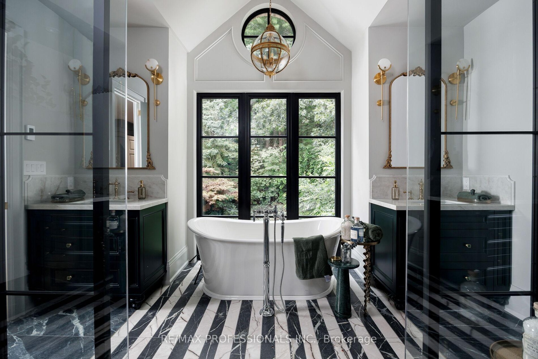 Nestled on a quiet cul-de-sac in a rare, beautiful ravine setting, this 5,000+ sq ft French-inspired estate architecturally refined by Hausworks, built by Atelier Custom Homes and designed and styled by Rizo Lola Designs offers three levels of refined luxury built with the finest curated materials. The main floor features a formal dining room, elegant office, and a stunning open-concept kitchen and family room with high-end appliances, honed quartzite & marble countertops, custom fine cabinetry, a large center island and a breakfast nook with ravine views. The family room, anchored by a limestone fireplace, flows into a sunroom overlooking the ravine. Upstairs boasts four spacious bedrooms, including a serene primary retreat with a grand walk-in closet and spa-like ensuite with oversized glass shower and heated floors. The lower level offers a wine room, wet bar, rec room with fireplace and custom built-ins, radiant heating, a fifth bedroom/office, full bath with steam shower, and gym. The exterior blends aged brick with limestone, professionally landscaped grounds, cobblestone driveway with snowmelt system, Generac generator, custom stone patio/walkway, and in-ground irrigation. Situated on an impressive ravine lot in one of the city's most prestigious enclaves, close to top schools, parks, and major routes, this residence delivers unmatched privacy, elegance, and lifestyle for the most discerning buyer.