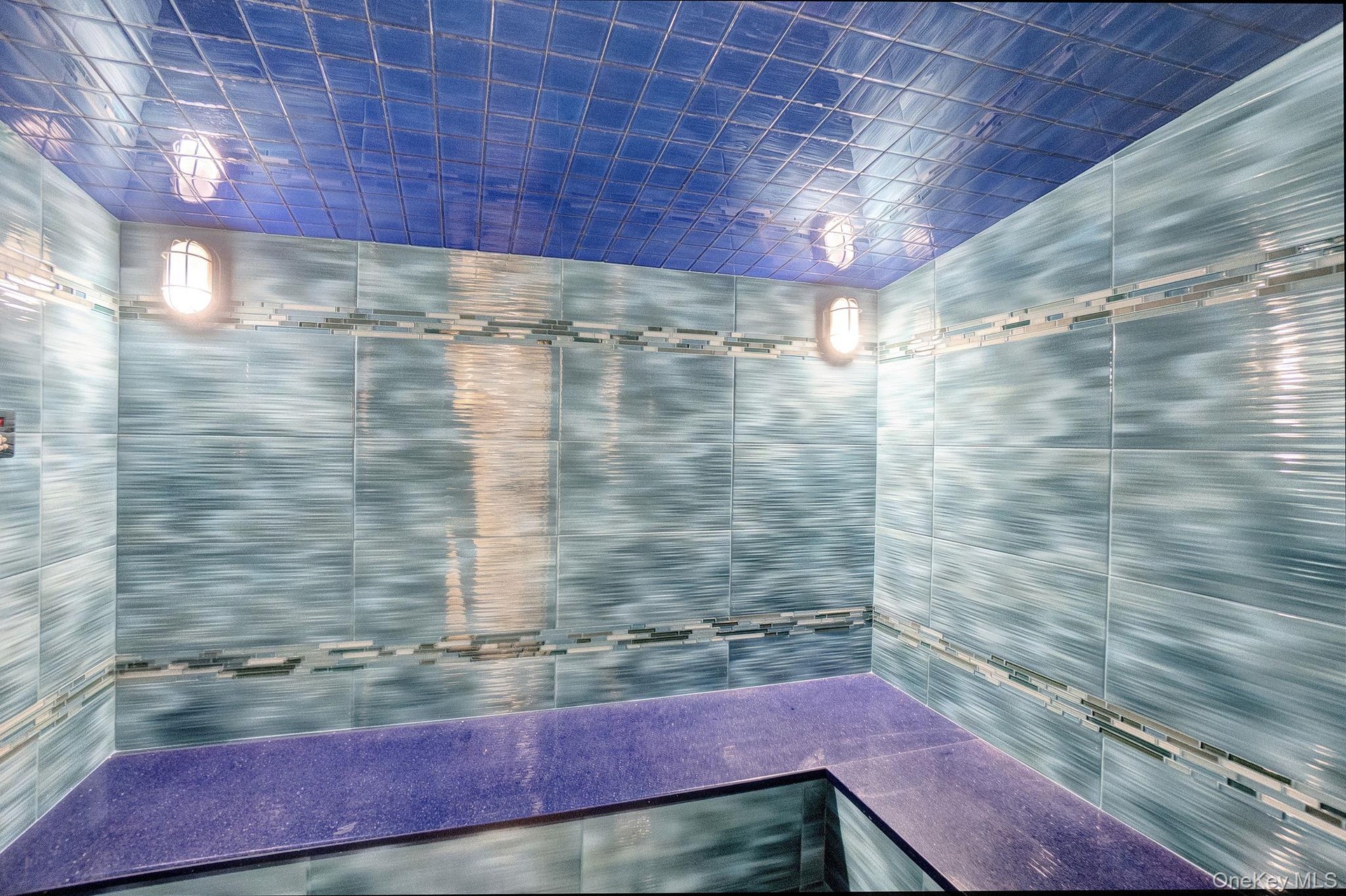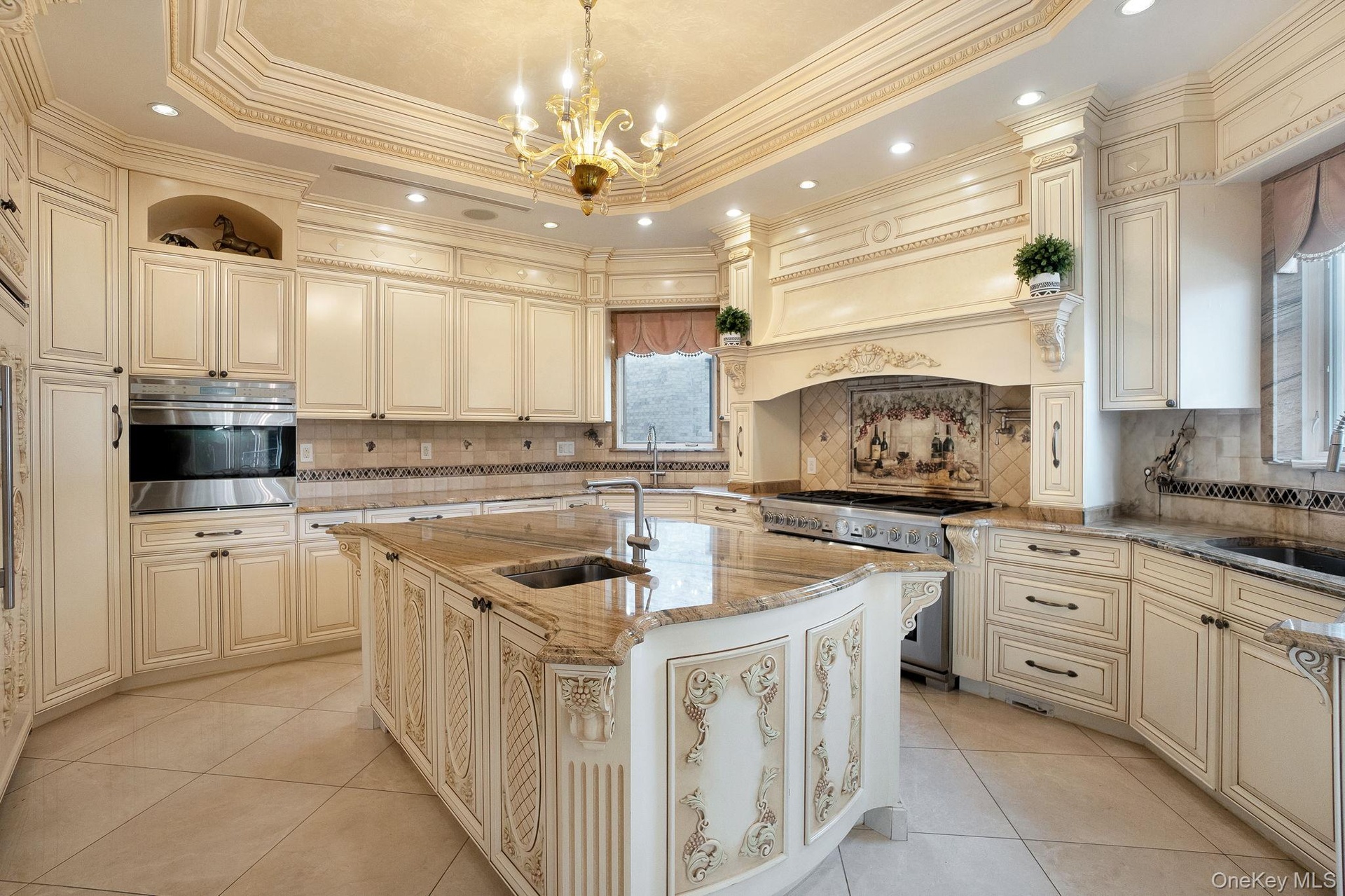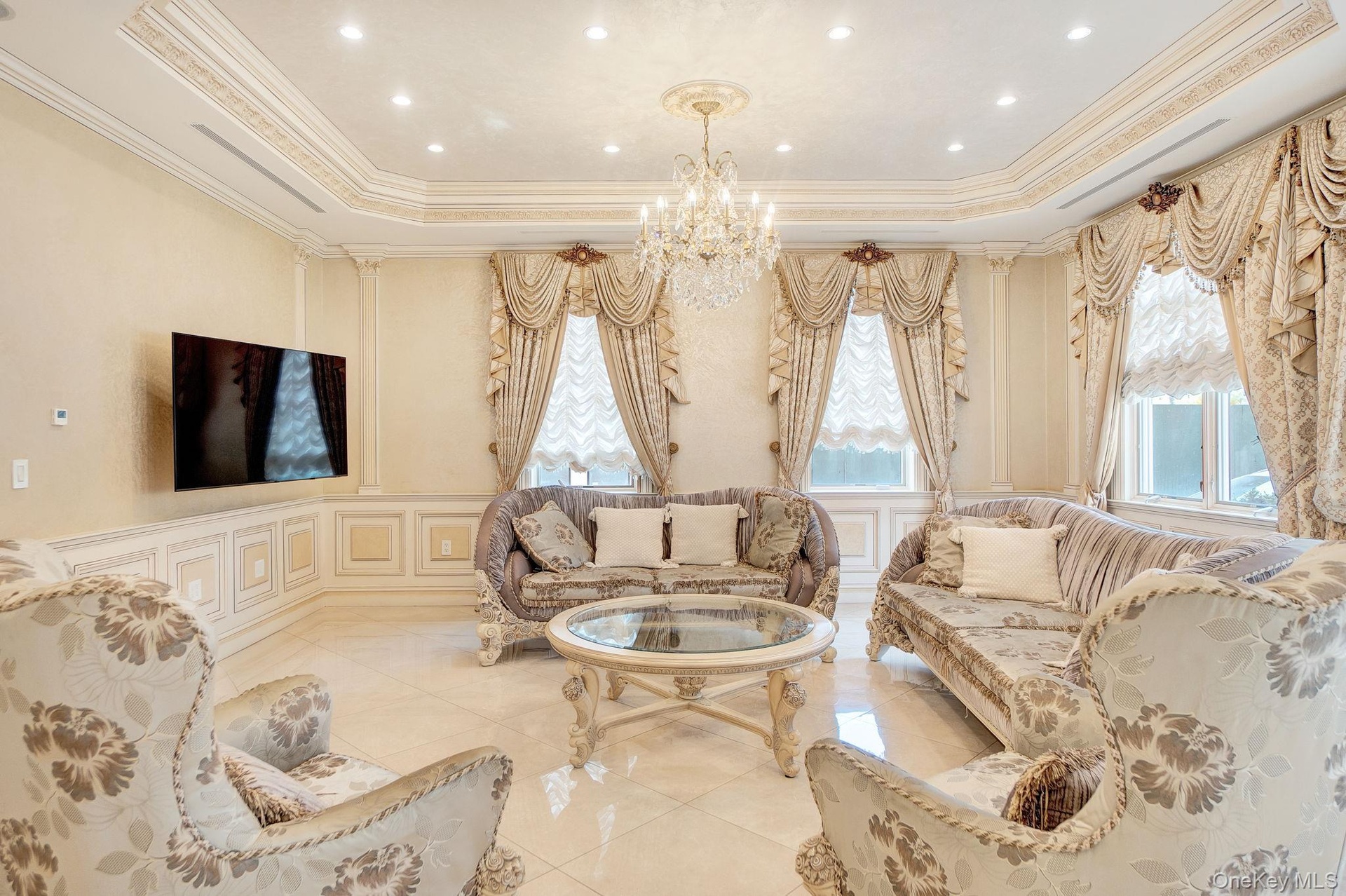 A dramatic foyer welcomes you with intricate porcelain mosaic flooring, soaring ceilings, and crystal chandeliers. Rich mahogany paneling, detailed custom moldings, and a sweeping wrought-iron staircase set an unmistakably elegant tone throughout the home.
