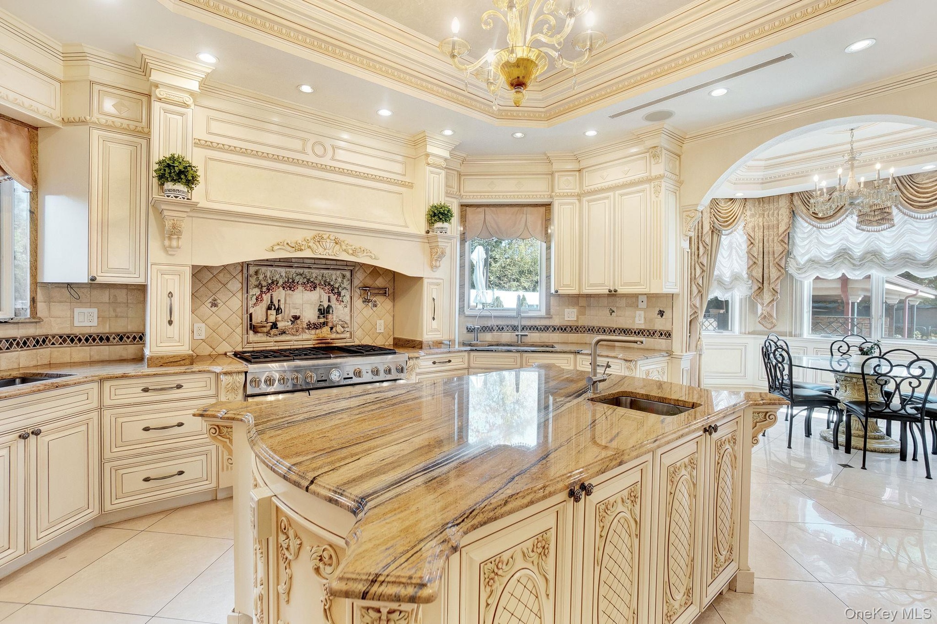 A gourmet eat-in kitchen equipped with Sub-Zero appliances, three sinks, a large center island, and an exclusive breakfast nook
