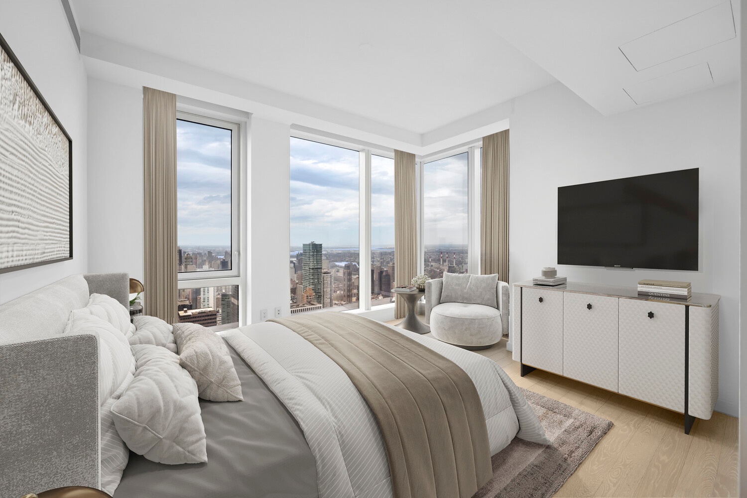 On the opposite side of the Great room are the private quarters. The private cornered primary bedroom with 10 ft floor to ceiling windows facing East and North creates a beautiful and serene retreat. The primary bedroom also has an extra-large WIC. The five-fixture primary bath offers Bianco Dolomiti radiant heated flooring underfoot, an enclosed shower, and a Victoria + Albert free-standing tub. A custom double vanity with white oak, rift-cut wood veneer millwork, and Marno Illusion countertops is completed with a built-in medicine cabinet, Kallista Sink and Dornbracht Fixtures. The two additional well sized ensuite bedrooms feature floor to ceiling windows with open views to the east, south, or north. An additional fourth bedroom can also function as an office, library, or TV room boasts stunning open views to the North and views of Central Park and beyond.