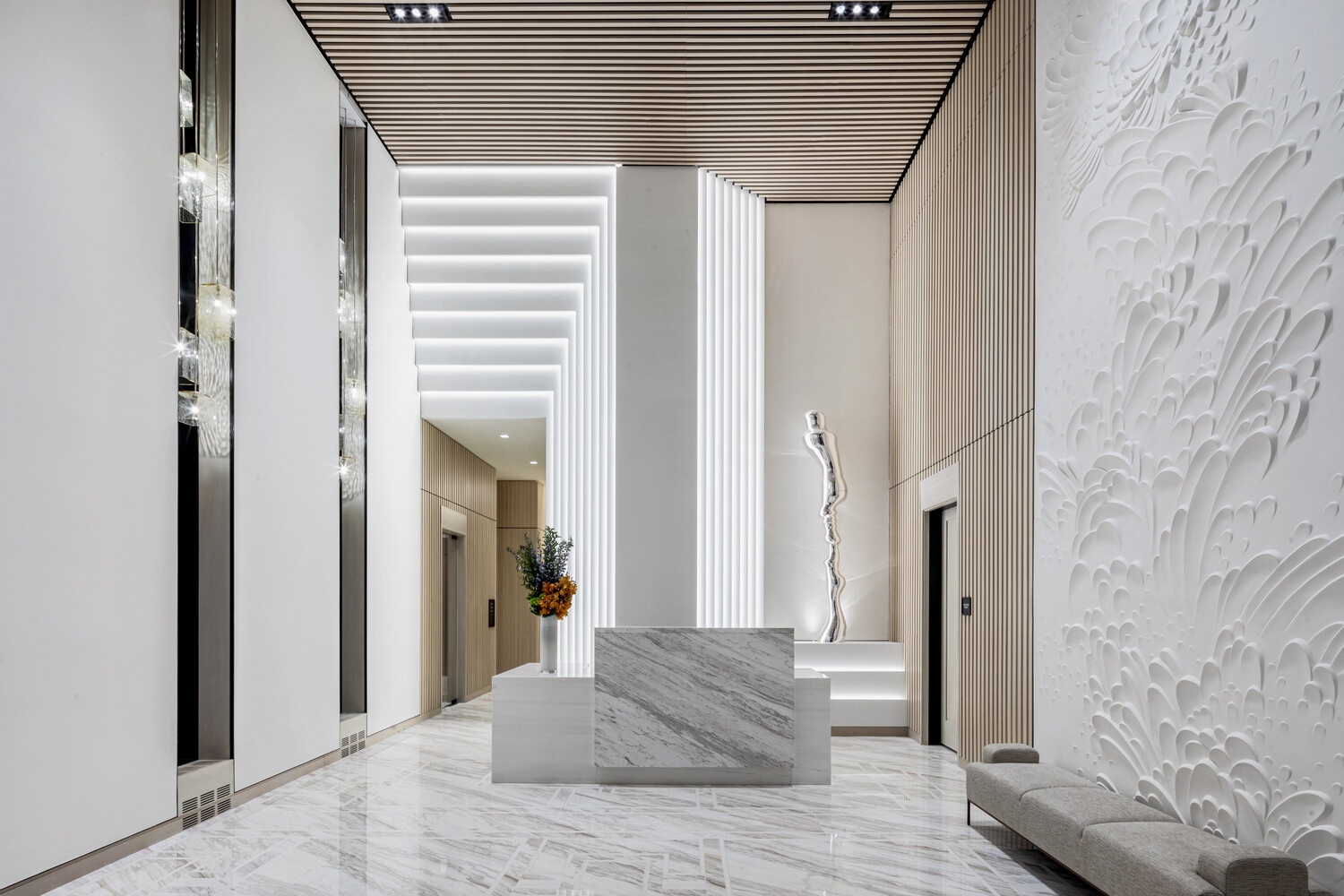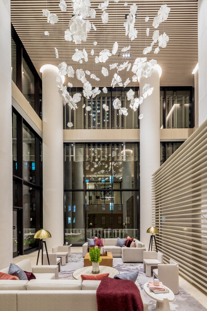 At 71 stories, The Centrale takes its place alongside Midtown Manhattan's most iconic buildings, encompassing a collection of 124 classic yet undeniably modern residences, envisioned by Champalimaud Design. The Centrale's exterior design by Pelli Clarke Pelli Architects, builds upon classic Art Deco architecture with contemporary elements thoughtfully displayed throughout, including the lightly reflective glass fa ade articulated with facets of terracotta chevrons. The Centrale reveals its base, body, and crown from street to the sky with crystalline switchbacks, creating a dynamic rhythm of angled reflections of the surrounding Midtown landscape.