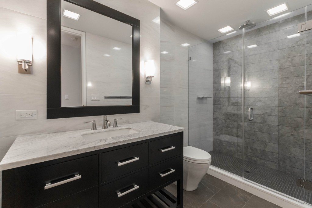 An open chefs kitchen is outfitted with Bosch appliances, a large island and custom cabinetry. There are two quiet bedrooms with walls of closets, big windows and en suite baths. Temperature is controlled by central AC and forced air heat pump.