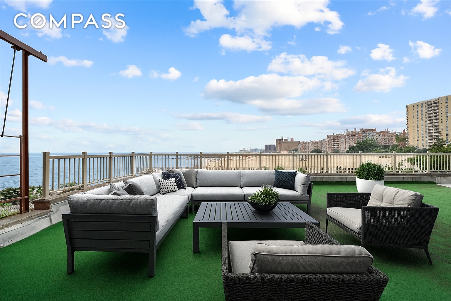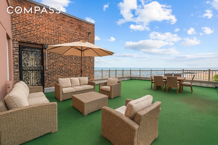Every window in this home faces the ocean, filling the space with natural light and unobstructed coastal views. The layout features a king-sized primary bedroom, a generously sized second bedroom, a windowed eat-in kitchen, and a separate formal dining room. The spacious living room opens directly to a truly one-of-a-kind feature: your own 22' x 29' private terrace — the perfect canvas for an outdoor lounge, garden, or entertaining area with the sound of waves in the background.