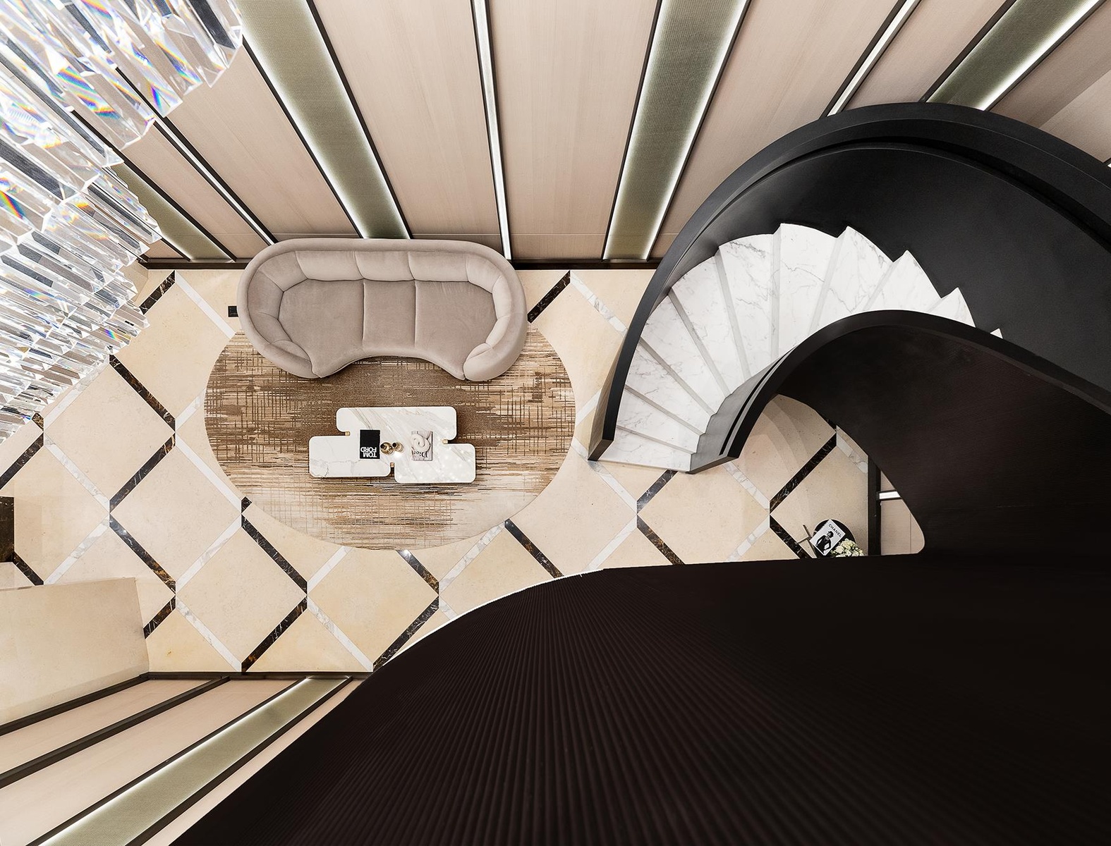 The open living room boasts large windows overlooking the surrounding treetops, providing a serene ambiance filled with natural light. The kitchen is designed for both function and style, featuring Crema Delicato marble counters with a waterfall edge, white matte lacquer cabinets by Aster Cucine, and top-of-the-line Gaggenau appliances.