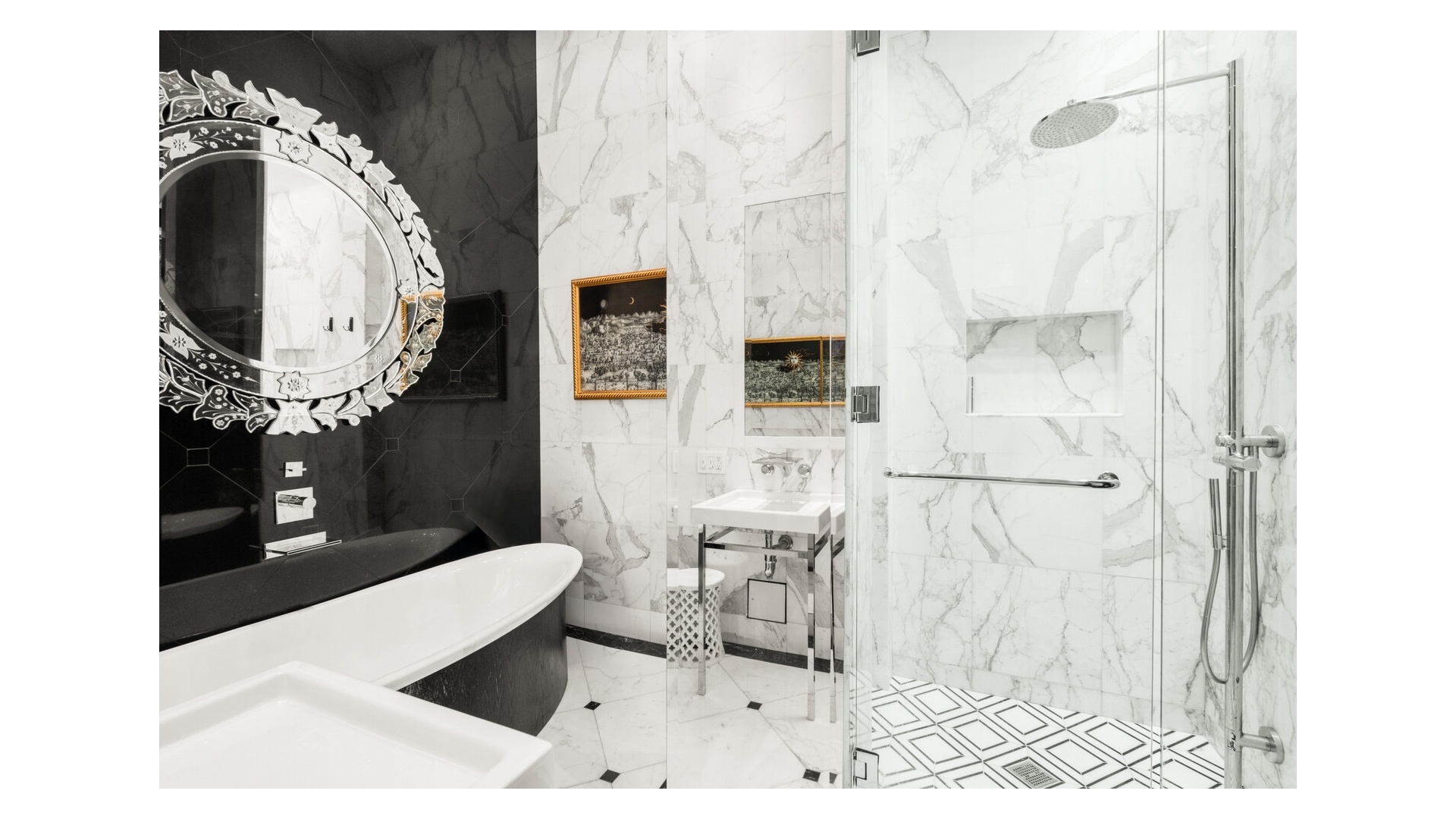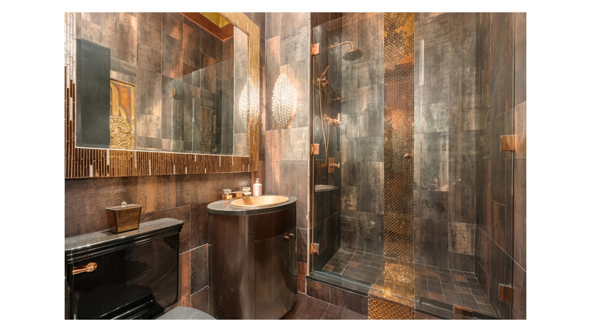 Brilliant recessed lighting and nine-foot south-facing windows-draped in custom silk theater curtains-bathe the home in warm natural light throughout the day.Every detail reflects artistic intention and mid-century sophistication: Venetian-plastered walls, Bisazza tile mural, and curated art and photography that transform the space into a private exhibition. Living & DiningA custom floor-to-ceiling mirrored divider defines the living and dining zones without interrupting flow.