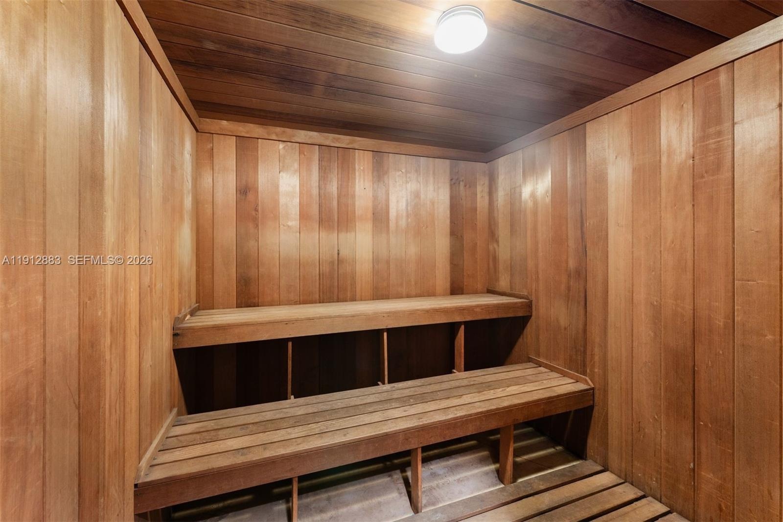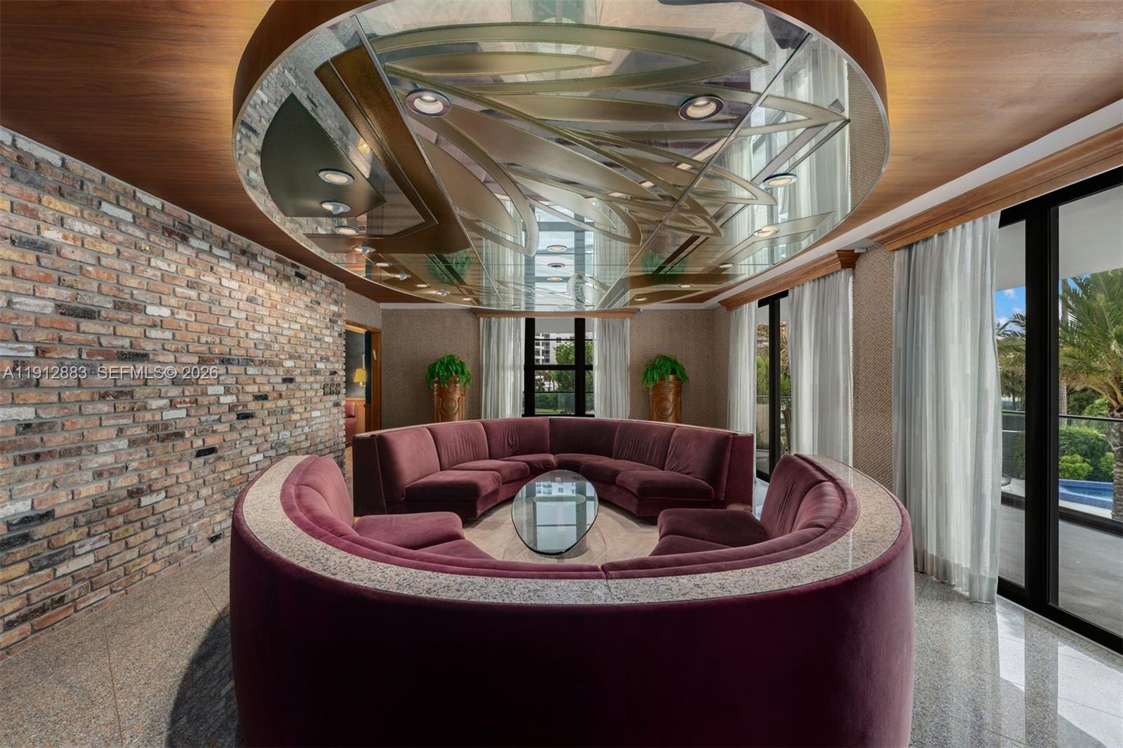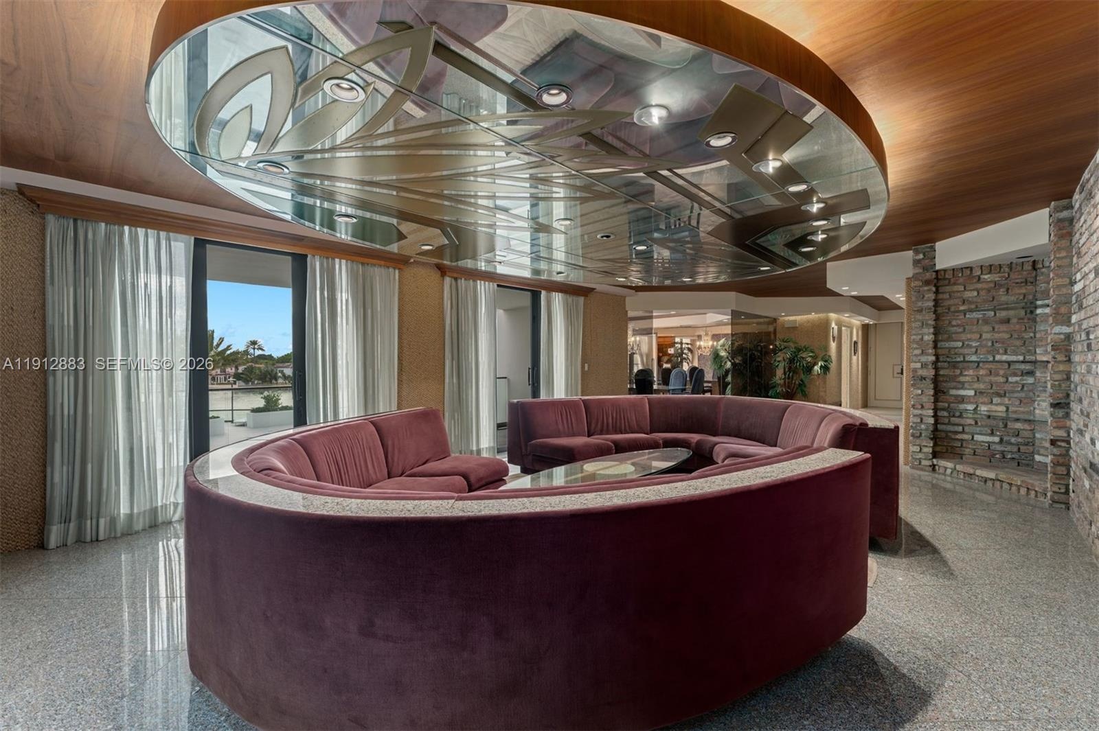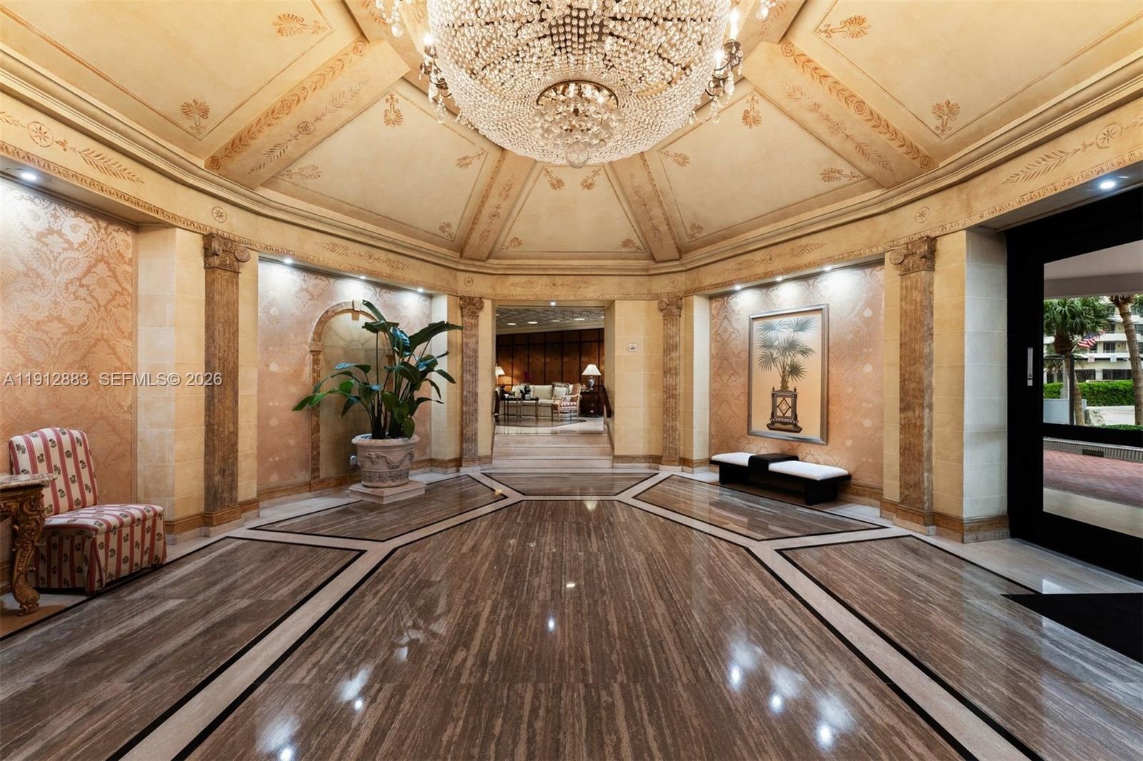 Corner unit in immaculate condition showcasing beautiful millwork, rich wood, and a Retro Miami Glam style, with stunning Intracoastal views overlooking the pool. The spacious living area opens to the wraparound balcony and flows into the dining room and kitchen, all capturing water views. Just off the kitchen is an in-unit washer and dryer, and a generous library/den with a wet bar adds great flexibility. The primary suite offers two walk-in closets and dual bathrooms, while the second bedroom features its own ensuite bath, along with a separate powder room for guests. Additional private storage is located outside the front door. The building features outstanding amenities, including a waterfront pool, tennis courts, a club room, gym, sauna, and an on-site restaurant.
