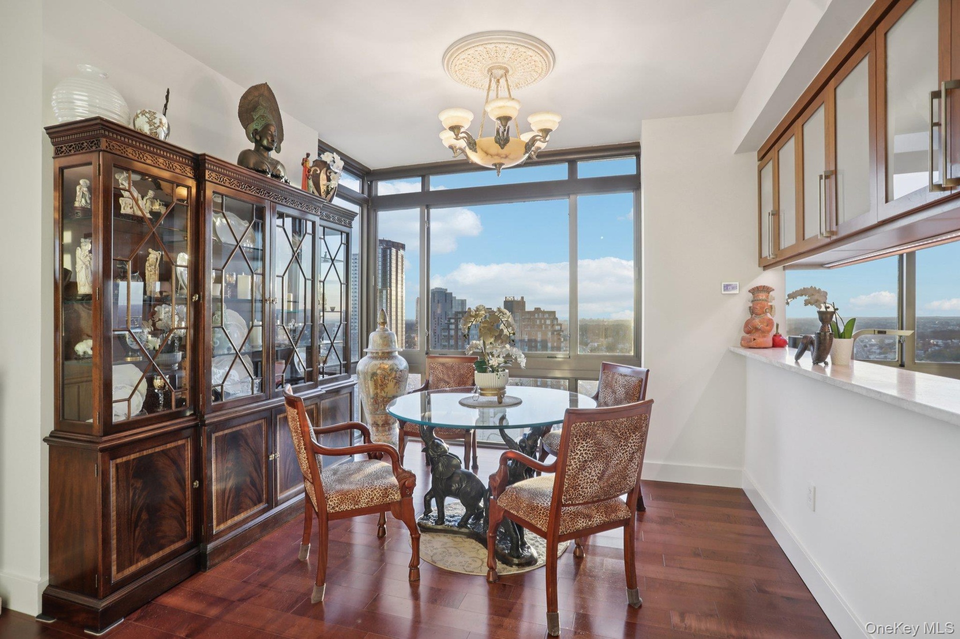 Unquestionably the finest home and the largest of the two Bed Room layouts available in Trump Plaza. This stunning corner unit is perfectly situated for panoramic views of the Long Island Sound and the Manhattan skyline. With 9 ft. floor to ceiling windows you will feel as though you are living in a glass house in the sky! Renowned Trump luxury and amenities, terrific urban conveniences and elegant city life complete the package for this fine home. Beautifully updated throughout, this move-in–ready home features new engineered wood flooring, fresh paint, modern lighting, solar shades, smart thermostats, and upgraded HVAC units. The living and dining areas feel bright and open, complemented by LED recessed lighting and updated fixtures.