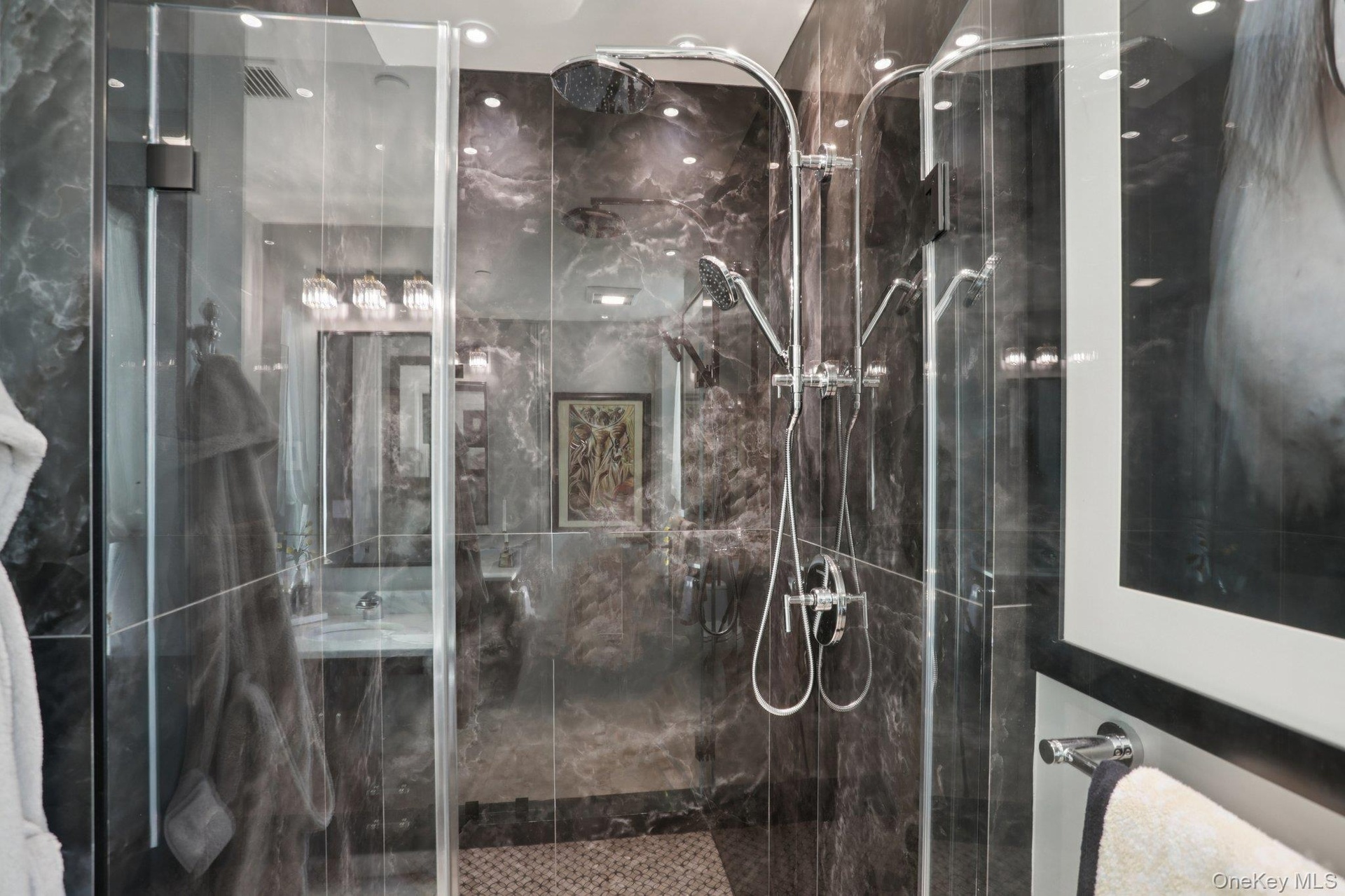The kitchen was fully remodeled with porcelain floors, high-end cherry wood cabinetry, quartzite countertops and backsplash, under-cabinet lighting, a redesigned soffit, and premium stainless-steel appliances, including a 30-inch range, four-door refrigerator, dishwasher, and stainless/glass hood. Both bathrooms have been completely renovated with floor-to-ceiling porcelain tile, premium glass enclosures, new vanities, upgraded fixtures, recessed medicine cabinets, LED lighting, new exhaust fans, and modern switches. The secondary bathroom includes heated floors, while the primary features a cast-iron tub with quartz surround and double sinks. Additional upgrades include new smoke detectors, pocket doors, new HVAC in multiple rooms, and thoughtful finishes throughout. Parking is optional and not included with the purchase of the unit. Monthly cost is $208 per car.