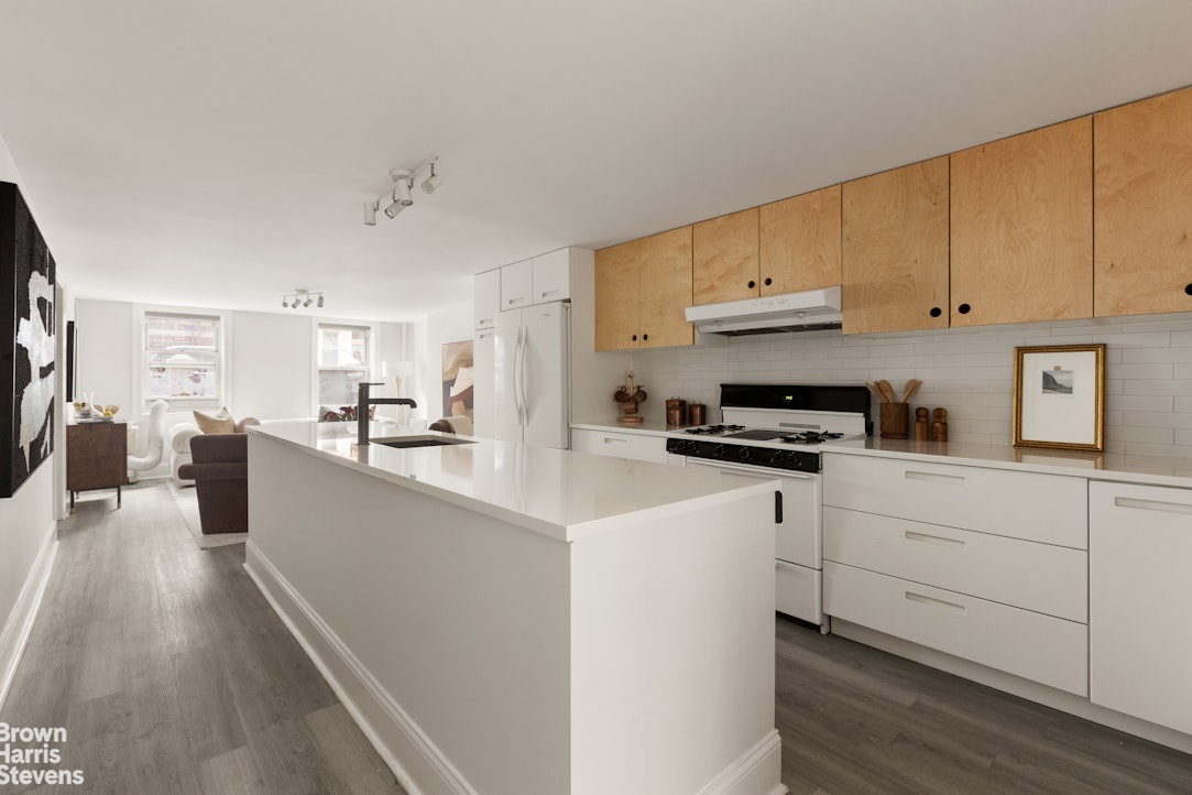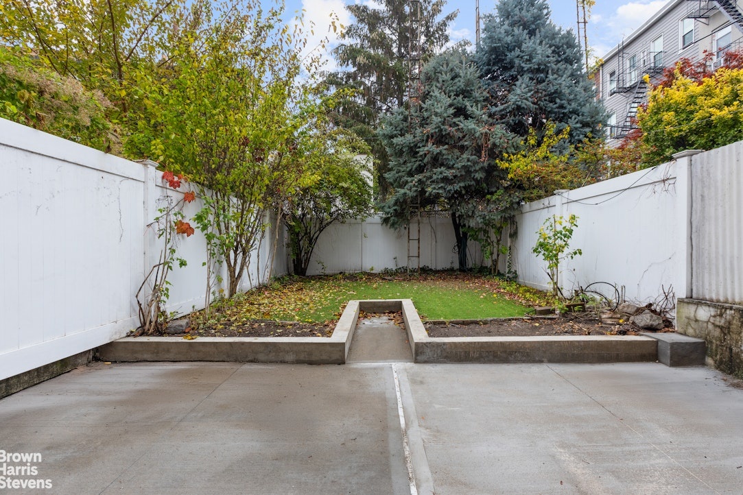 The garden level welcomes you with an expansive, open-concept layout designed for modern living. The living and dining areas flow seamlessly into a beautifully renovated chef's kitchen, featuring custom plywood cabinetry, Caesarstone quartz countertops, and a full suite of stainless-steel appliances including a gas range with hood, refrigerator, dishwasher, and dual wine coolers. Beyond the kitchen, a formal dining room opens to the private backyard oasis-complete with a patio, AstroTurf lawn, and raised planter beds. A laundry room and full bath complete this level.