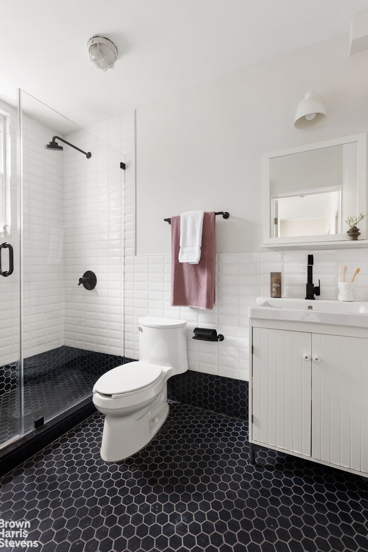 Upstairs, two bright and airy bedrooms share access to a spacious central room, ideal for a media area, home office, or play space. The front bedroom enjoys a wide footprint, while the rear bedroom offers access to a private den. A beautifully finished bathroom with white beveled tile, matte black fixtures, and mosaic flooring adds a touch of modern refinement.