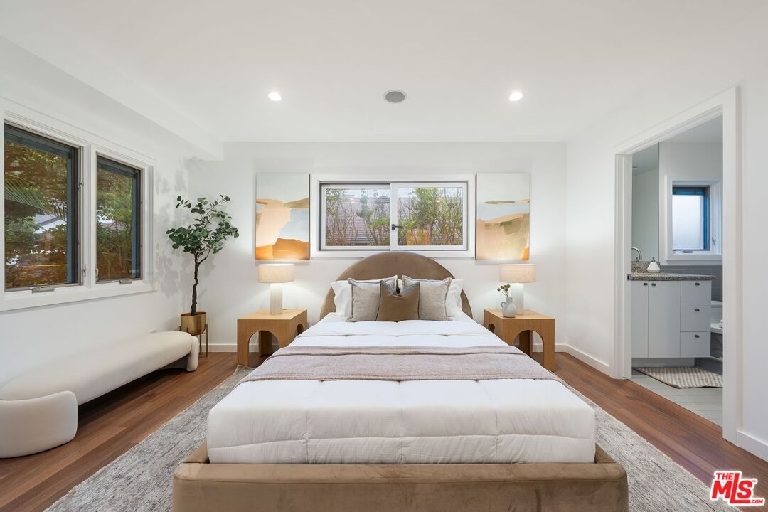 Tucked away in Brentwood Hills, this traditional single-story residence captures sweeping vistas of the surrounding canyons, the Getty Museum, and the city beyond. Designed for seamless indoor-outdoor living, sliding glass doors frame the rolling canyon vistas, creating the perfect blend of traditional comfort and contemporary lifestyle. Kenfield Avenue is one of the most desirable streets in the area as it sits on a cul-de-sac, making it safe for families and children, as well as private with no through traffic. A large family and living room welcomes you, framed by serene views of the pool and views through expansive glass doors. The living room is anchored by a cozy fireplace and opens effortlessly to the dining area, which also provides outdoor access. The dining area connects to the kitchen and includes bar seating, perfect for everyday living or entertaining guests. The kitchen features quartz countertops, a Sub-Zero refrigerator, stainless steel appliances, custom cabinetry, and convenient access to a separate laundry room with its own sink. A powder room is located nearby for guests. A separate spacious den, currently used as an office, adds versatility to the home and includes its own outdoor access. The primary suite is spacious, with vaulted ceilings and corner windows capturing some of the best views in the home of the surrounding hillsides. Sliding glass doors provide direct access from the primary suite to the outdoors. The primary spa-like bathroom features dual vanities, a soaking tub, a frameless glass shower, and generous storage including a walk-in closet and additional hallway closets. Two additional bedrooms, each with en suite bathrooms, complete the interior. Outside, panoramic views and ample patio space make for a serene setting to relax, unwind, or enjoy alfresco dining by the large kidney-shaped pool. The home also includes a large driveway, an attached two-car garage, secure side and backyard access, and built-in 5.1 surround sound speakers throughout. Just minutes from all that Brentwood and the Westside have to offer, turnkey homes with views like these are rare to find.