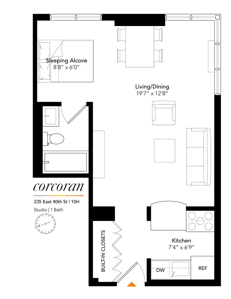 This is a charmingly FURNISHED corner alcove studio filled with incredible features: East and South exposures with amazing city views and delightful light through the large windows; the chef's kitchen is equipped with stainless steel appliances, granite countertops, breakfast bar, and ample oak cabinet storage; the modern bathroom with soaking tub, ceramic tile, marble top vanity; high ceilings and ebony tinted hard-wood floor throughout.