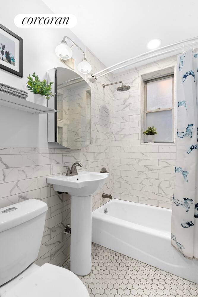 The classic windowed kitchen features white cabinets and brand new stainless steel GE and Frigidaire appliances, and ample storage. Not to mention an abundance of counter space to work with. The bathroom was recently gut renovated, featuring upgraded modern tiling and fixtures, custom storage solutions, and honeycomb floor tiling.